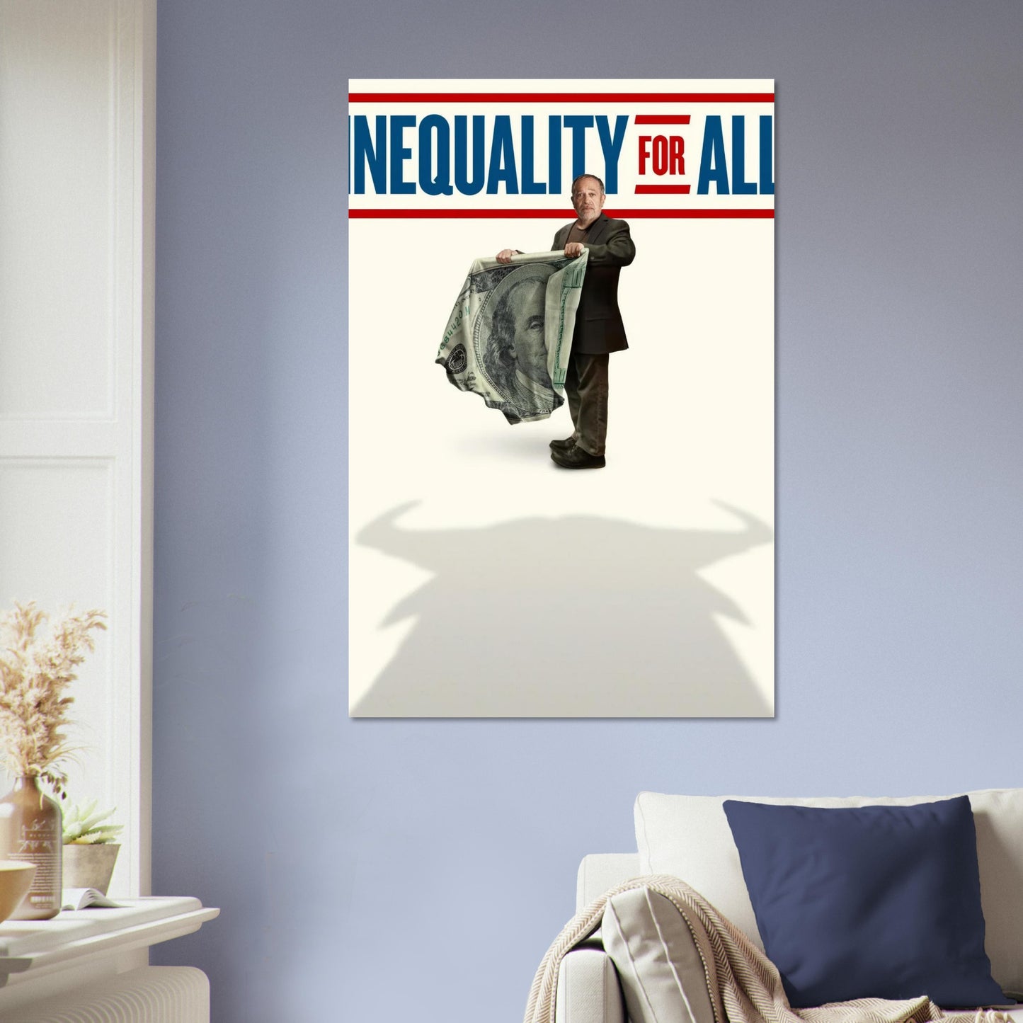 A striking political documentary poster featuring a figure holding an oversized $100 bill against a stark white background. Bold red and blue typography creates a powerful statement about economic disparity. The shadow adds dramatic depth, creating an impactful social commentary piece perfect for office or study walls