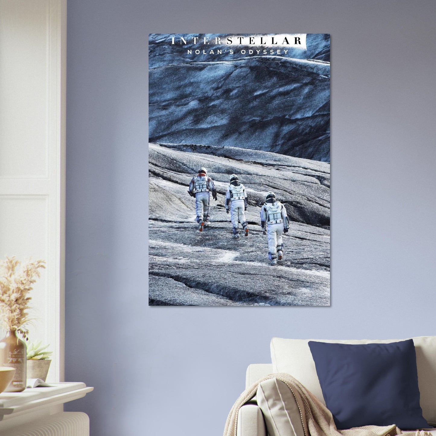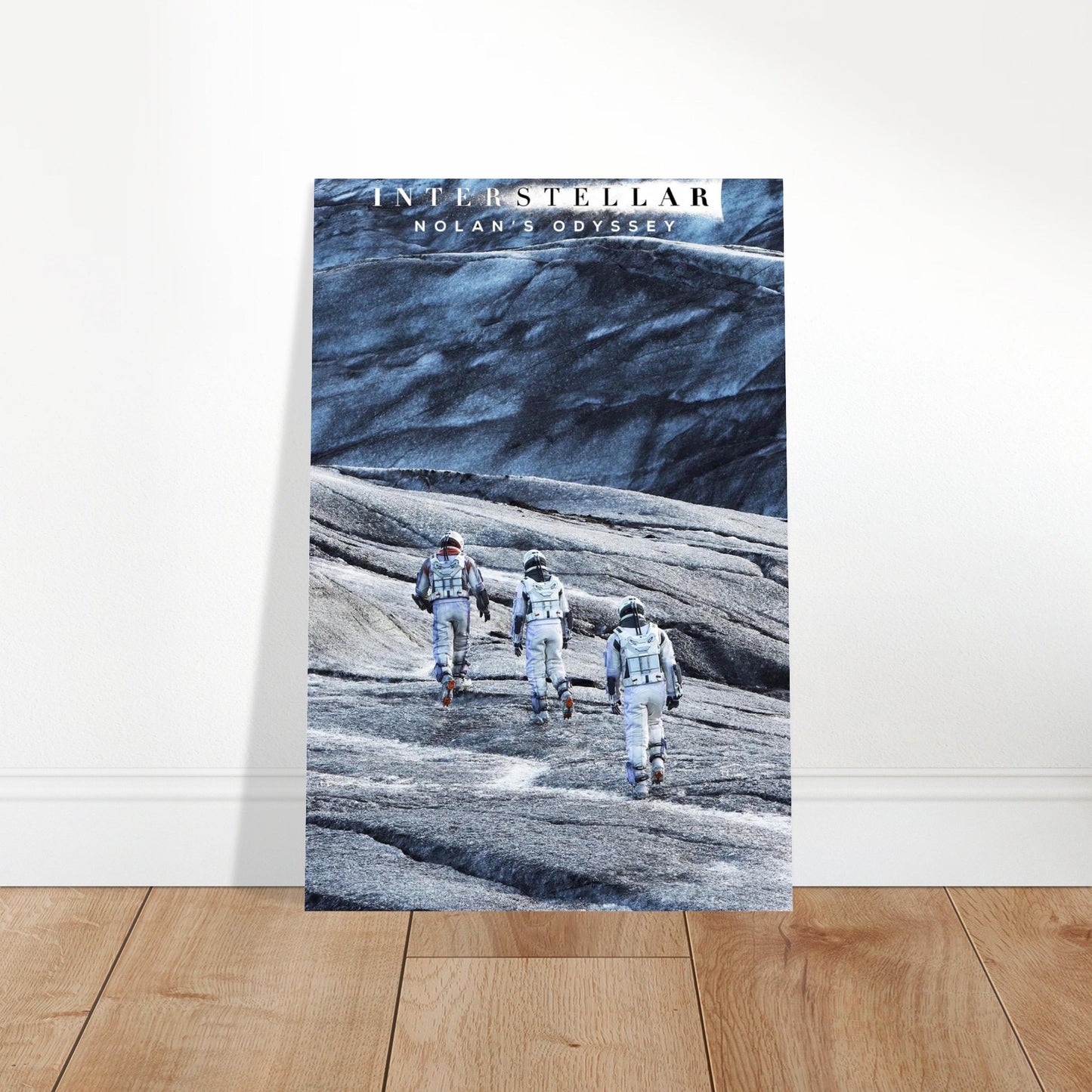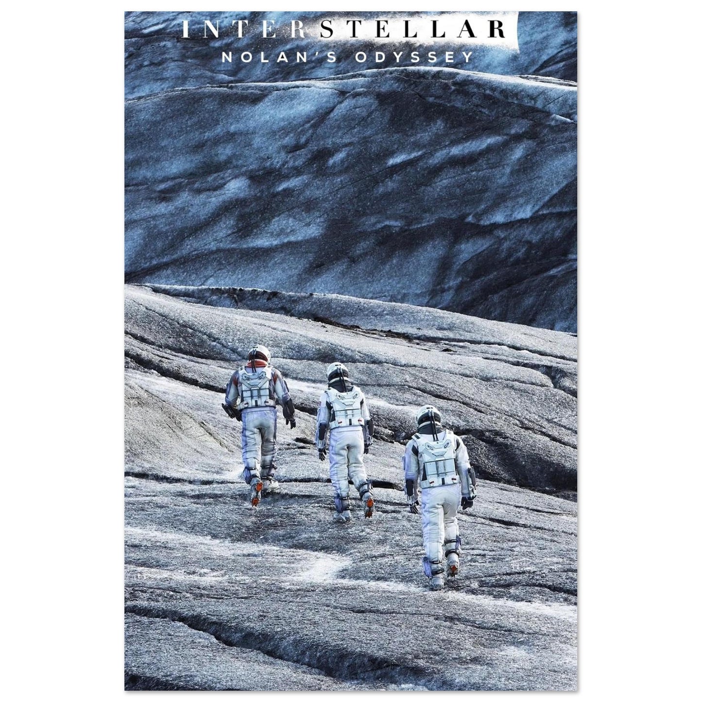 A dramatic cinematic scene capturing astronauts traversing an icy, otherworldly landscape. The stark contrast between white spacesuits and the blue-grey terrain creates a striking visual composition. The image conveys themes of exploration, adventure, and the vastness of space through its epic visual scale and atmospheric mood