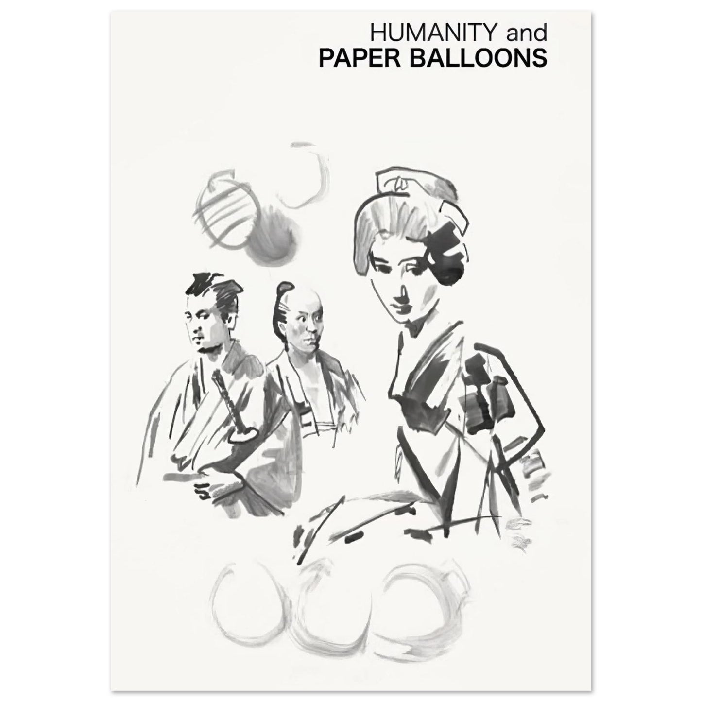 Elegant black and white ink illustration capturing traditional Japanese figures in a minimalist brushstroke style. Features graceful figures rendered in fluid brush strokes with paper balloon motifs. The monochromatic artwork combines classical Eastern aesthetics with modern artistic expression, creating a sophisticated and contemplative piece