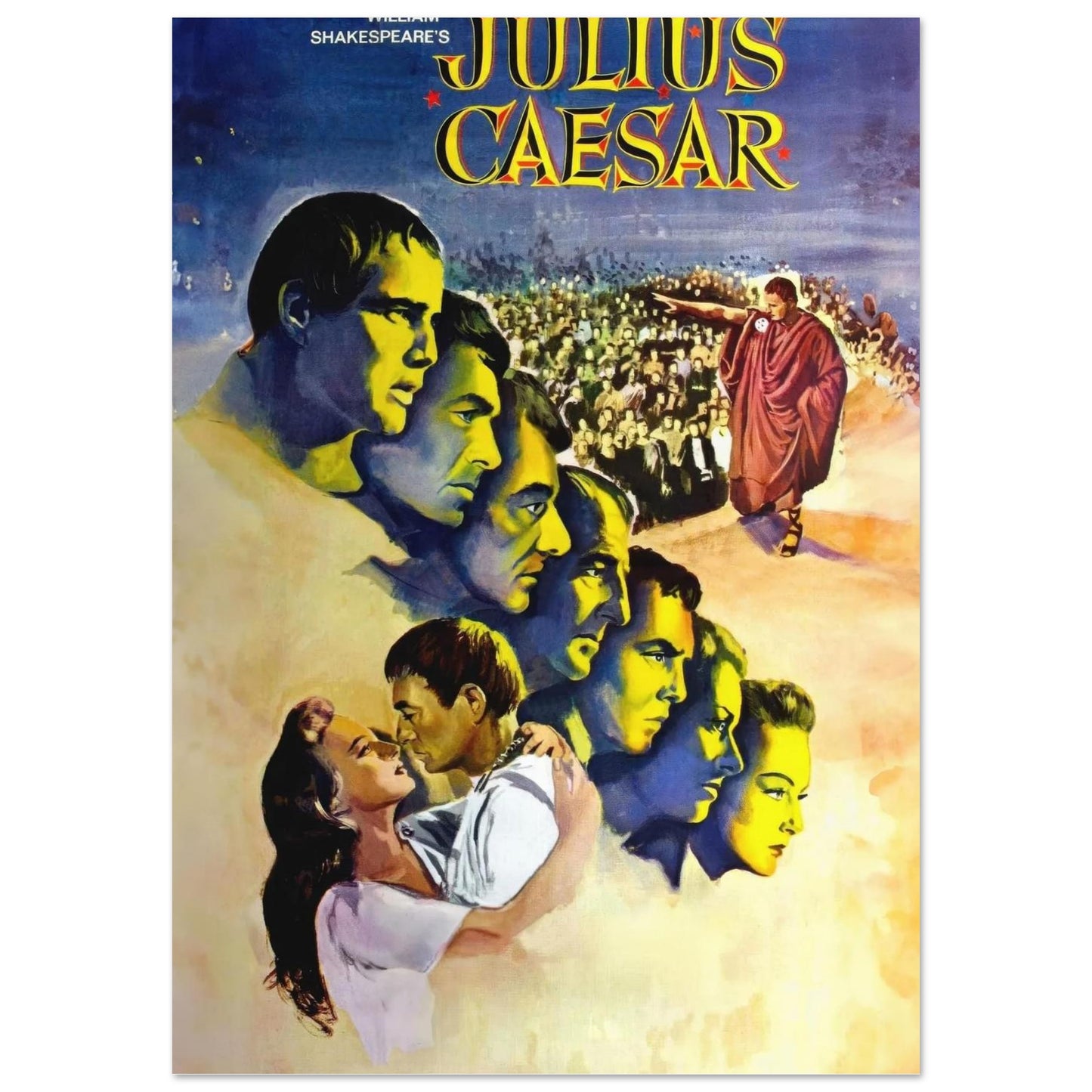 A dramatic vintage movie poster showcasing Shakespeare's Julius Caesar. Features striking yellow and blue tones with multiple profile portraits arranged in a cascading design. The composition includes a dramatic Roman scene with crowds and a figure in a red toga. Classic 1950s theatrical promotional artwork that captures the epic scale of this timeless drama