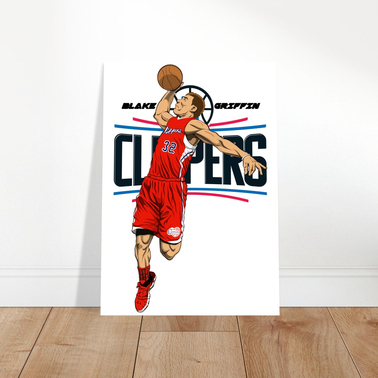 Dynamic cartoon art featuring a basketball player in a red Clippers uniform making a dramatic slam dunk. The stylized illustration captures the explosive athleticism and energy of professional basketball with bold red, white, and black colors. The design incorporates classic sports art elements with modern graphic styling