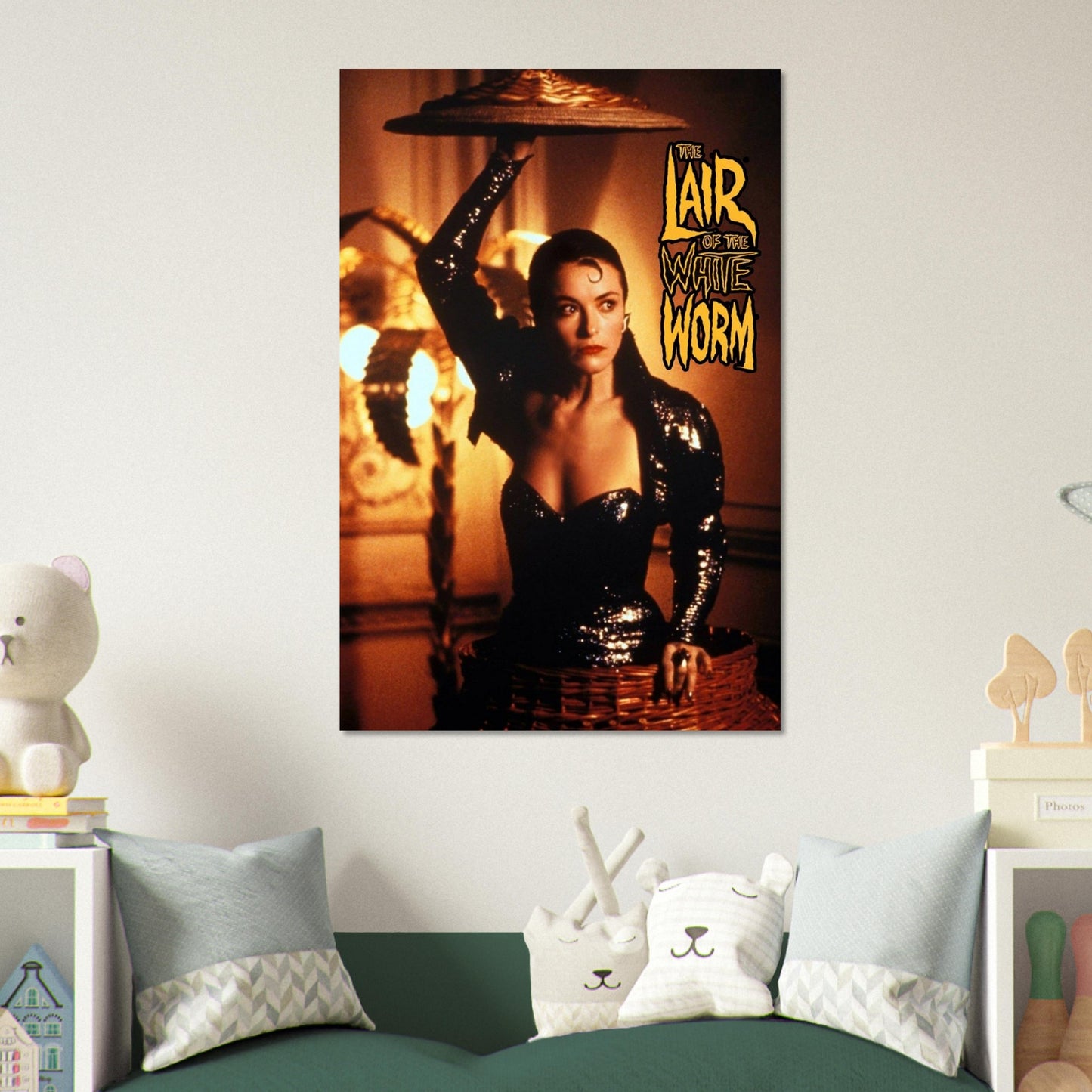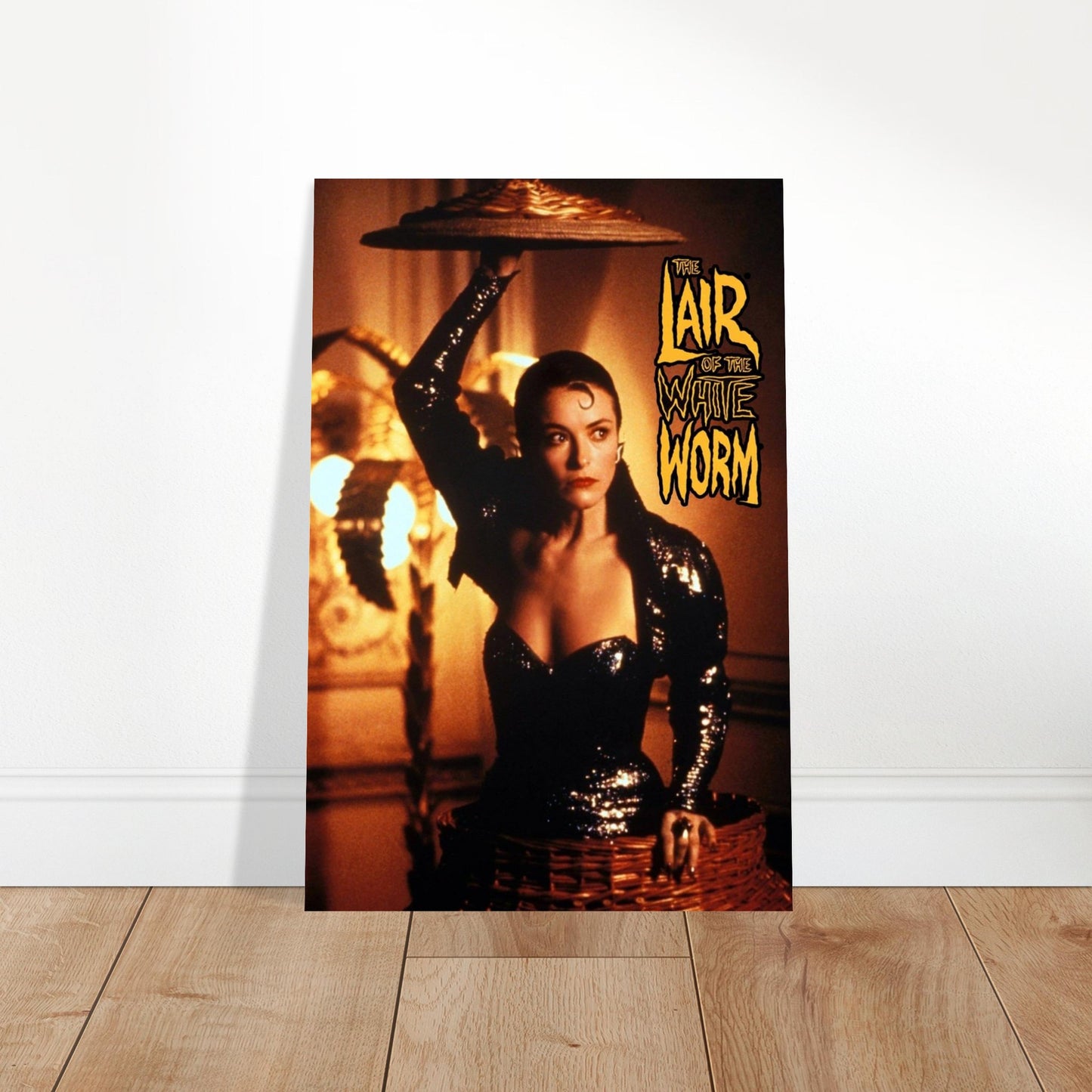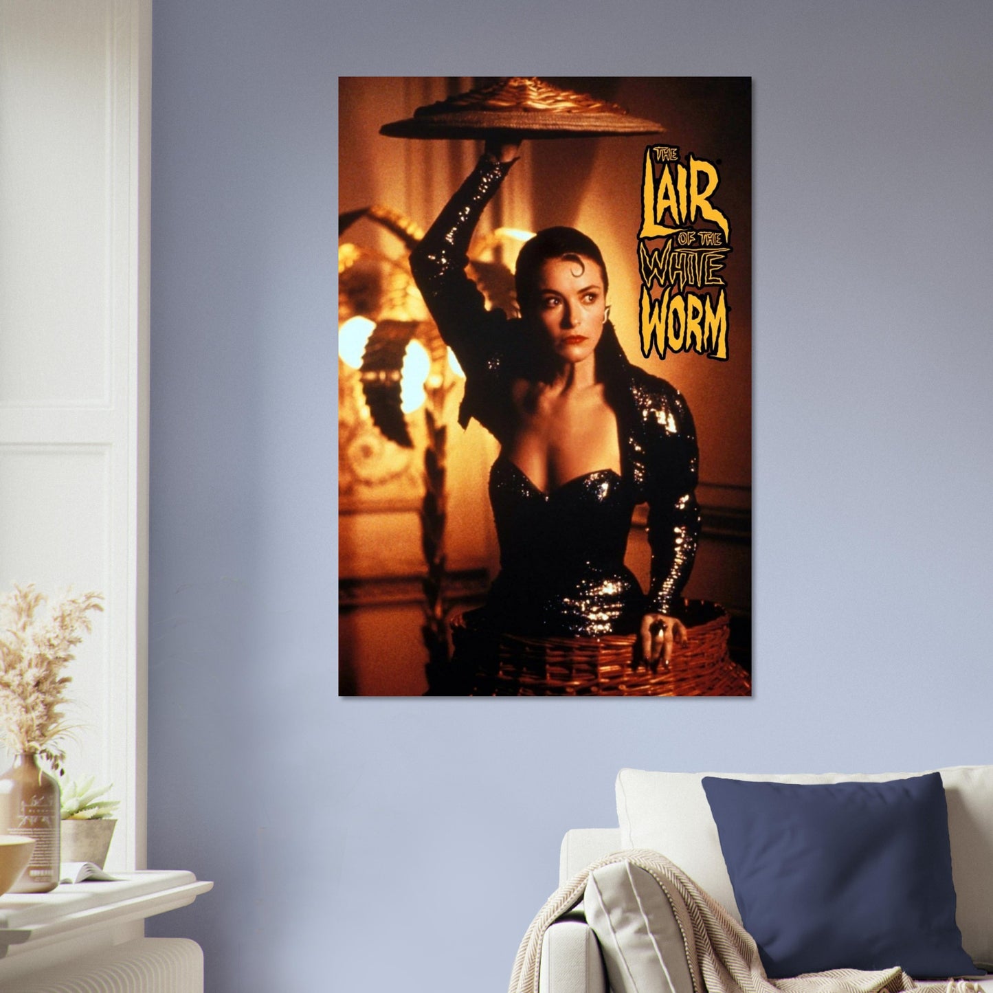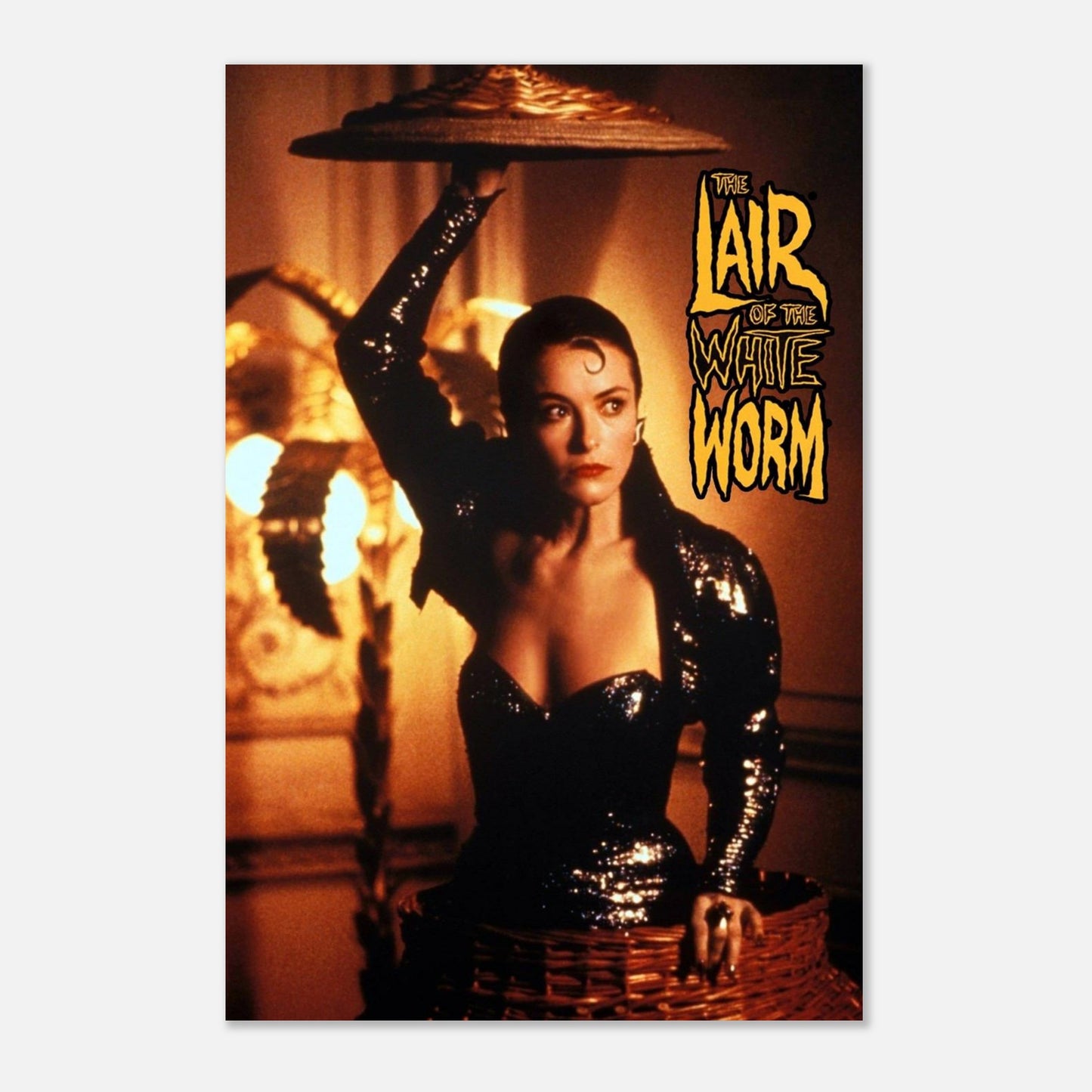 A dramatic vintage horror movie poster featuring a glamorous figure in a shimmering black evening gown, posed with an exotic parasol against a warm golden backdrop. The striking title typography and mysterious atmospheric lighting create an alluring blend of elegance and horror