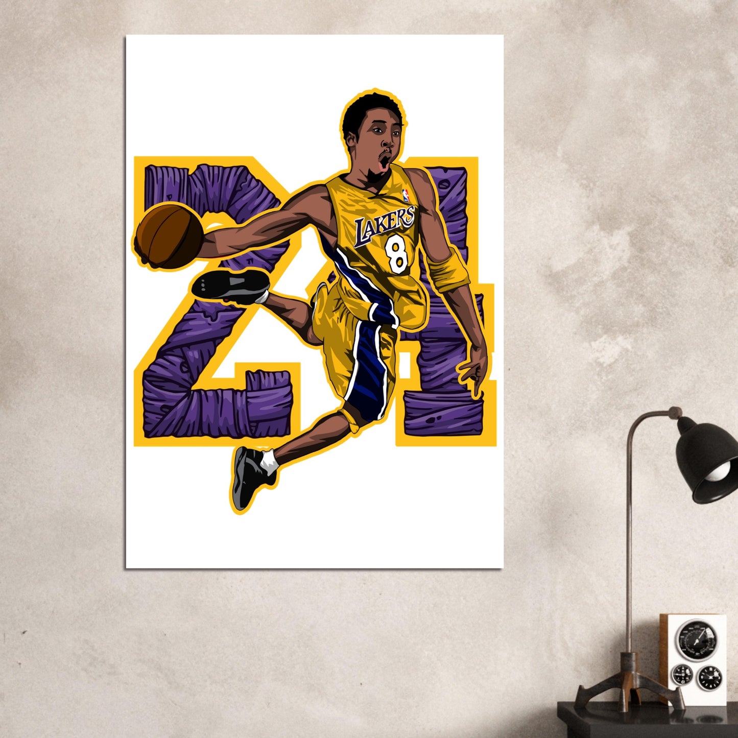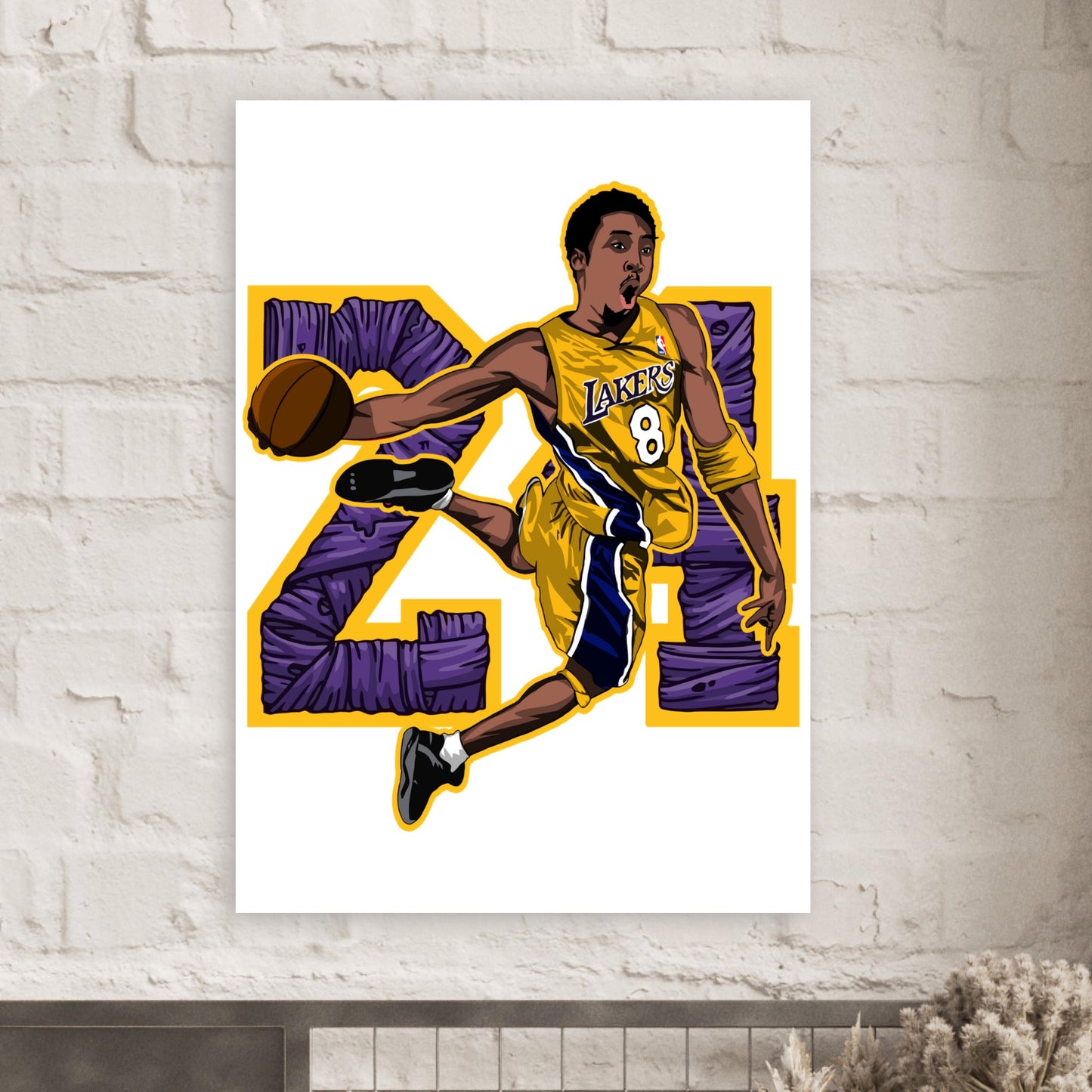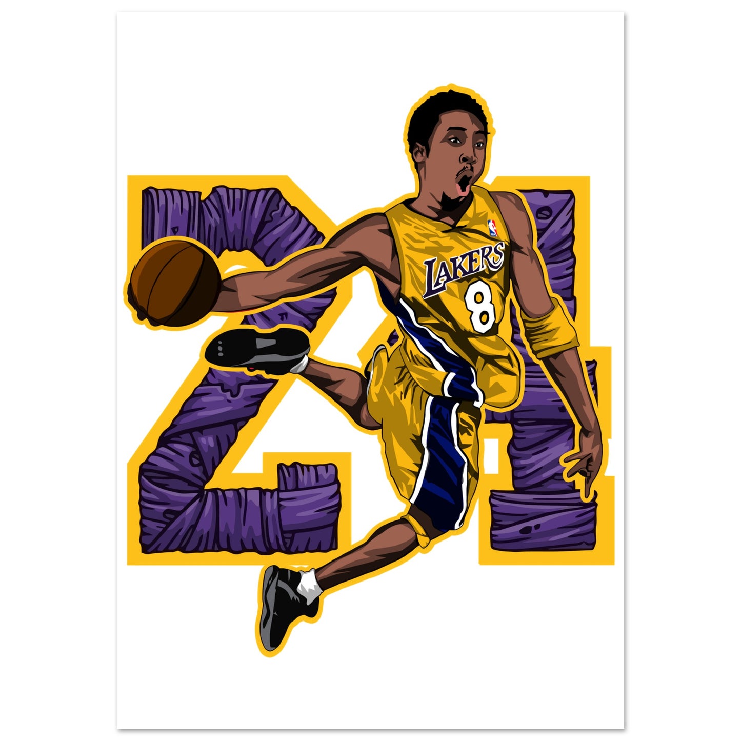 Dynamic illustration featuring a basketball player in the iconic Lakers yellow jersey, set against a stylized number 24 background in purple. The artwork captures the energy and motion of a powerful dunk with bold lines and vibrant team colors. Perfect for sports fans and basketball enthusiasts