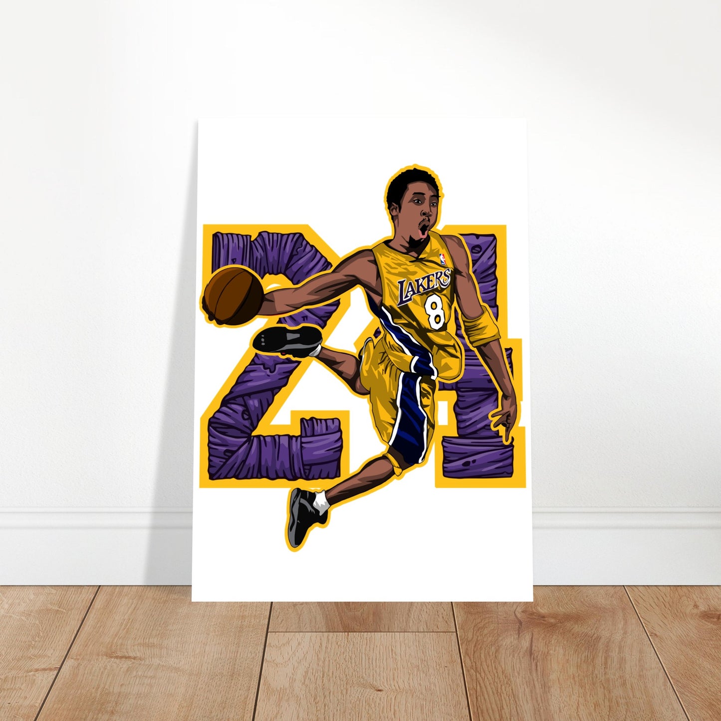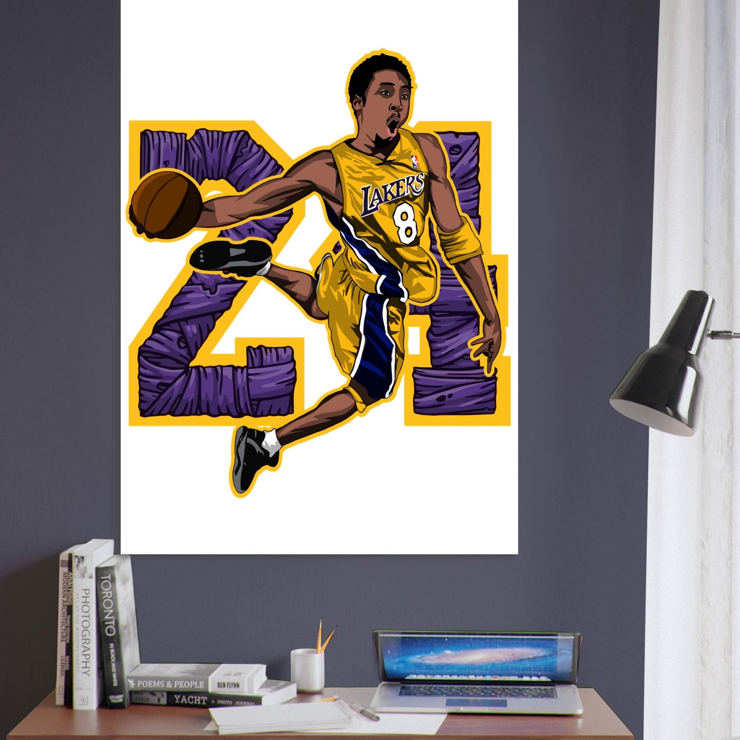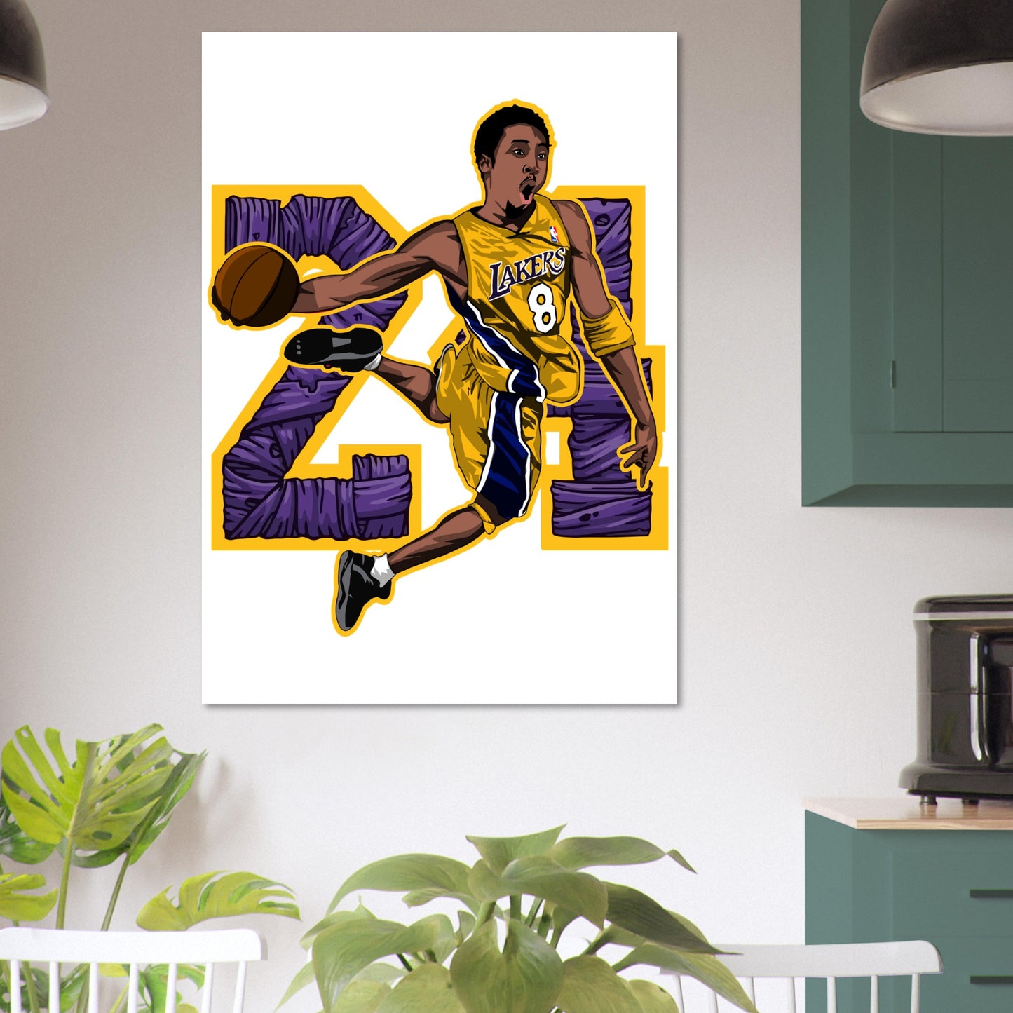 Dynamic illustration featuring a basketball player in the iconic Lakers yellow jersey, set against a stylized number 24 background in purple. The artwork captures the energy and motion of a powerful dunk with bold lines and vibrant team colors. Perfect for sports fans and basketball enthusiasts