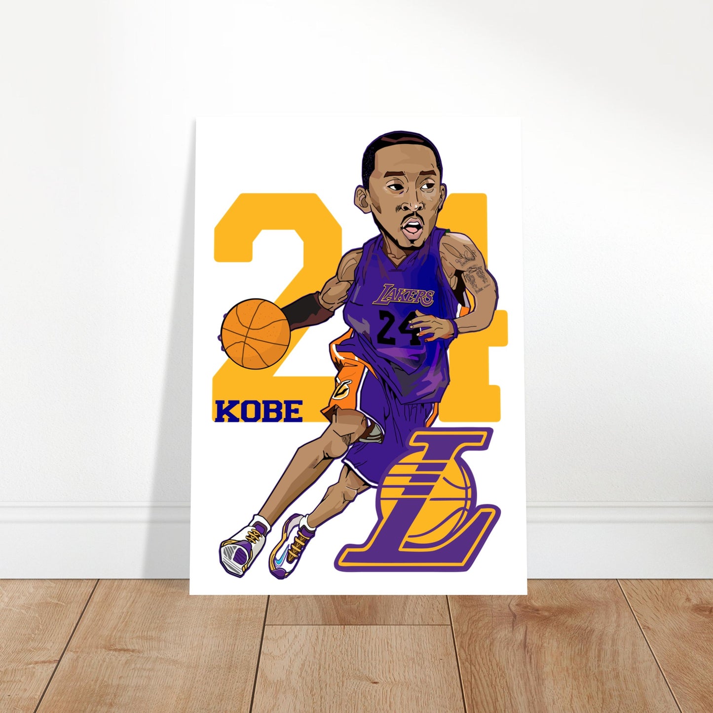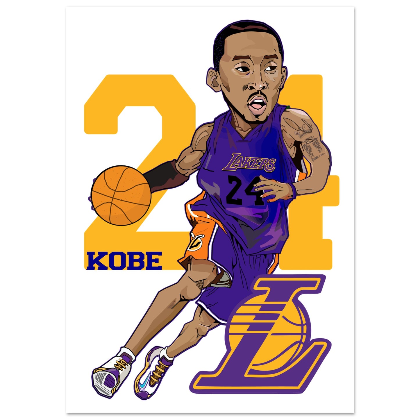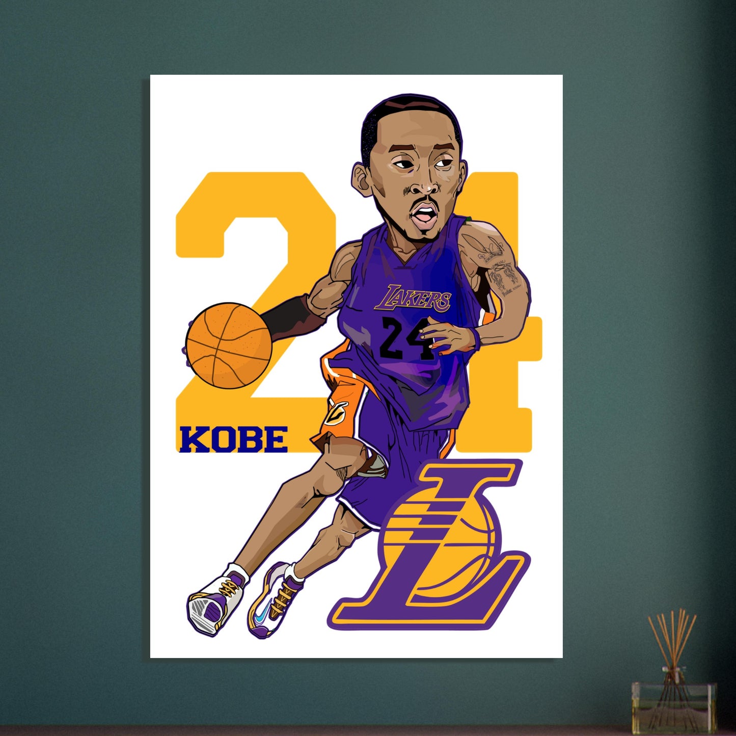 Dynamic cartoon-style artwork featuring a basketball player in purple and gold Lakers jersey number 24. Bold illustration with vibrant team colors and athletic action pose, set against a clean white background with iconic team logo and number details in yellow. Perfect for sports fans and basketball enthusiasts