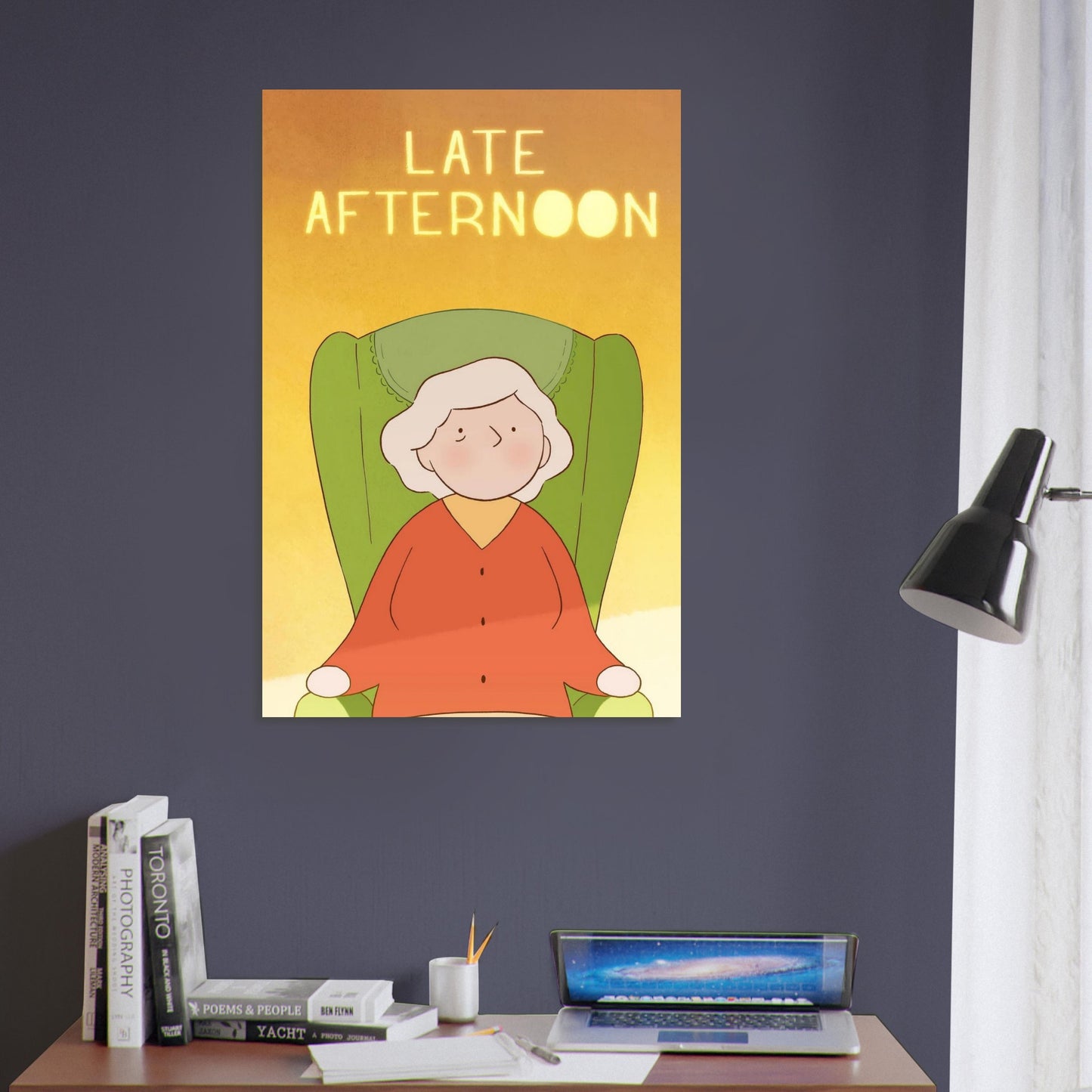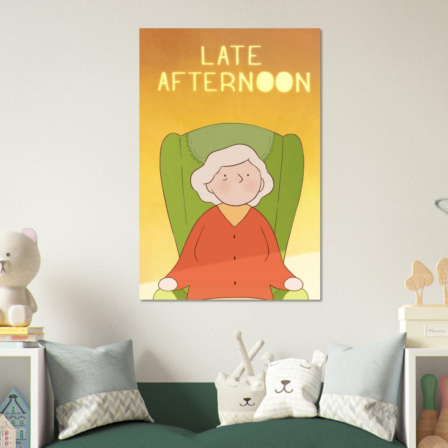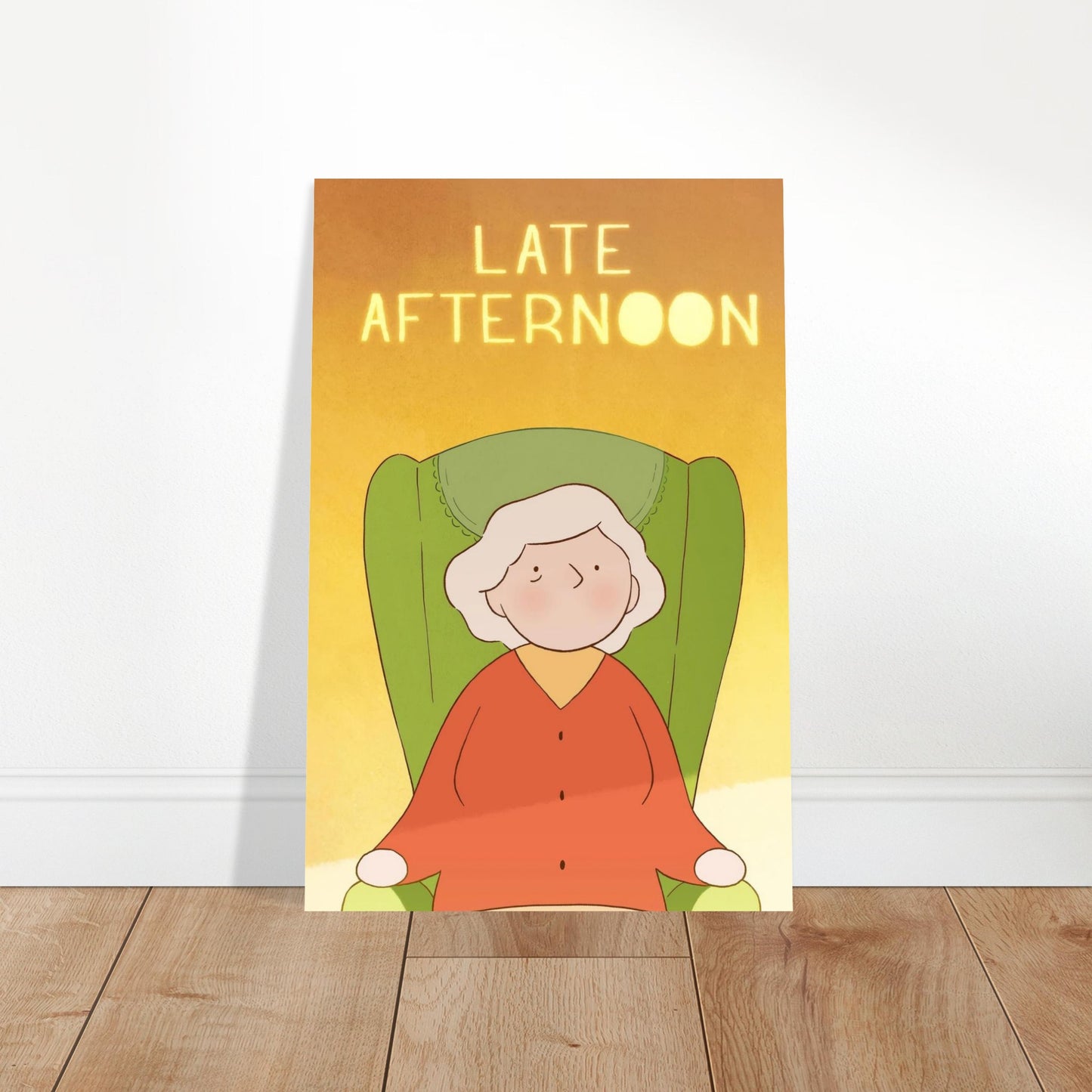 A charming minimalist illustration featuring a peaceful figure in a green armchair against a warm golden background. The glowing text 'LATE AFTERNOON' creates a soft, contemplative mood. Simple lines and gentle colors combine to create a soothing, nostalgic atmosphere perfect for any room seeking a touch of calm comfort