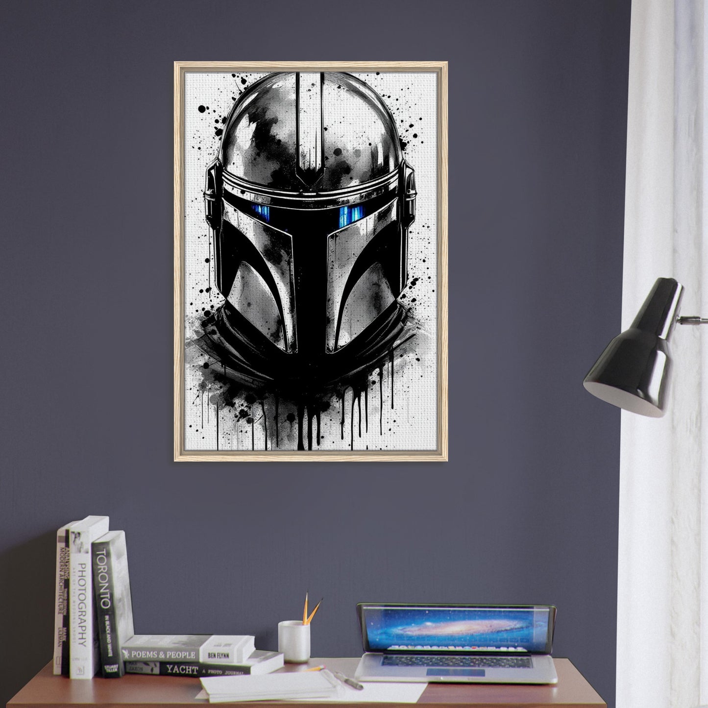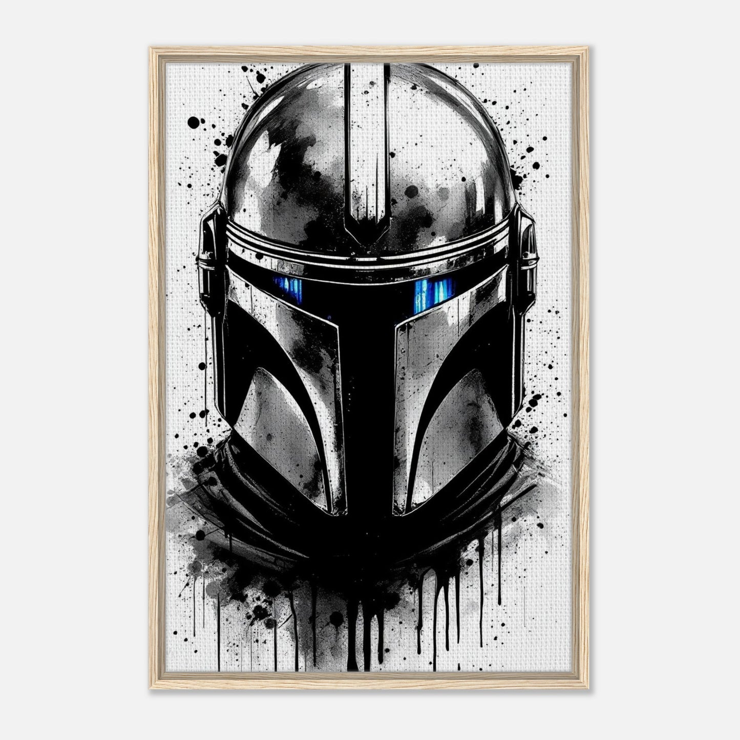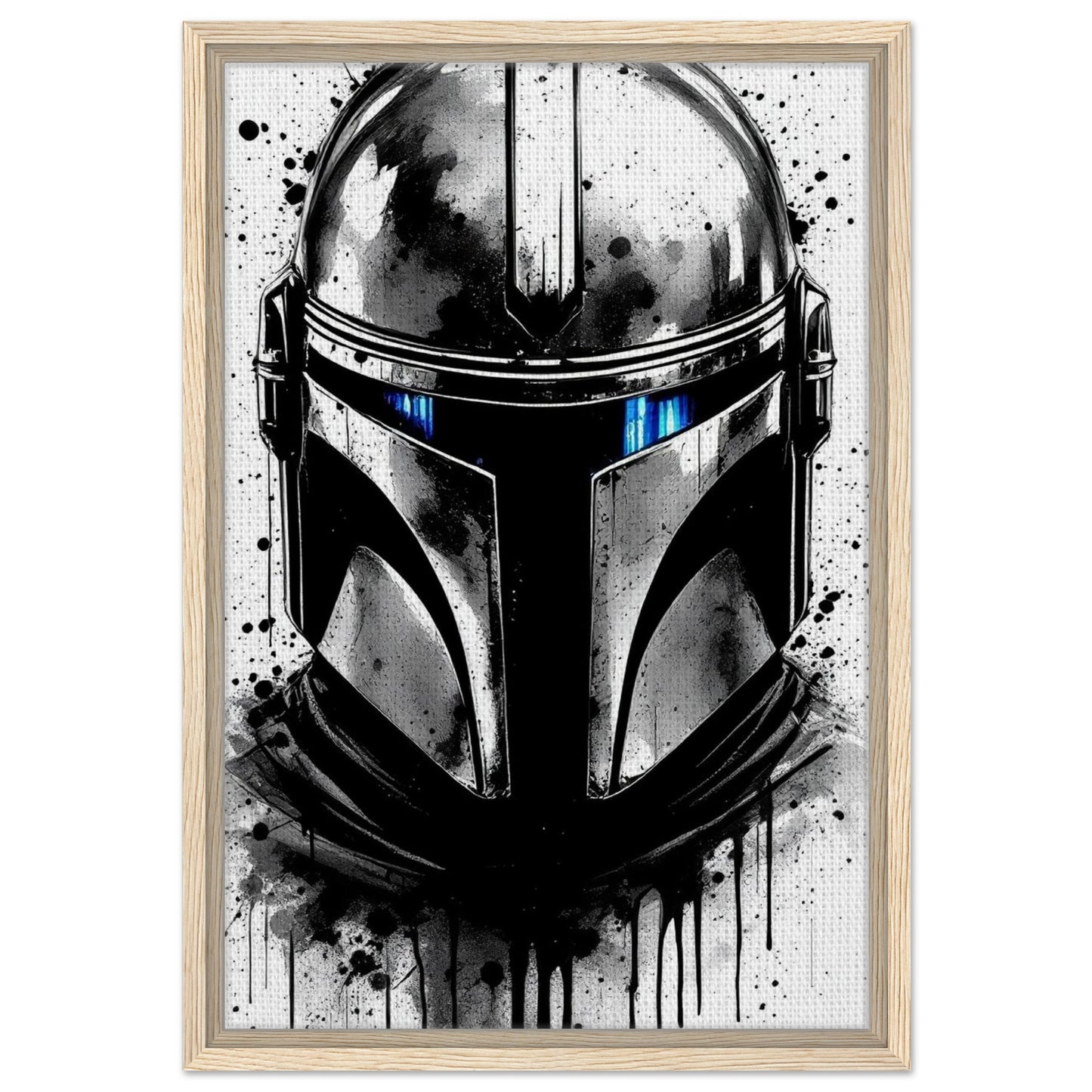 A striking black and white rendition of the iconic Mandalorian helmet with dramatic ink splatter effects and drips. Features bold contrasts and a moody atmosphere, highlighted by piercing blue visor details. The artistic grunge style creates a powerful, contemporary interpretation of this beloved Star Wars character