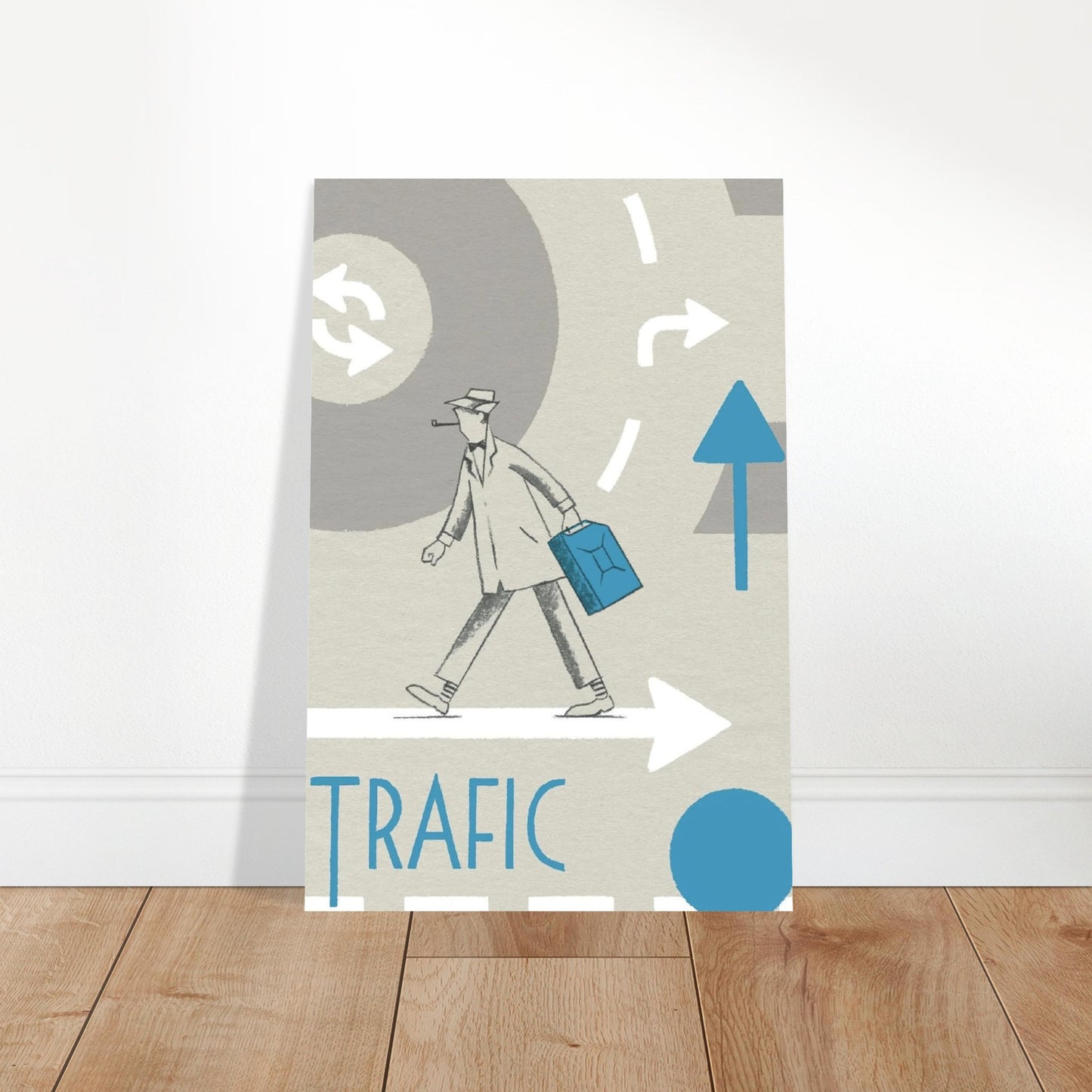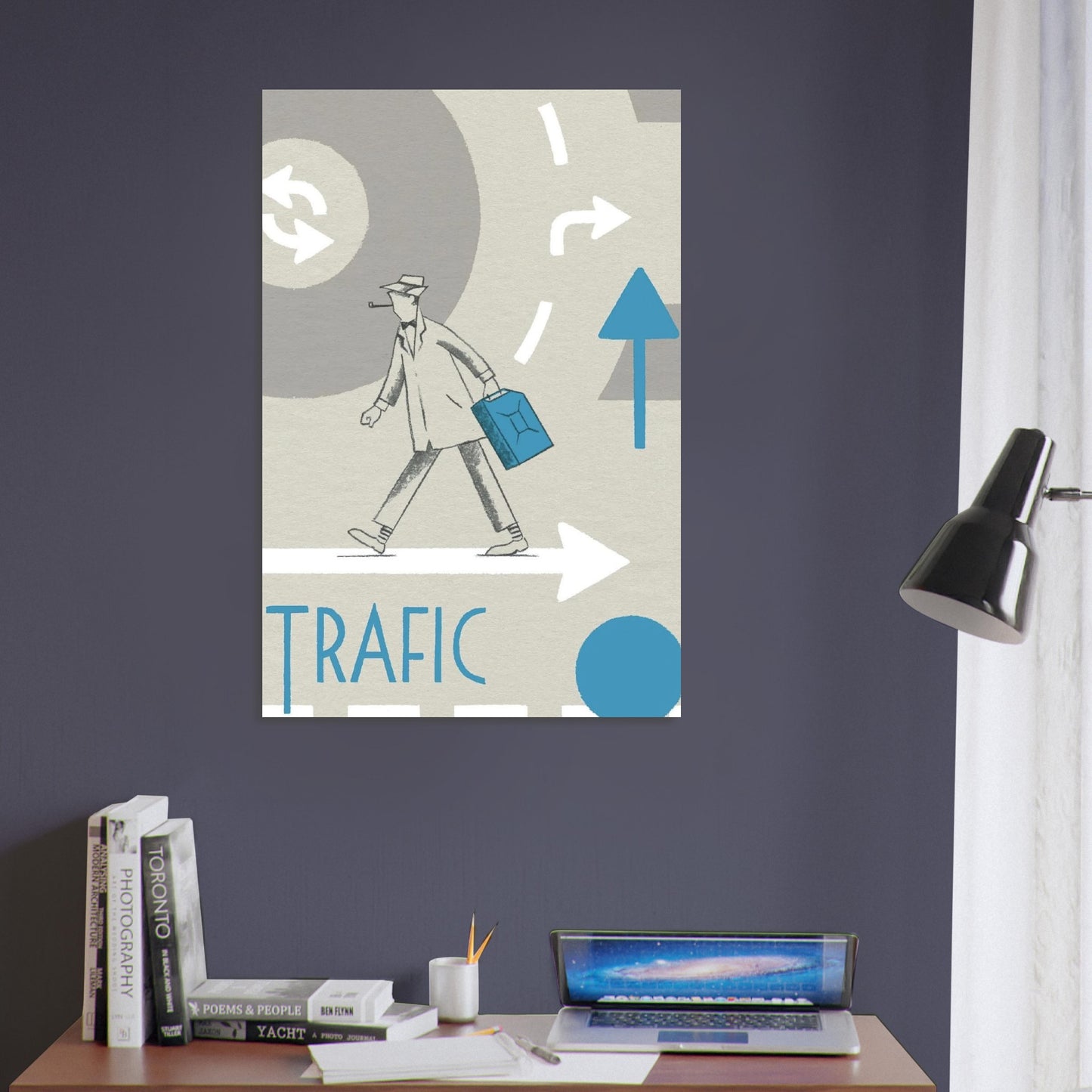 A stylized urban scene featuring a walking figure with a briefcase amidst minimalist traffic signs and directional arrows. Rendered in a muted gray palette with pops of bright blue, this geometric composition captures the essence of city navigation in a clean, modernist style