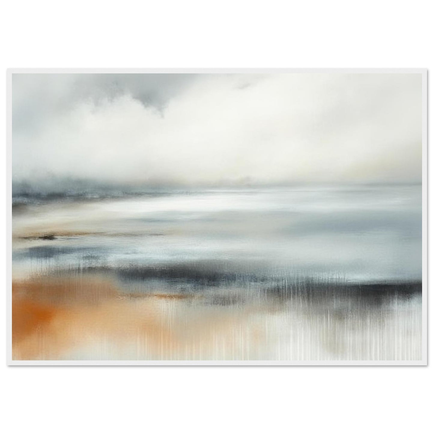 A serene coastal abstract in muted tones of grey, white, and warm terracotta. This atmospheric seascape captures the misty essence of a foggy shoreline, with gentle horizontal brushstrokes creating a dreamy, ethereal effect. Perfect for creating a calming, contemporary aesthetic in any room