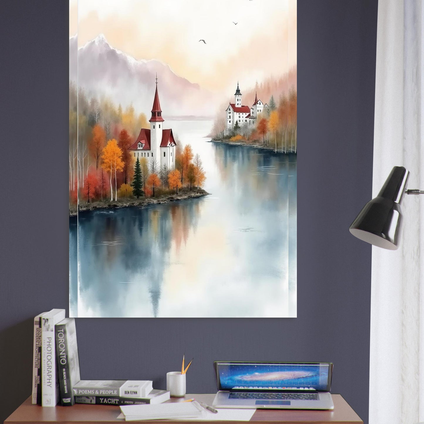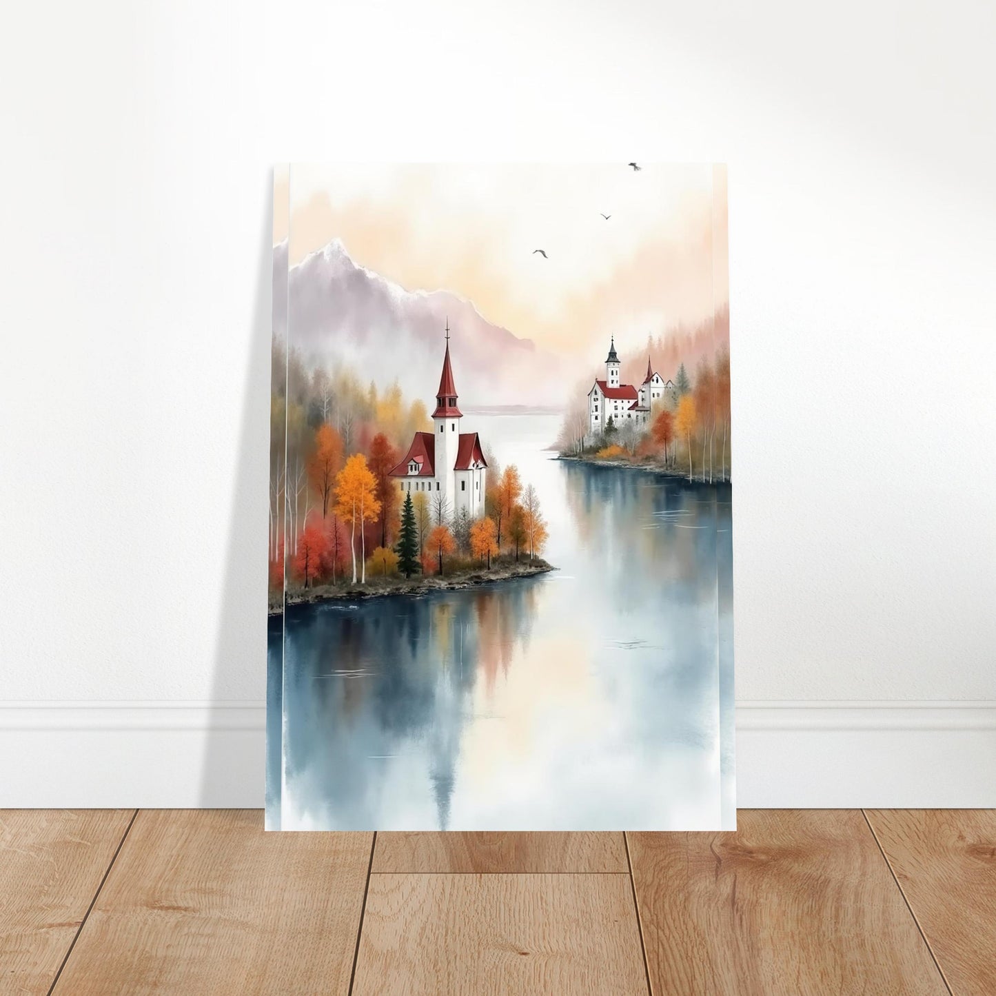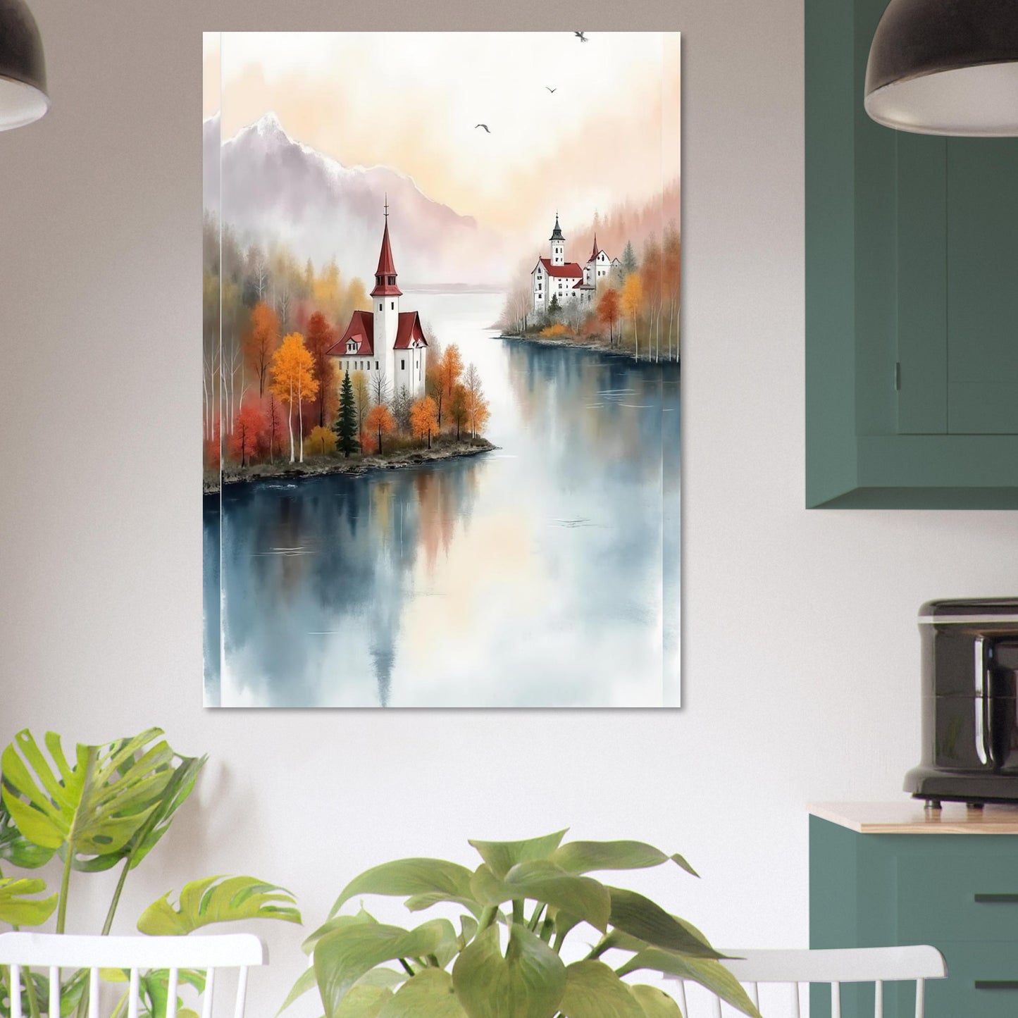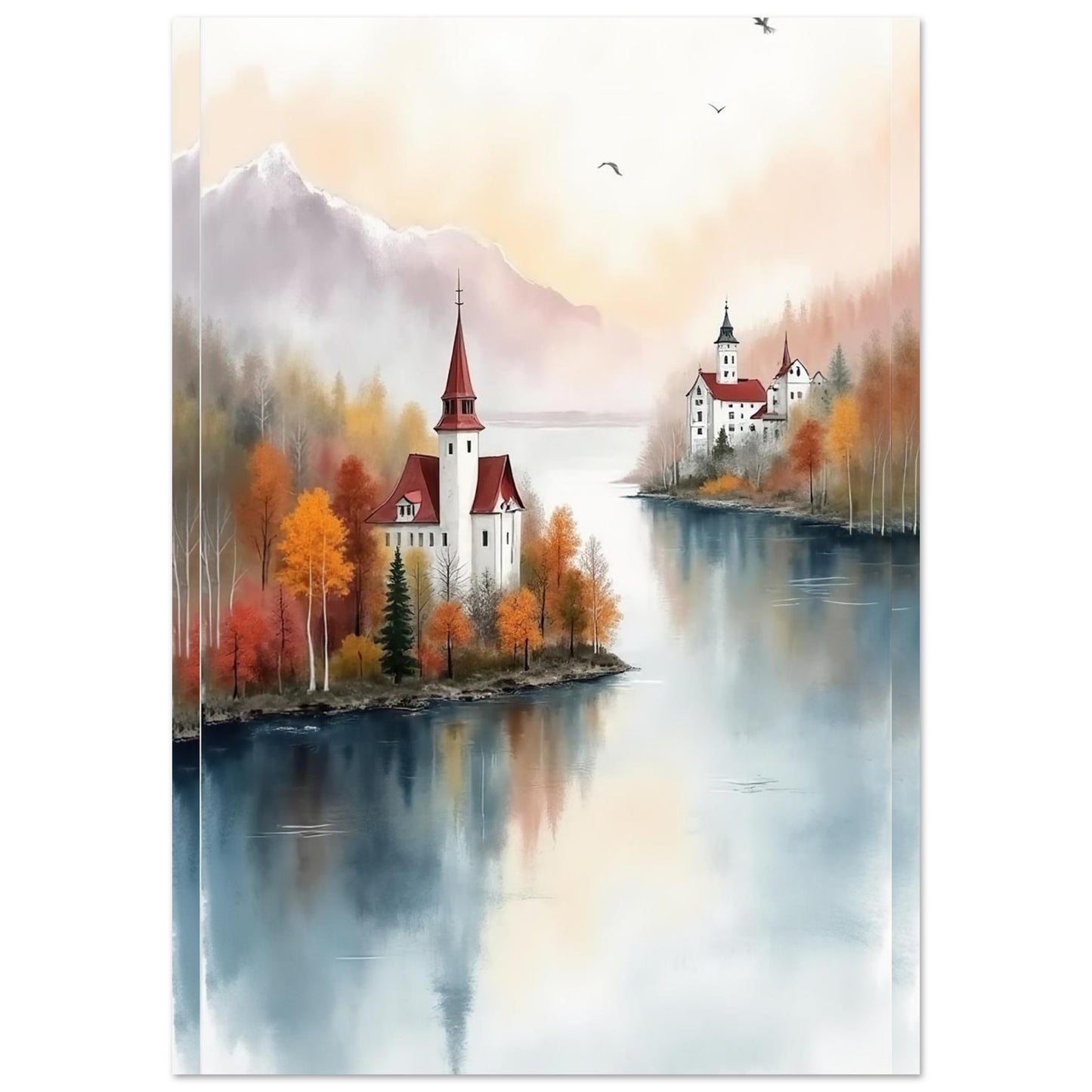 A serene watercolor landscape featuring two charming churches nestled along a misty lake. The scene captures the tranquil autumn atmosphere with warm orange and red foliage contrasting against cool gray mountains. The ethereal morning light creates a dreamy, peaceful mood while birds soar overhead in the soft peach sky