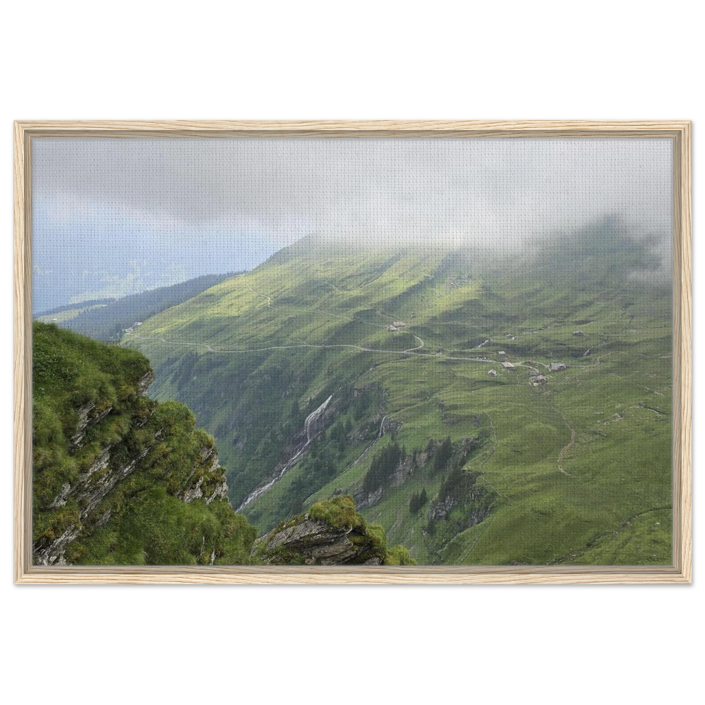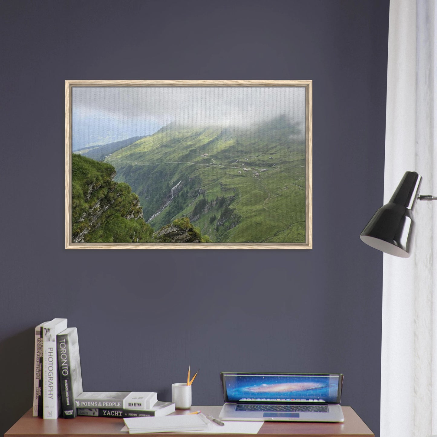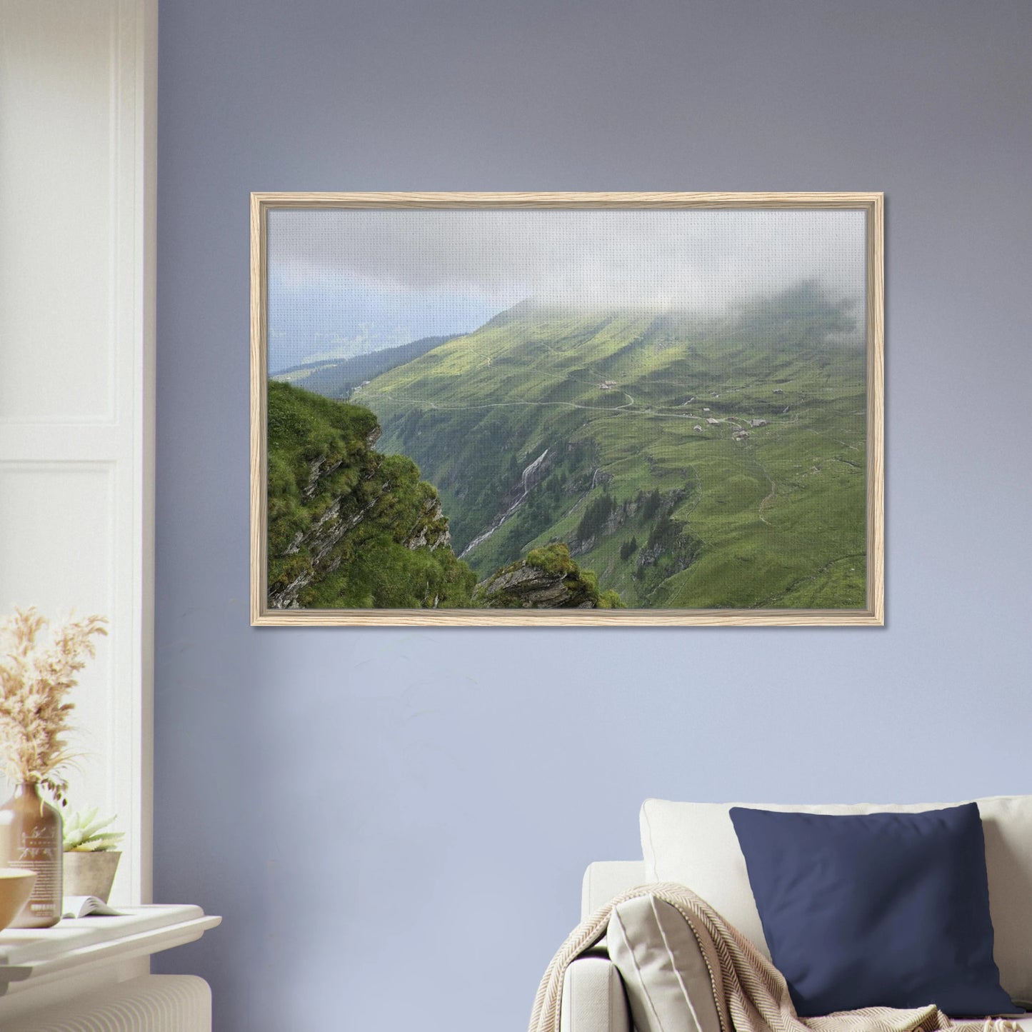 Misty Mountain Landscape Framed Canvas Wall Art - Alpine Valley Scene