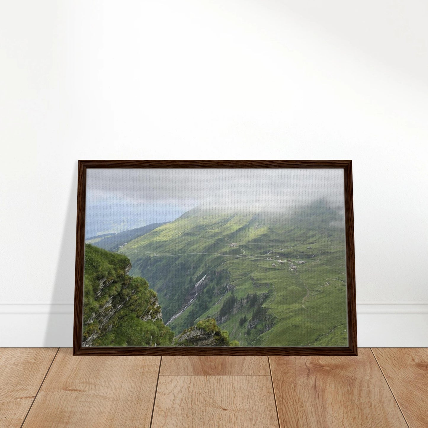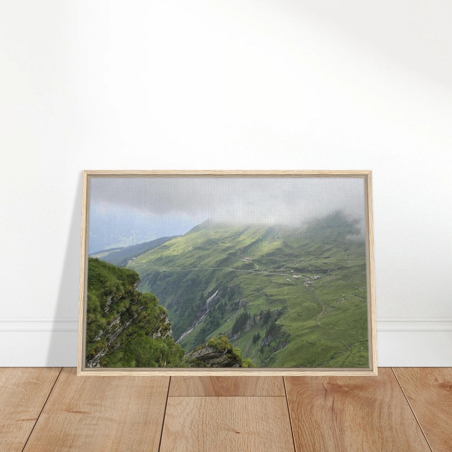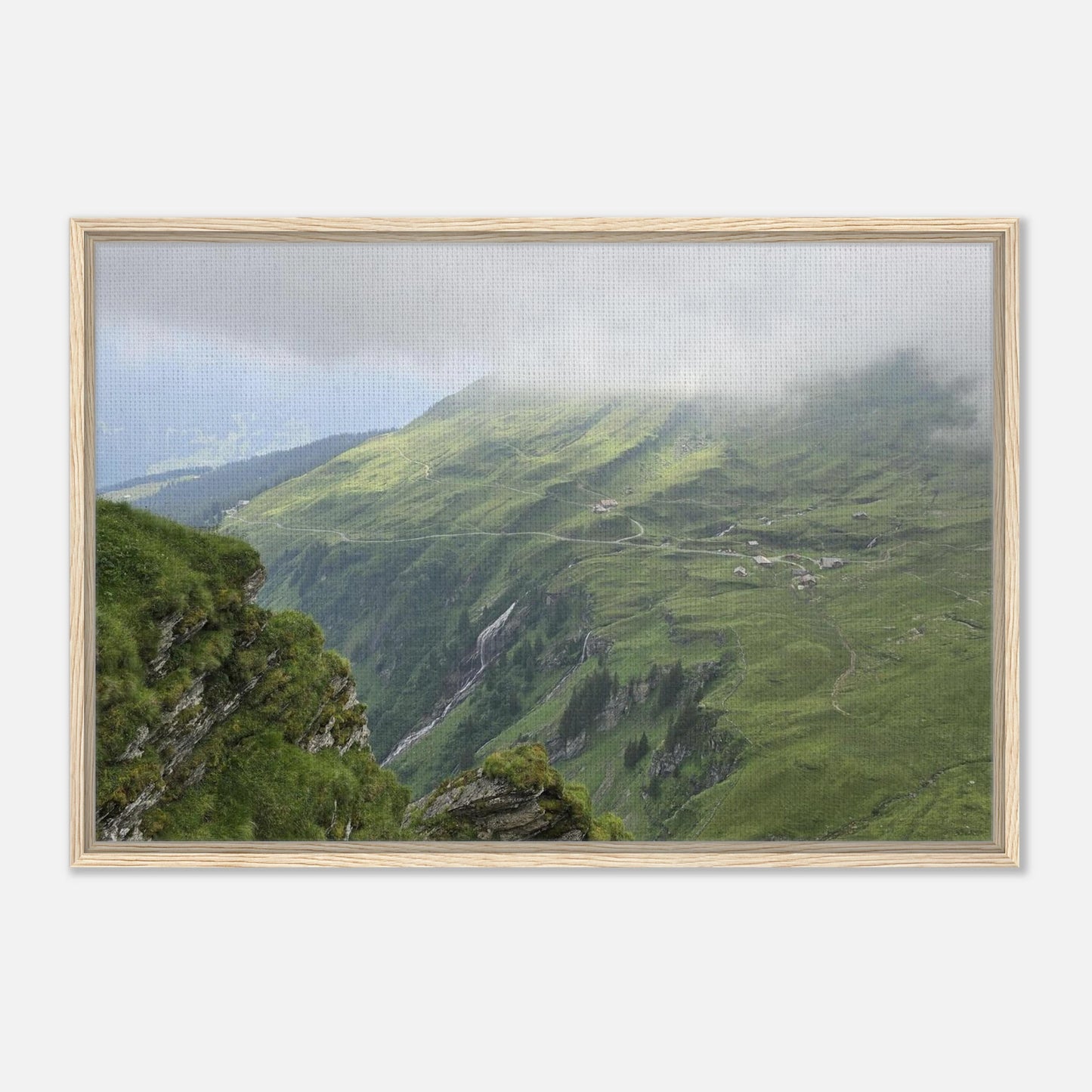 Misty Mountain Landscape Framed Canvas Wall Art - Alpine Valley Scene