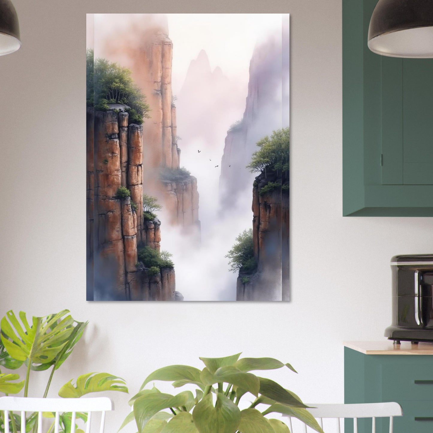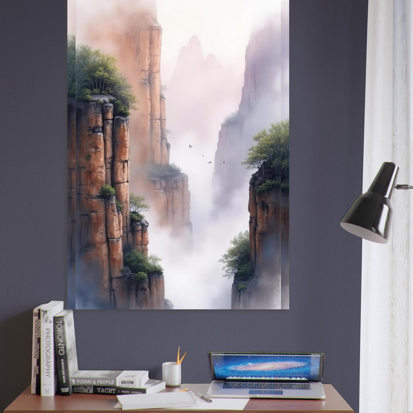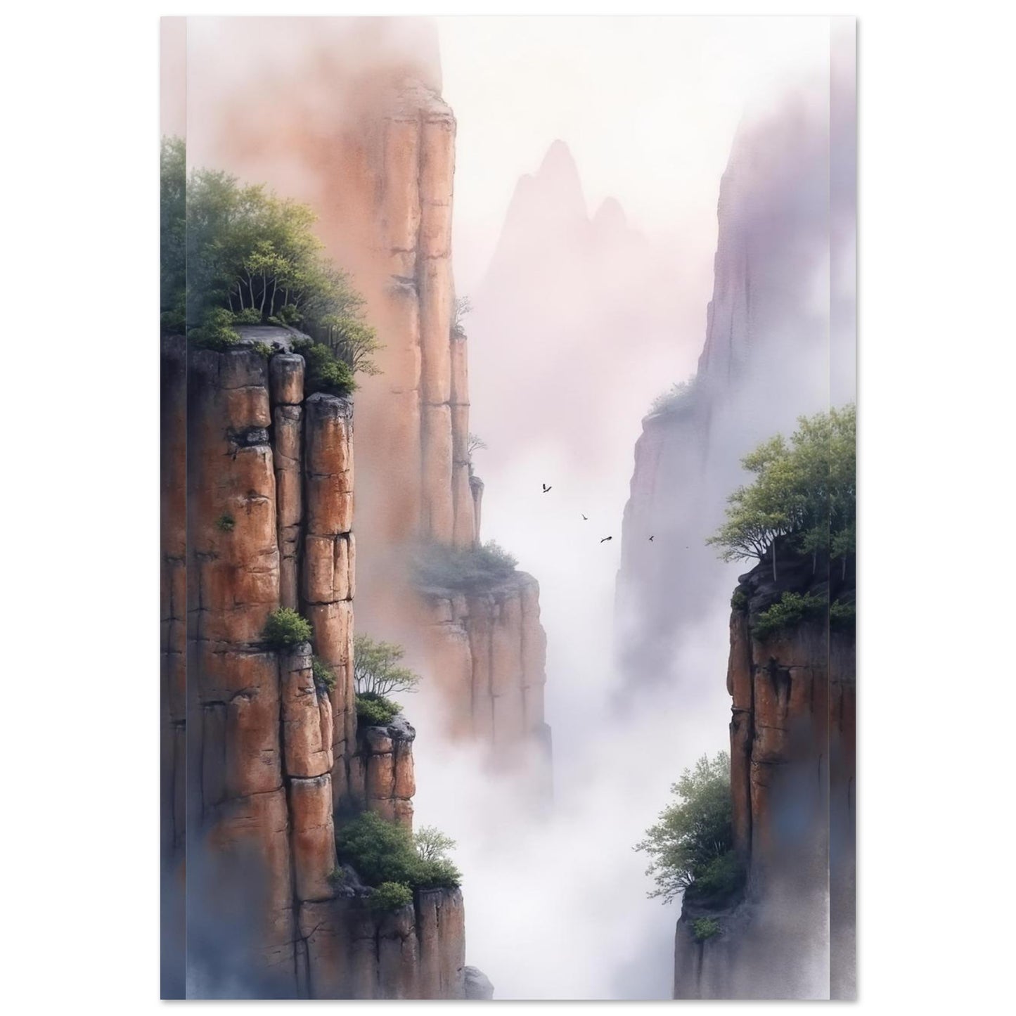 A ethereal watercolor landscape featuring towering sandstone cliffs emerging from misty valleys. Delicate shades of orange and purple create a dreamy atmosphere, while green foliage adds natural contrast. Birds soar through the fog, adding depth and movement to this tranquil Asian-inspired mountainscape