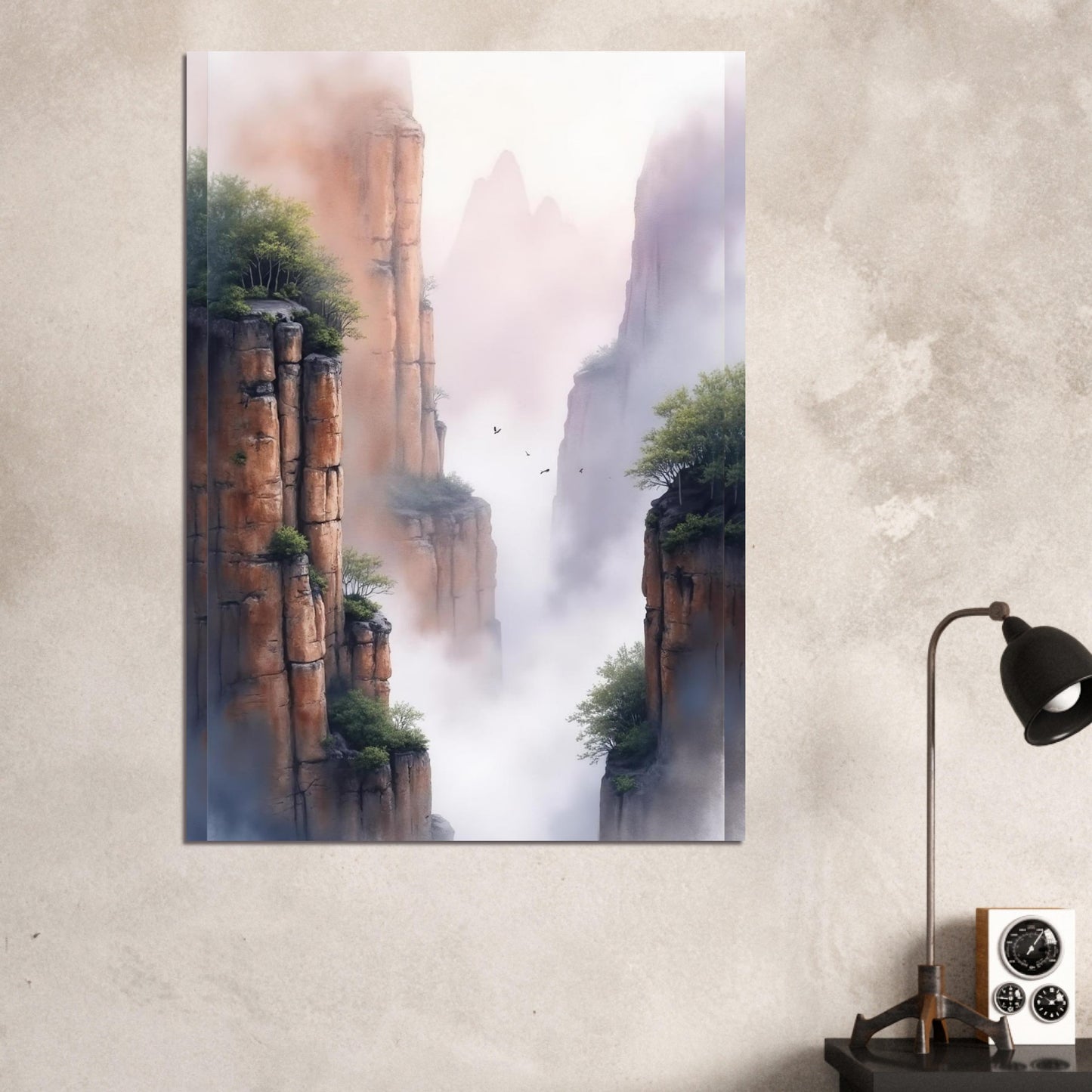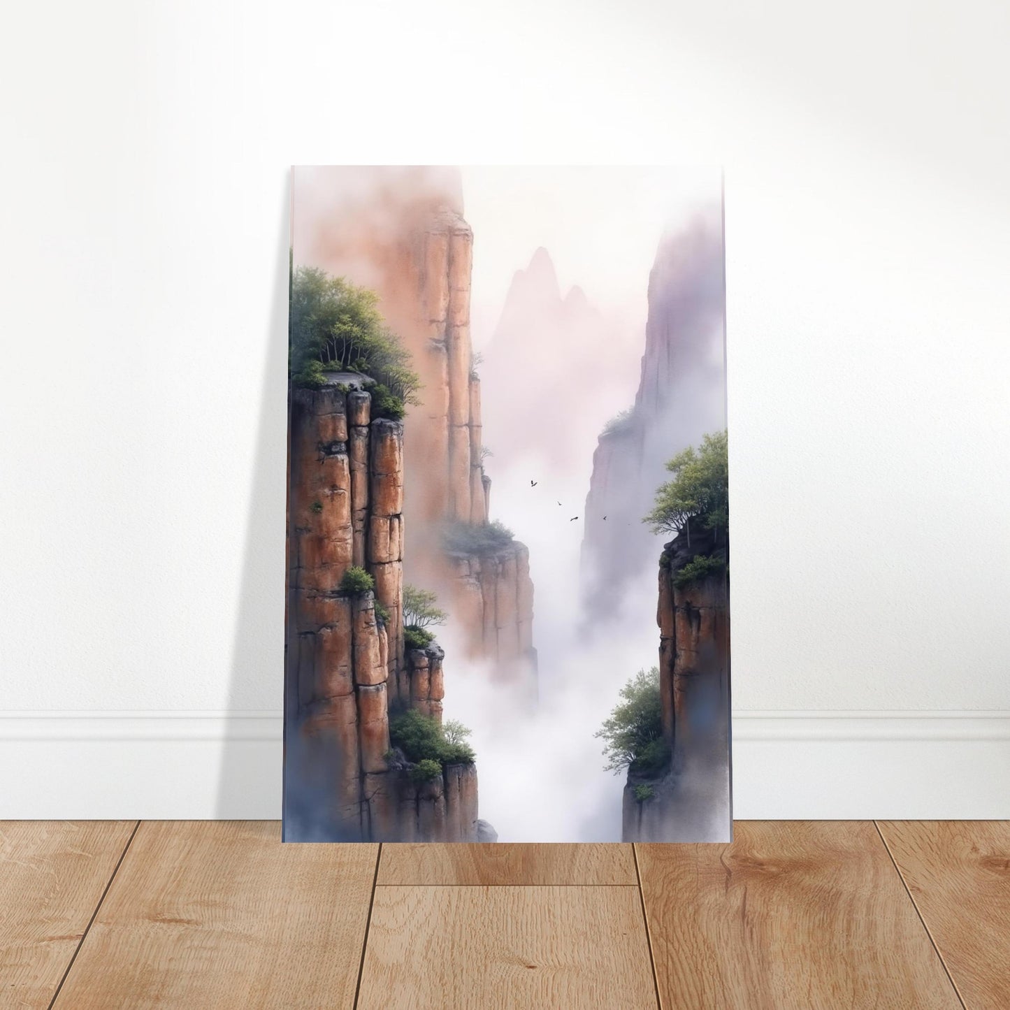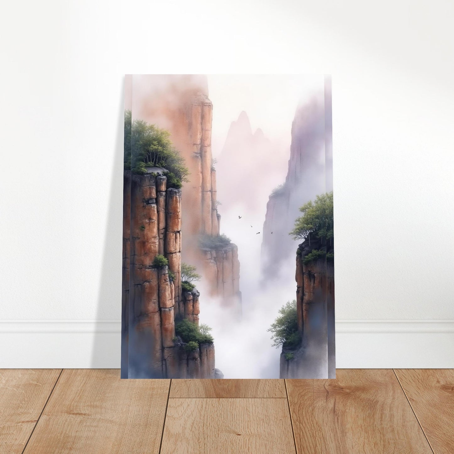 A ethereal watercolor landscape featuring towering sandstone cliffs emerging from misty valleys. Delicate shades of orange and purple create a dreamy atmosphere, while green foliage adds natural contrast. Birds soar through the fog, adding depth and movement to this tranquil Asian-inspired mountainscape