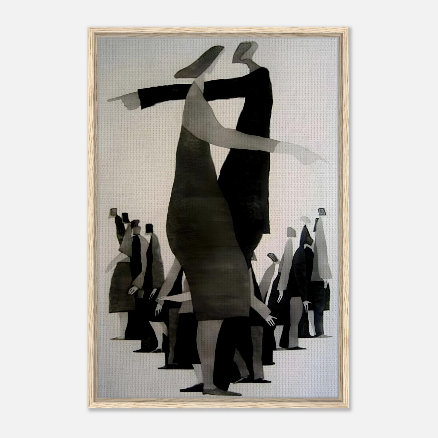 Striking monochromatic artwork depicting elegant dancing figures in a minimalist style. Bold black and white composition shows graceful movement through simplified geometric forms. The central figure stands tall against a backdrop of smaller dancers, creating a powerful sense of rhythm and motion in this contemporary piece