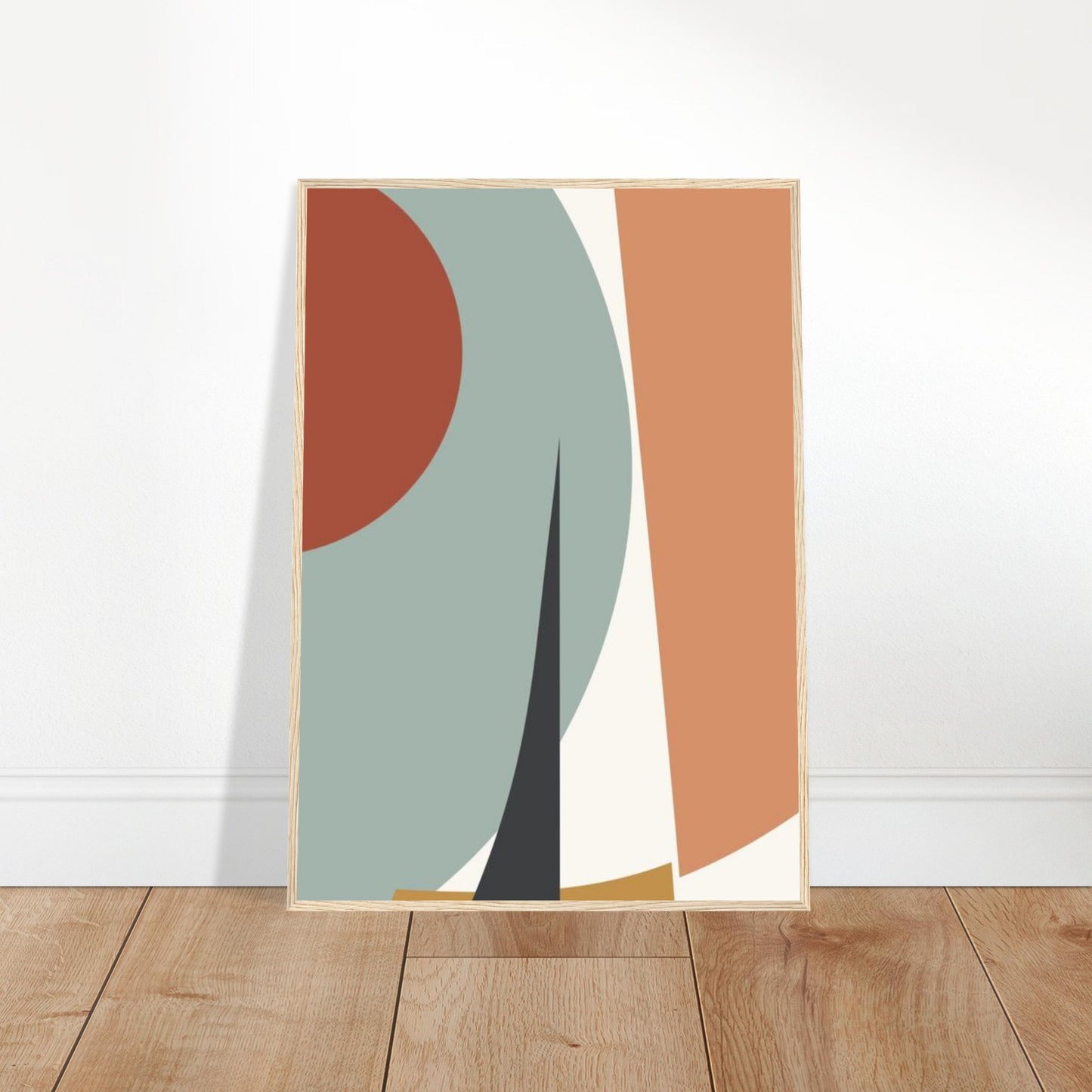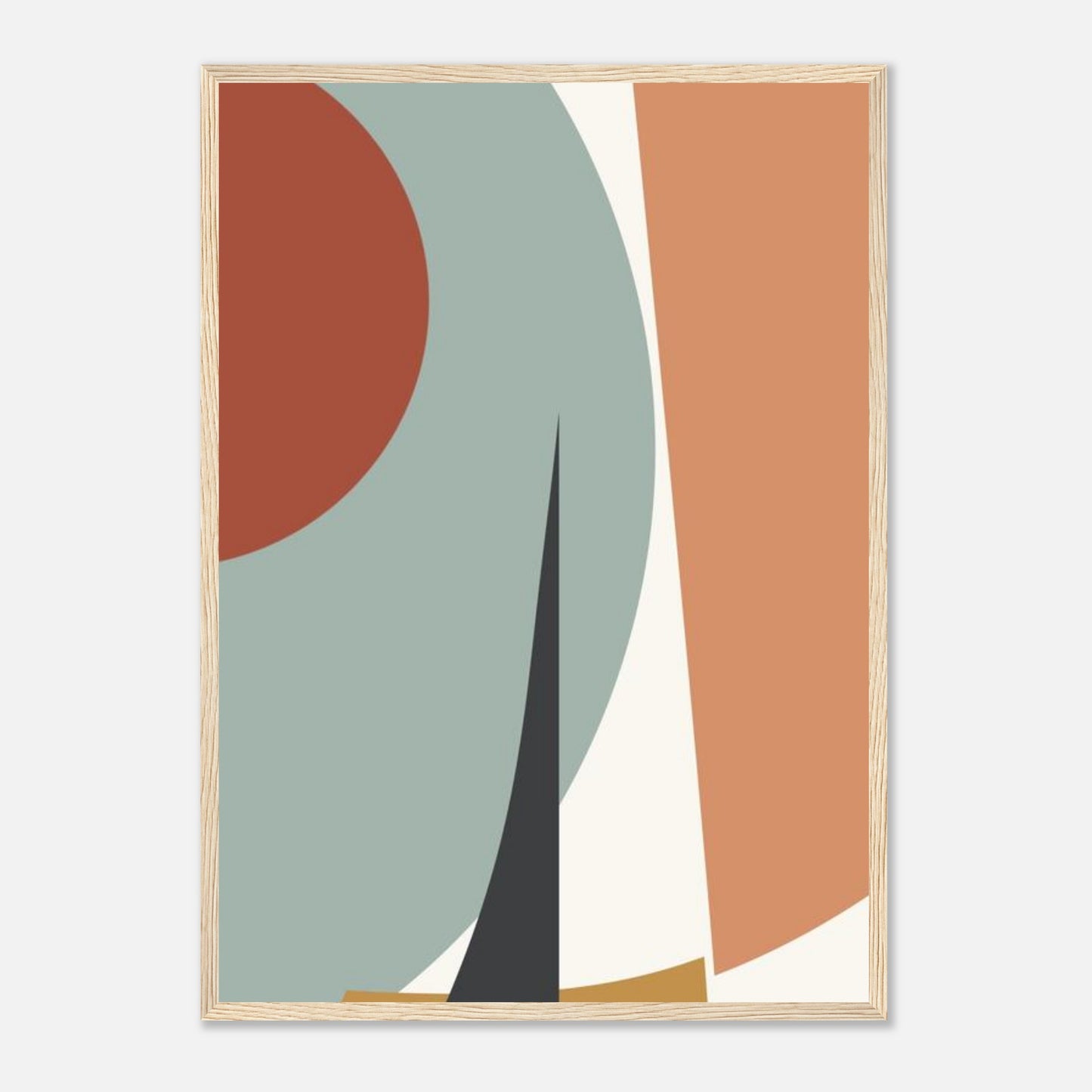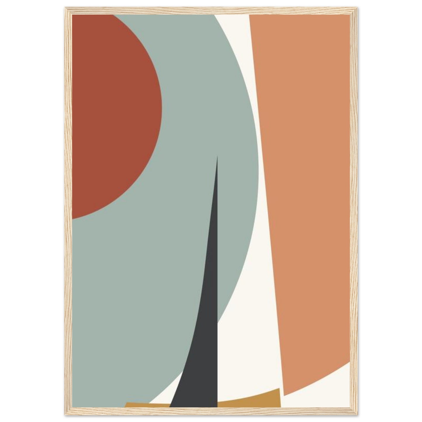 A striking minimalist composition featuring bold geometric shapes in a harmonious earth tone palette. Curved forms and straight lines create an elegant interplay, with dusty sage, terracotta, peach, and black elements arranged in a sophisticated modern design. Perfect for contemporary interior spaces seeking artistic balance