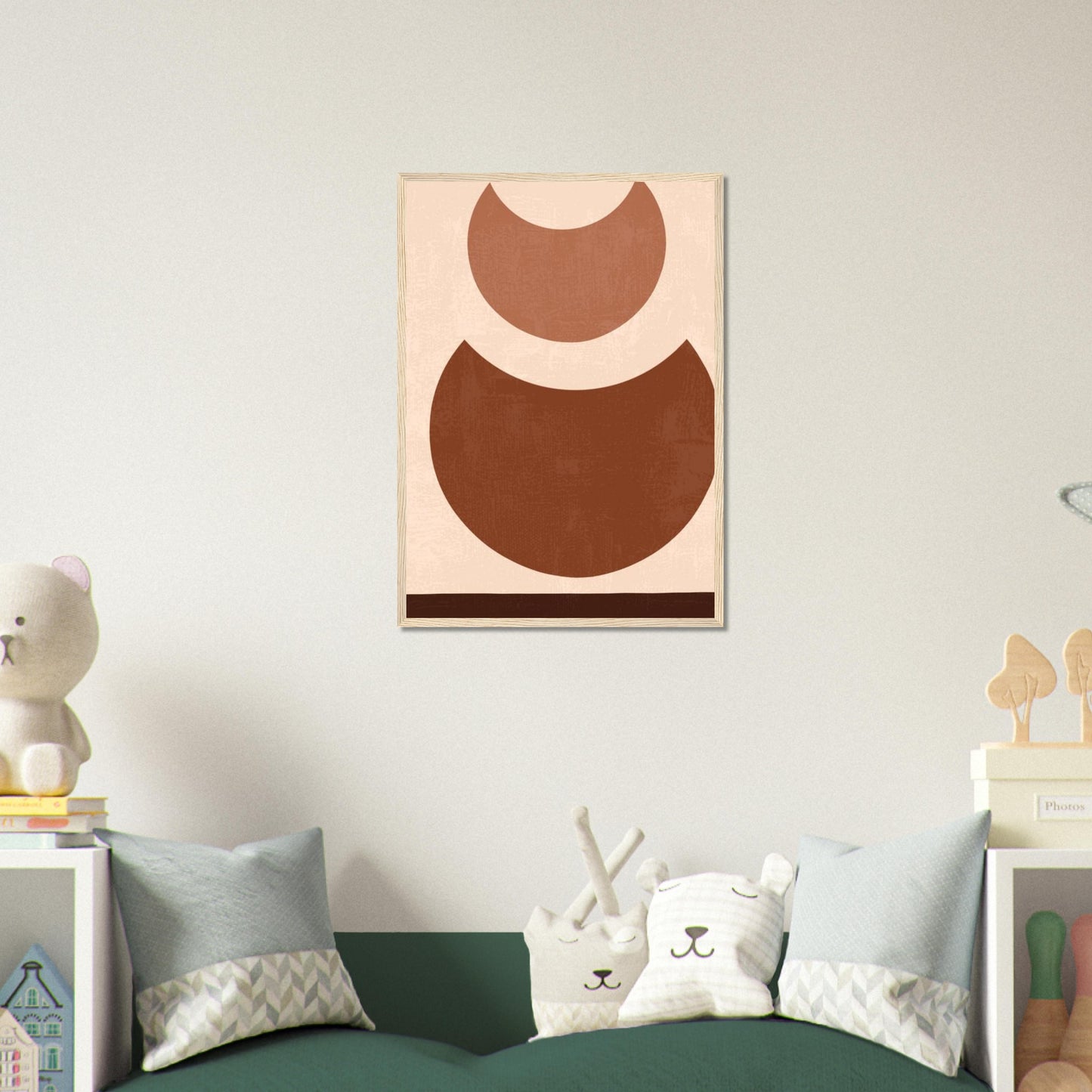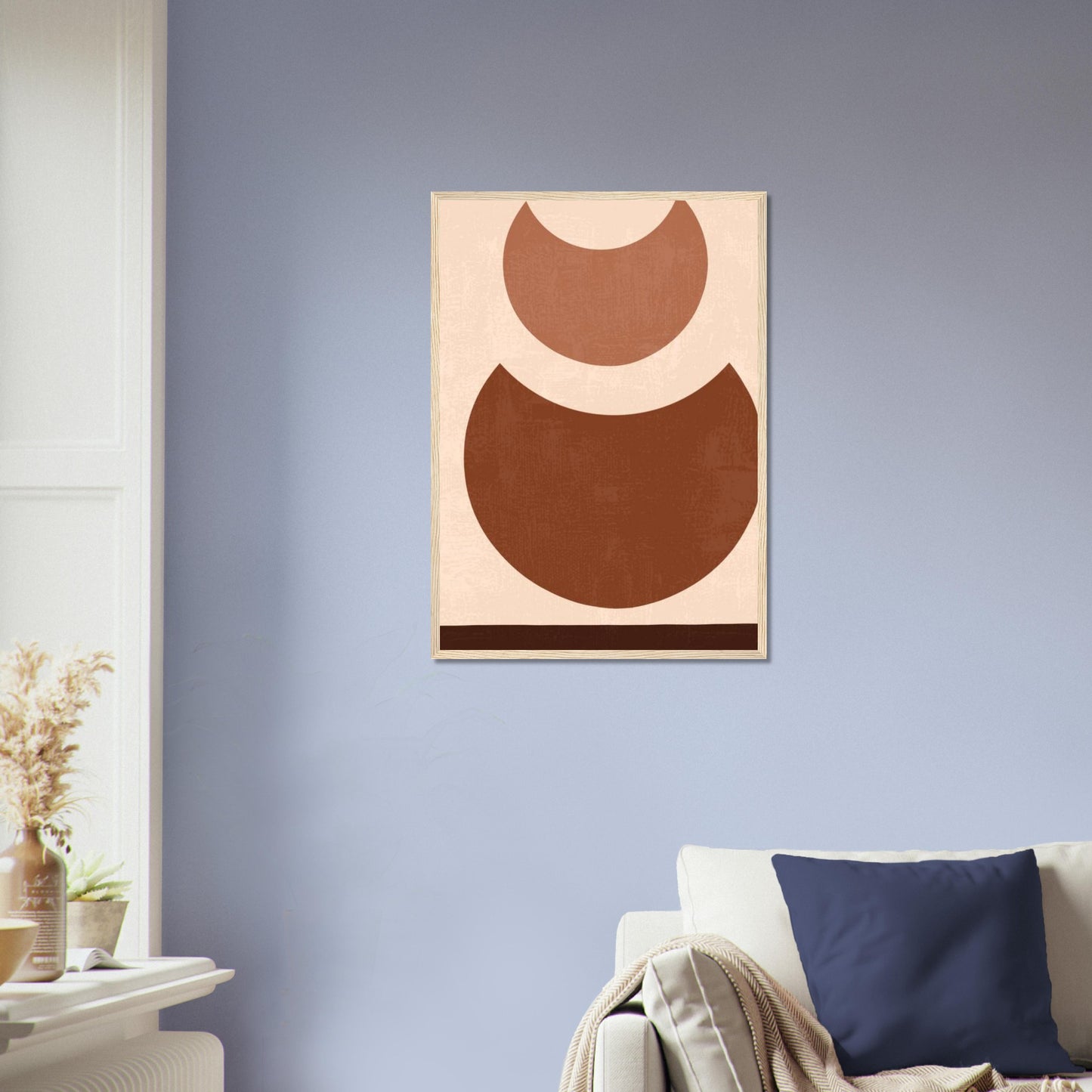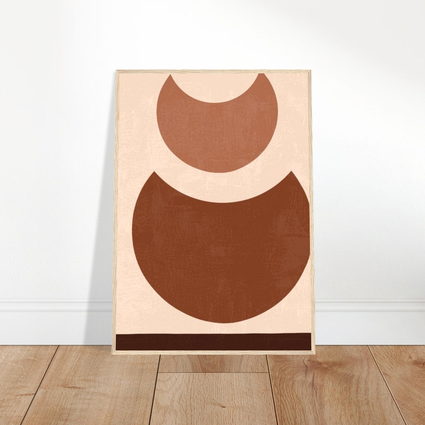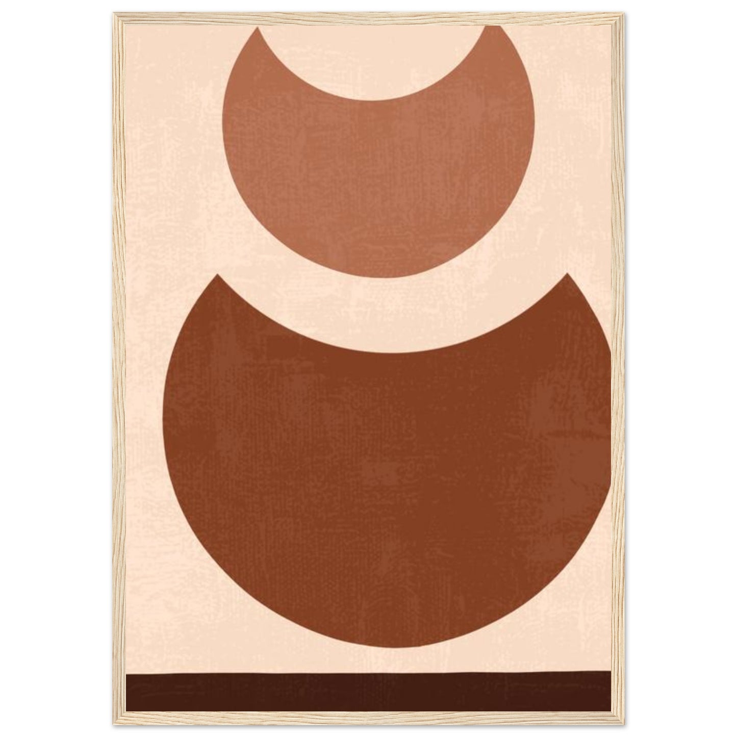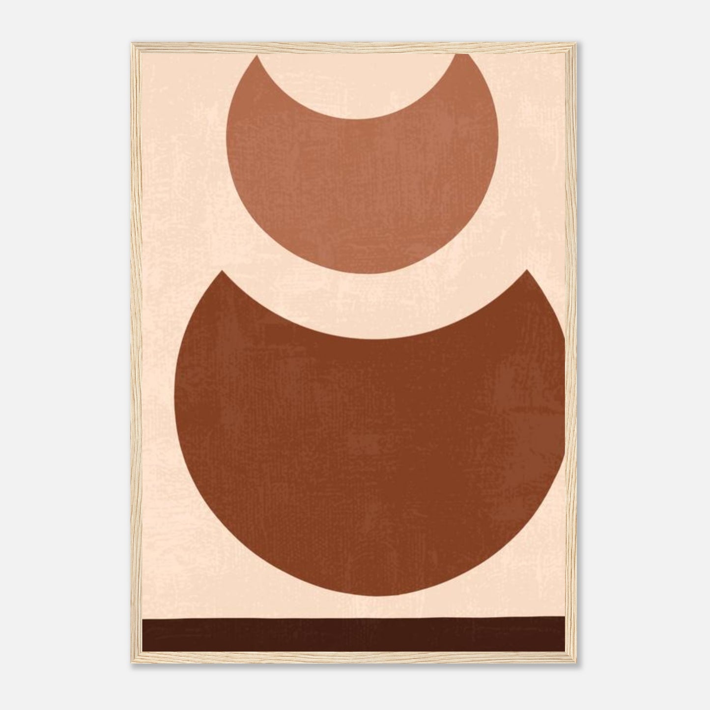 A minimalist geometric composition featuring stacked crescents and circles in earthy brown tones against a soft peach background. This modern abstract design creates a harmonious balance of shapes, evoking lunar phases with a contemporary boho aesthetic. Perfect for creating a serene, meditative atmosphere in any space.