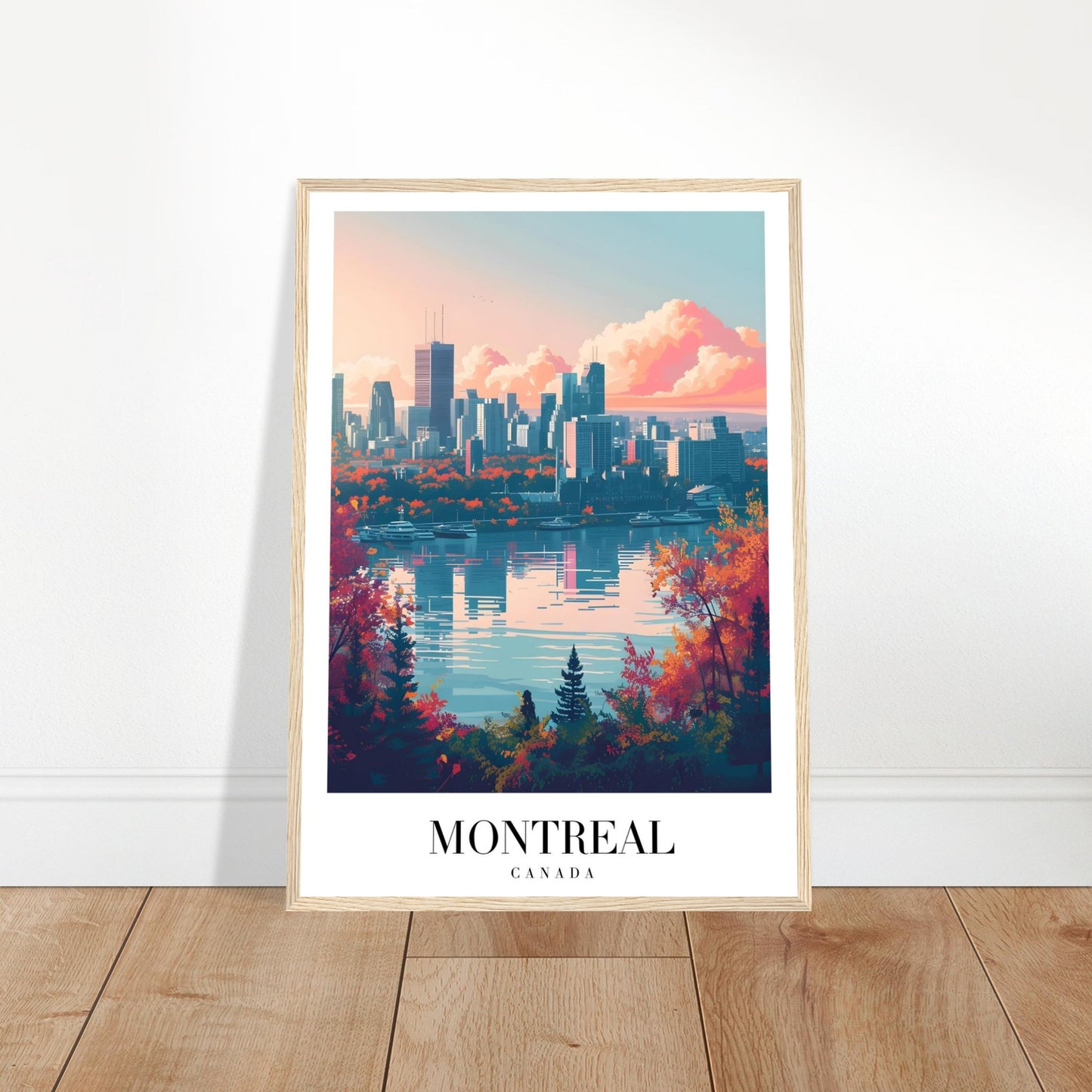 A stunning retro-style illustration of Montreal's iconic skyline reflected in calm waters. Dramatic pink and orange sunset clouds contrast with teal blue skies, while vibrant autumn foliage frames the urban landscape. The artwork captures the city's blend of natural beauty and metropolitan charm in a dreamy, nostalgic color palette