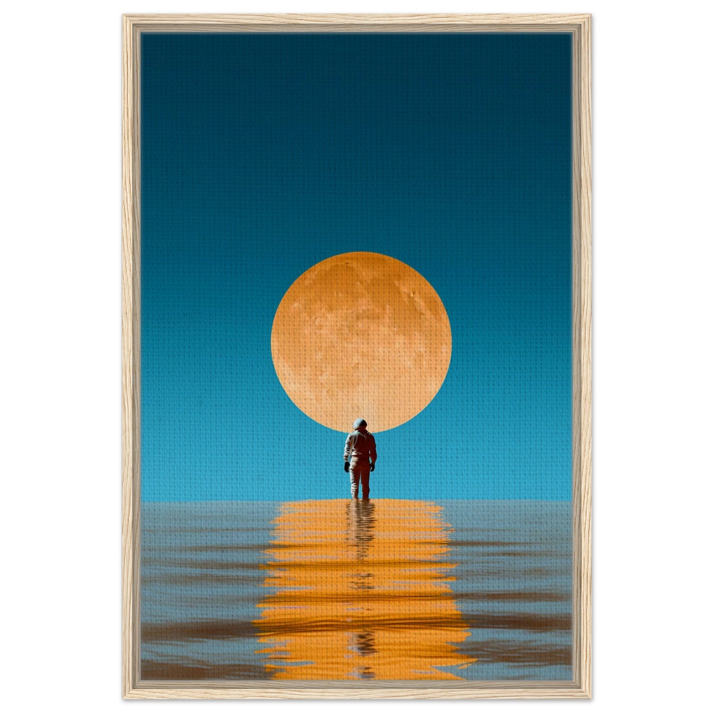 A striking surreal scene captures a solitary figure standing on reflective waters before a massive golden moon. The composition creates perfect symmetry with the moon's warm orange glow contrasting against a deep turquoise sky. The reflection creates a mesmerizing path of light across the tranquil water surface, evoking feelings of peace and contemplation