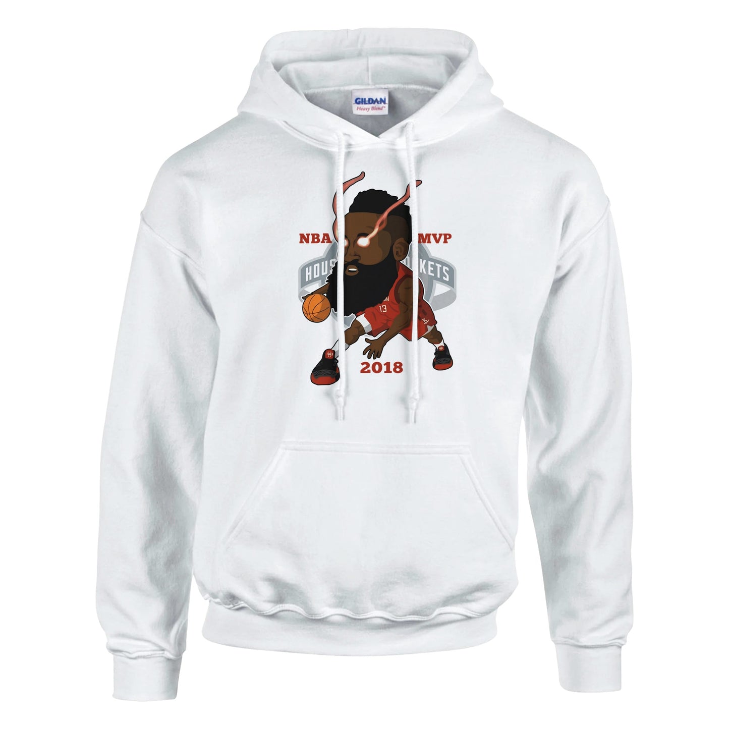 Unique cartoon-style illustration featuring a basketball player in a red Houston uniform. The design showcases an artistic interpretation with glowing eyes and dynamic movement, perfect for basketball enthusiasts. Bold red and black color scheme with '2018 MVP' text creates an eye-catching sports-themed artwork