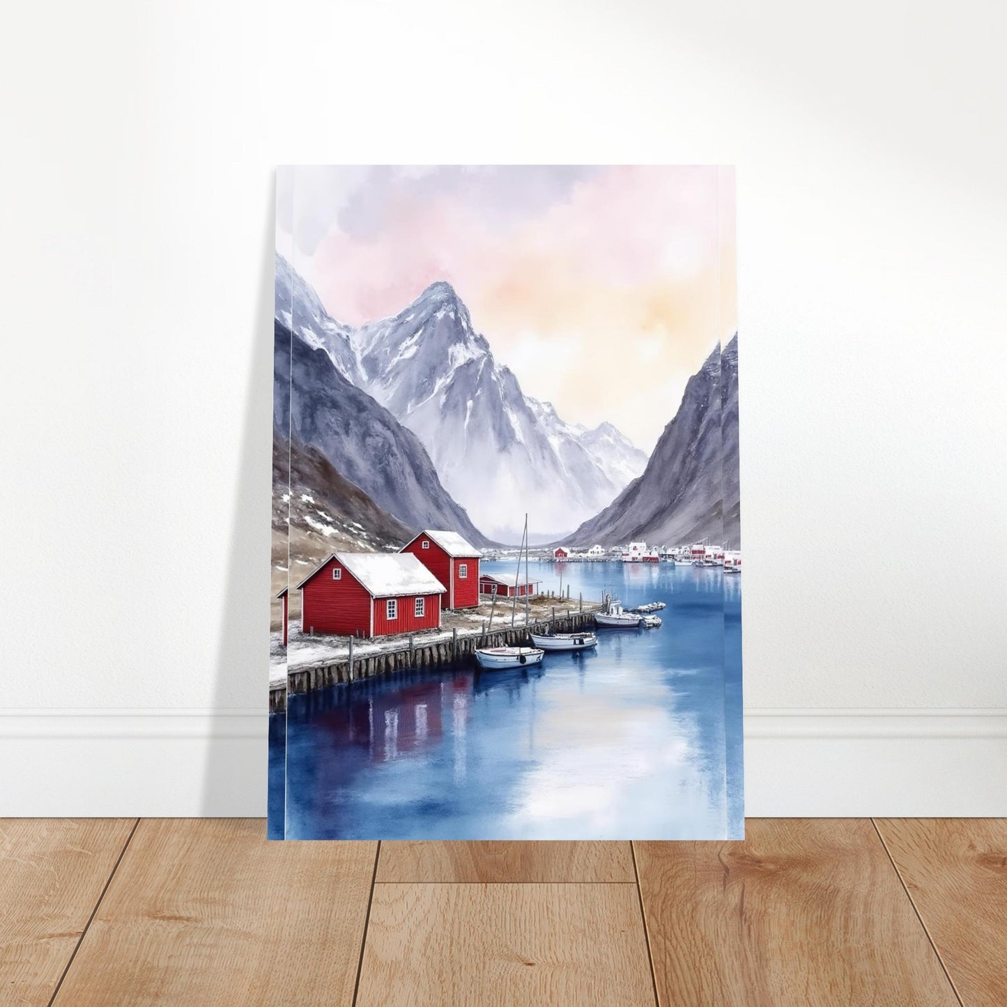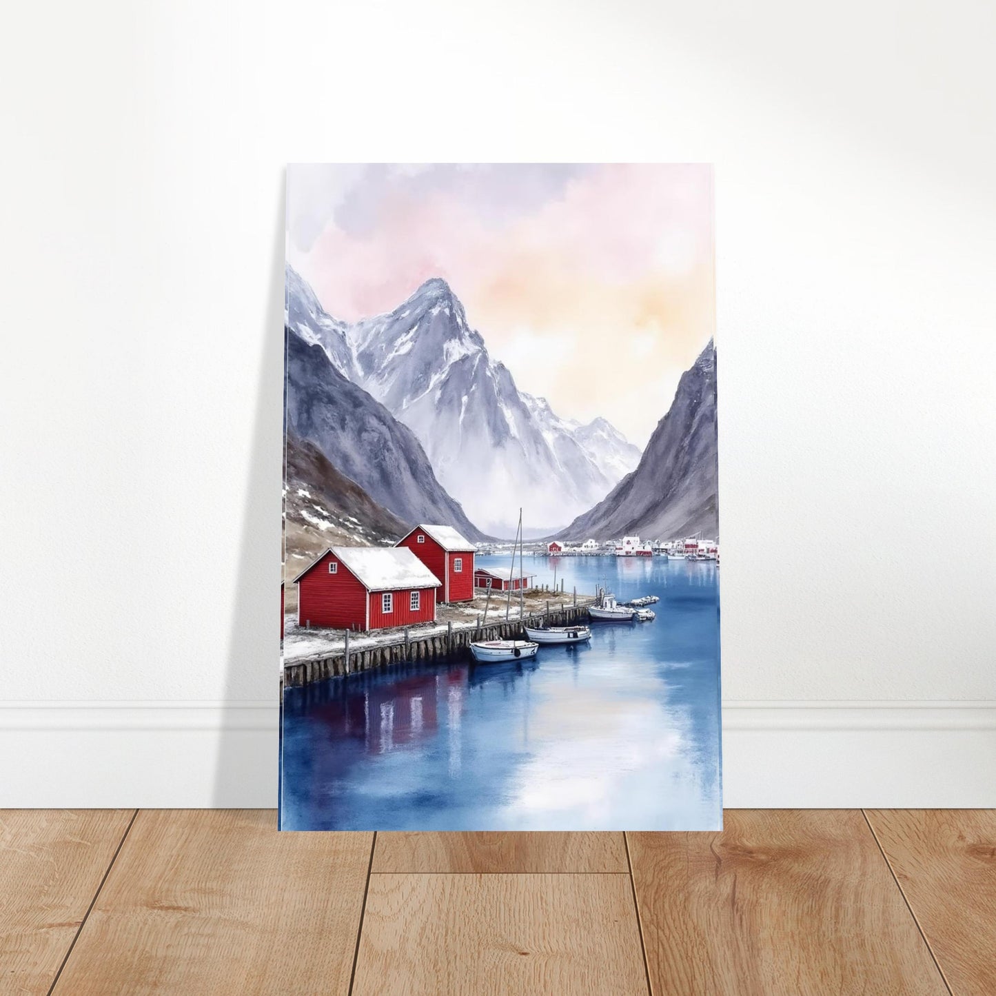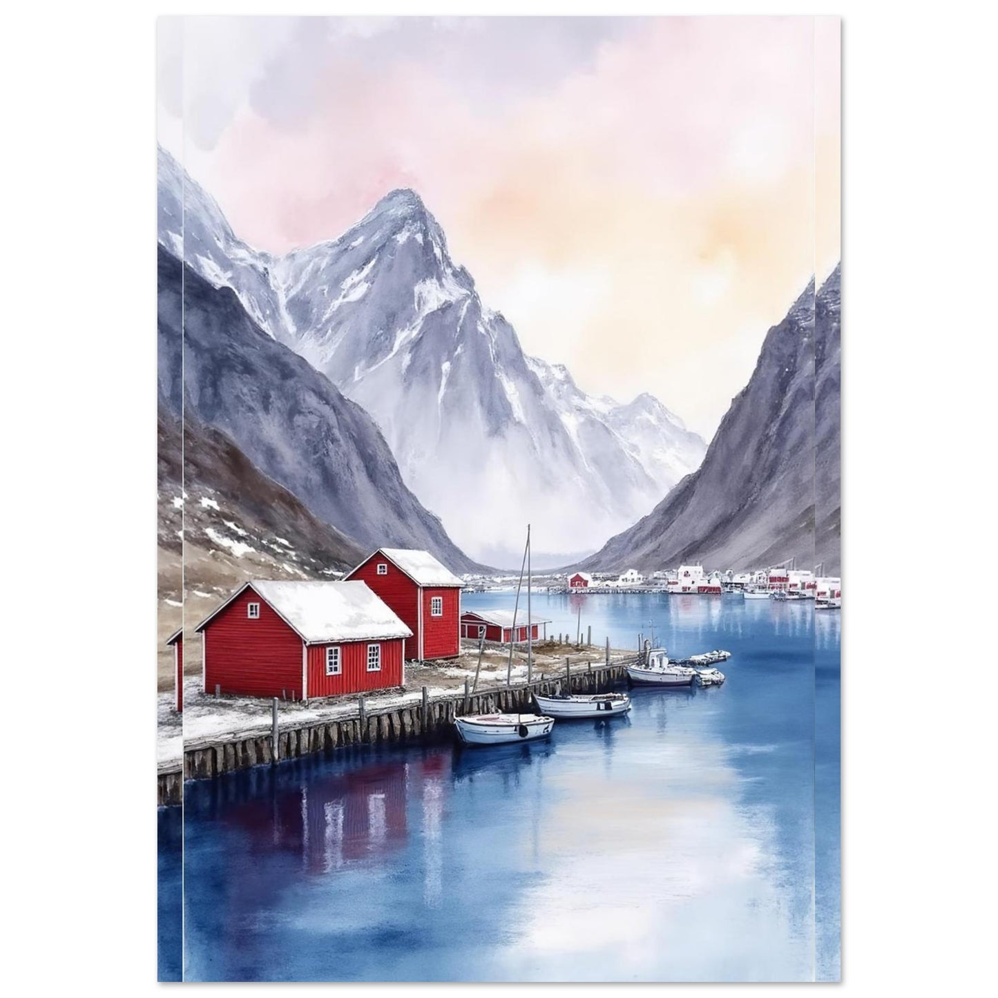 A serene watercolor painting capturing a Norwegian fjord landscape with traditional red fishing houses along wooden piers. Dramatic snow-capped mountains rise majestically in the background, while calm blue waters reflect the peaceful scene. The soft pink and purple sky creates a dreamy, atmospheric mood perfect for wall decor