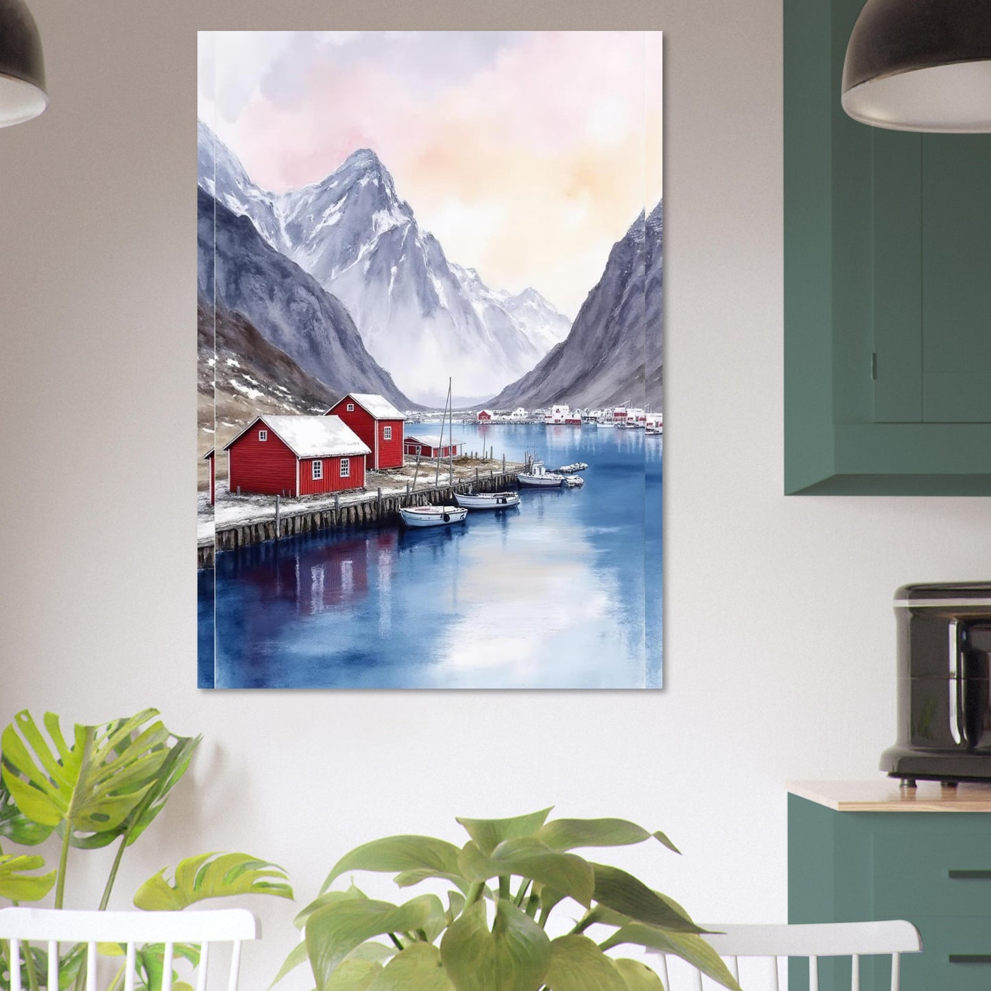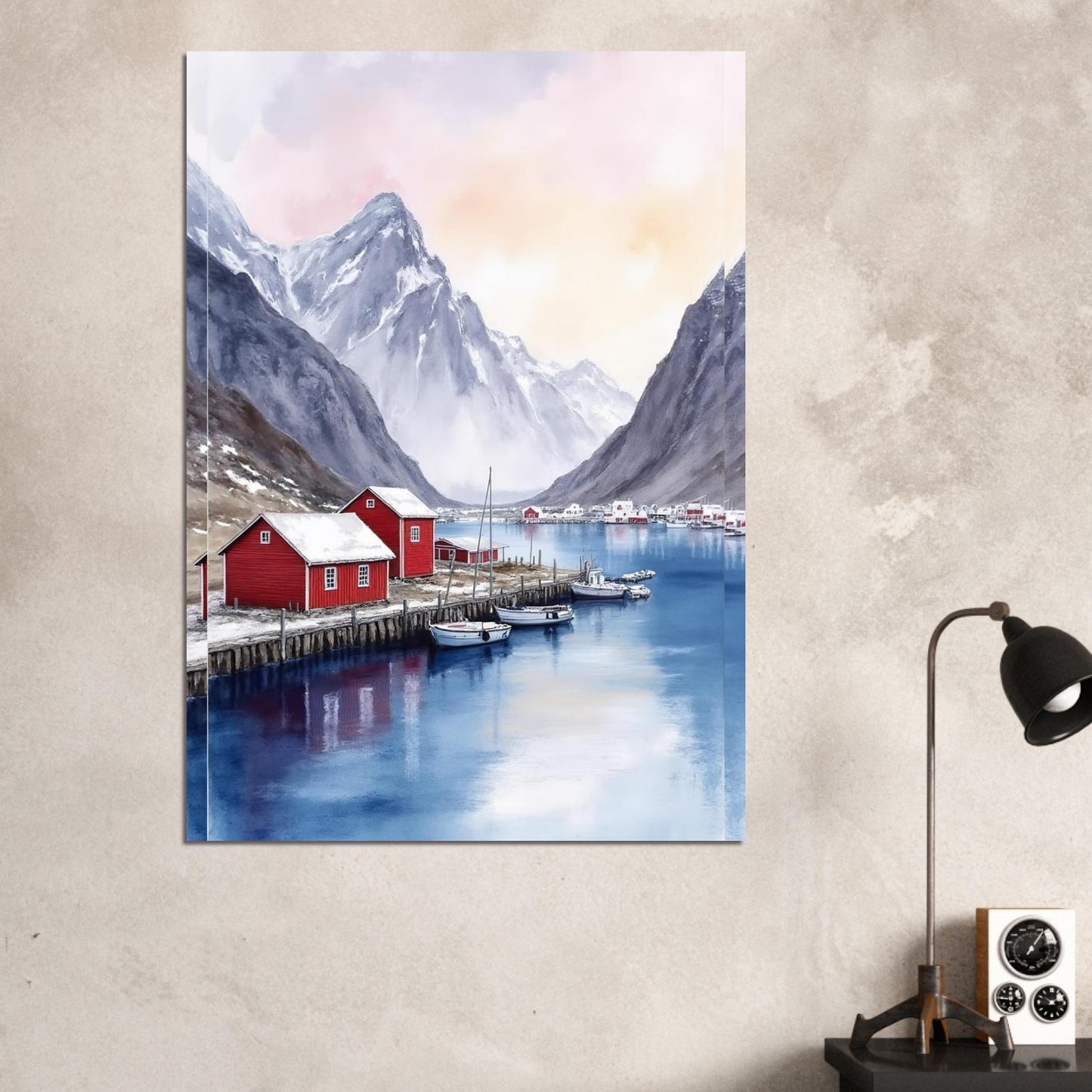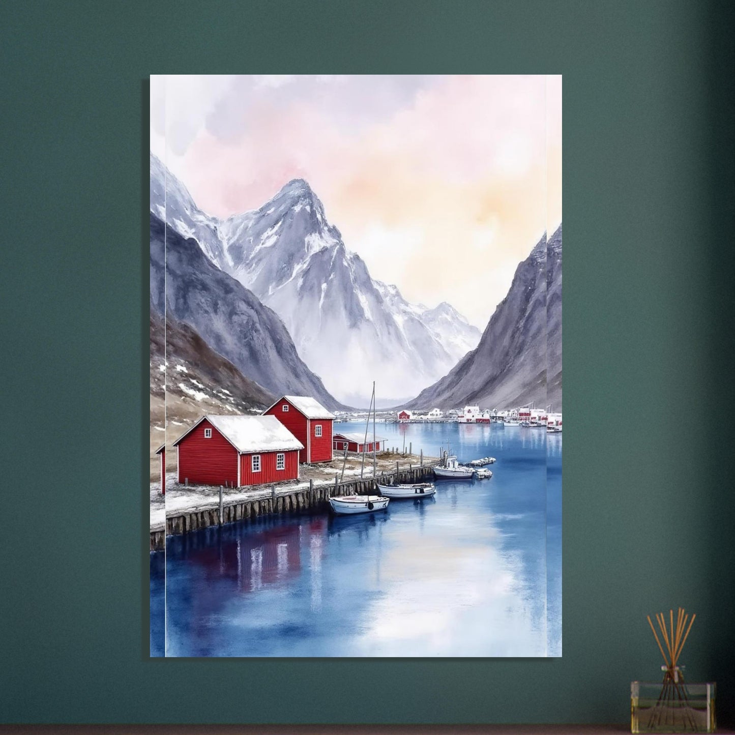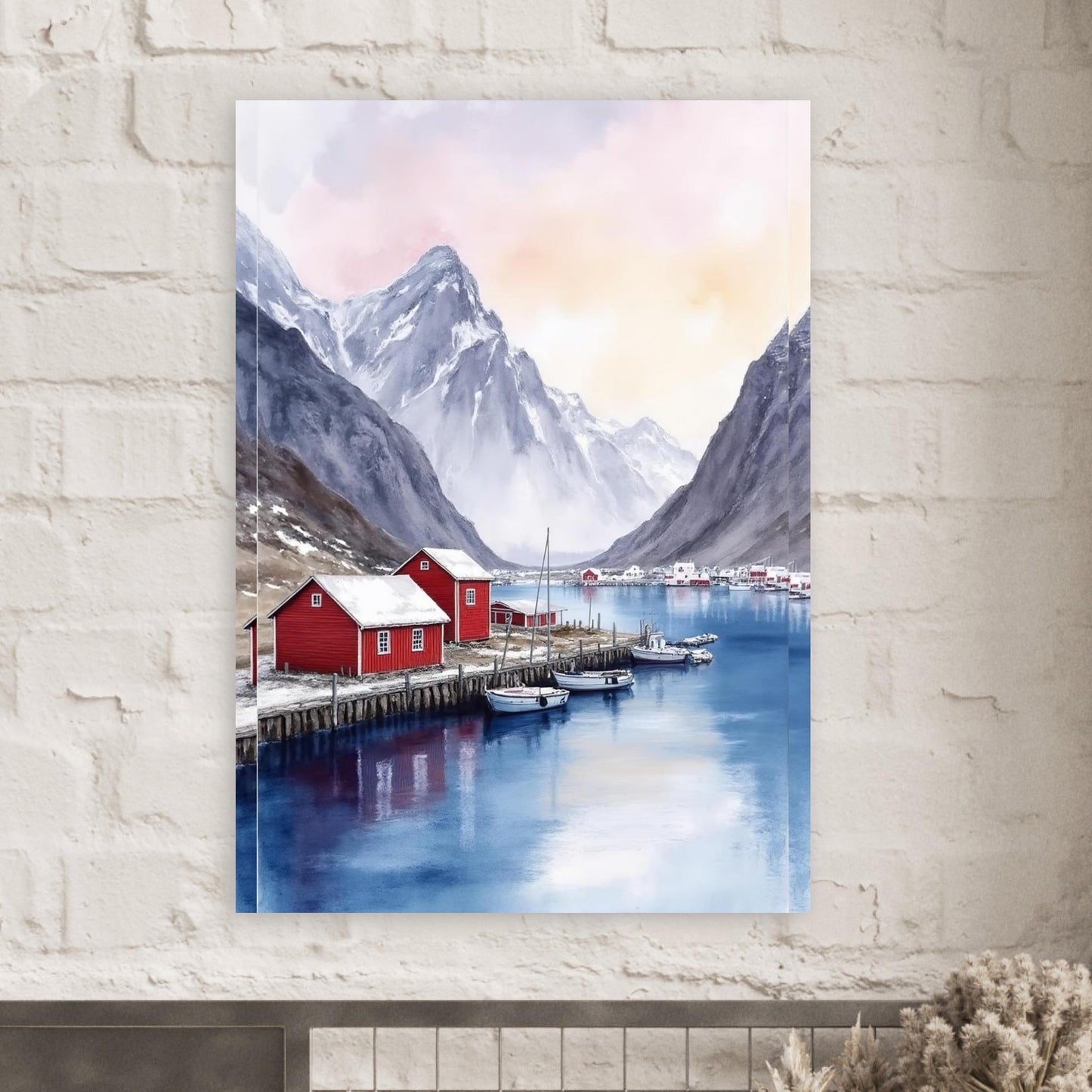 A serene watercolor painting capturing a Norwegian fjord landscape with traditional red fishing houses along wooden piers. Dramatic snow-capped mountains rise majestically in the background, while calm blue waters reflect the peaceful scene. The soft pink and purple sky creates a dreamy, atmospheric mood perfect for wall decor