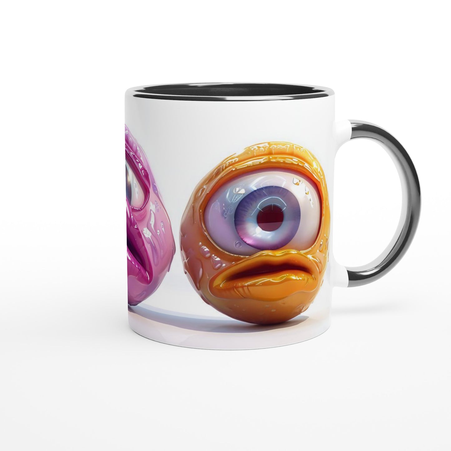 Bold and whimsical design featuring three colorful cyclops characters with expressive faces. Each quirky creature sports a single eye and distinctive lips in vibrant blue, purple, and orange tones. Perfect for fans of unique, playful, and monster-themed drinkware with a modern pop art twist