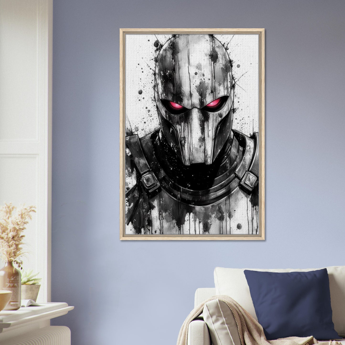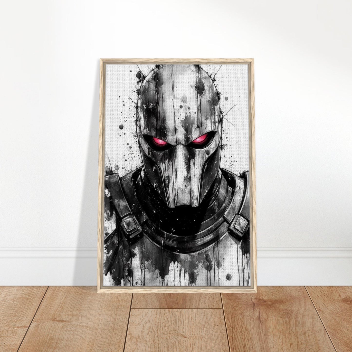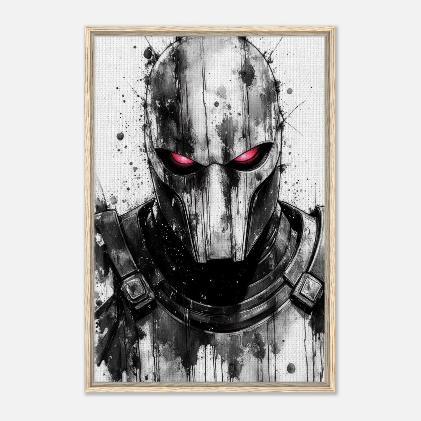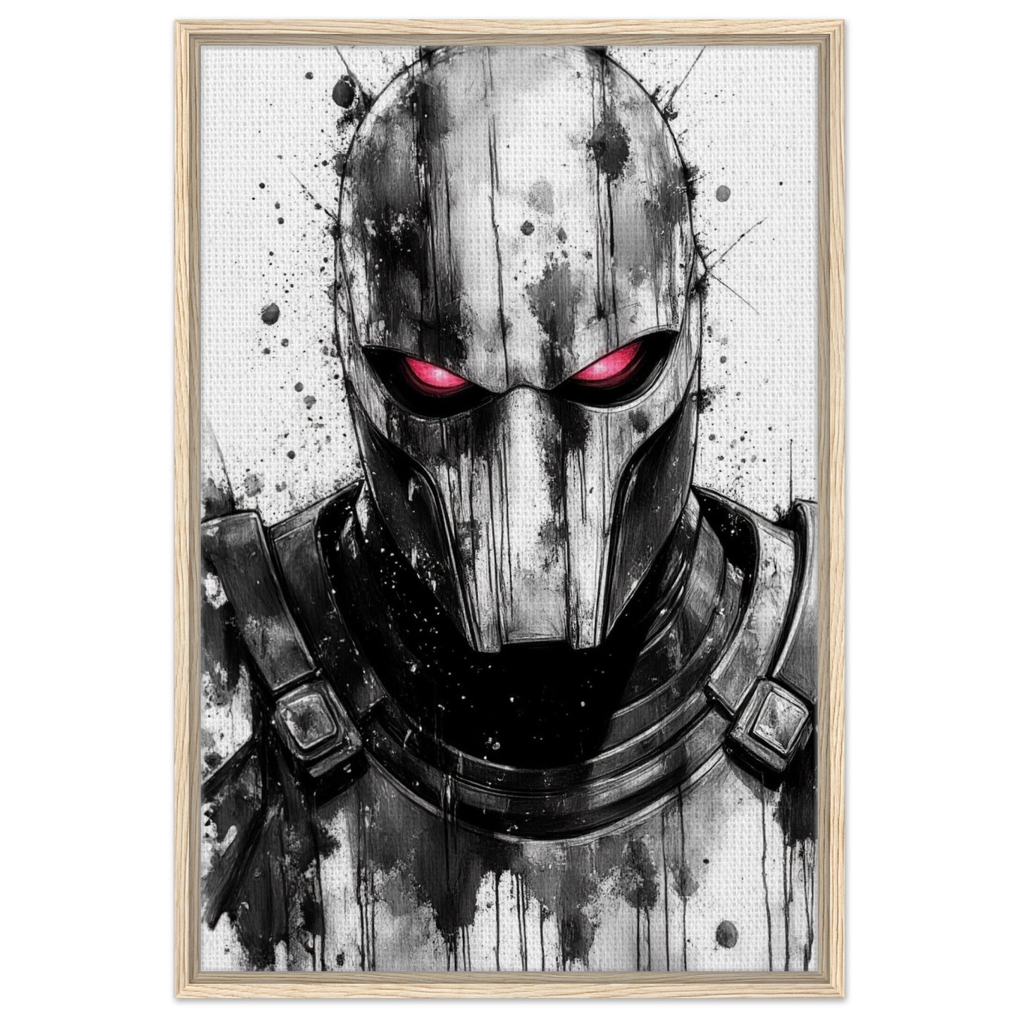 Dramatic black and white ink illustration featuring a menacing masked vigilante with striking red eyes. Bold watercolor splatter effects and dripping technique create an intense, noir atmosphere. The monochromatic palette with red accent delivers a powerful contrast that captures the dark essence of this anti-hero character