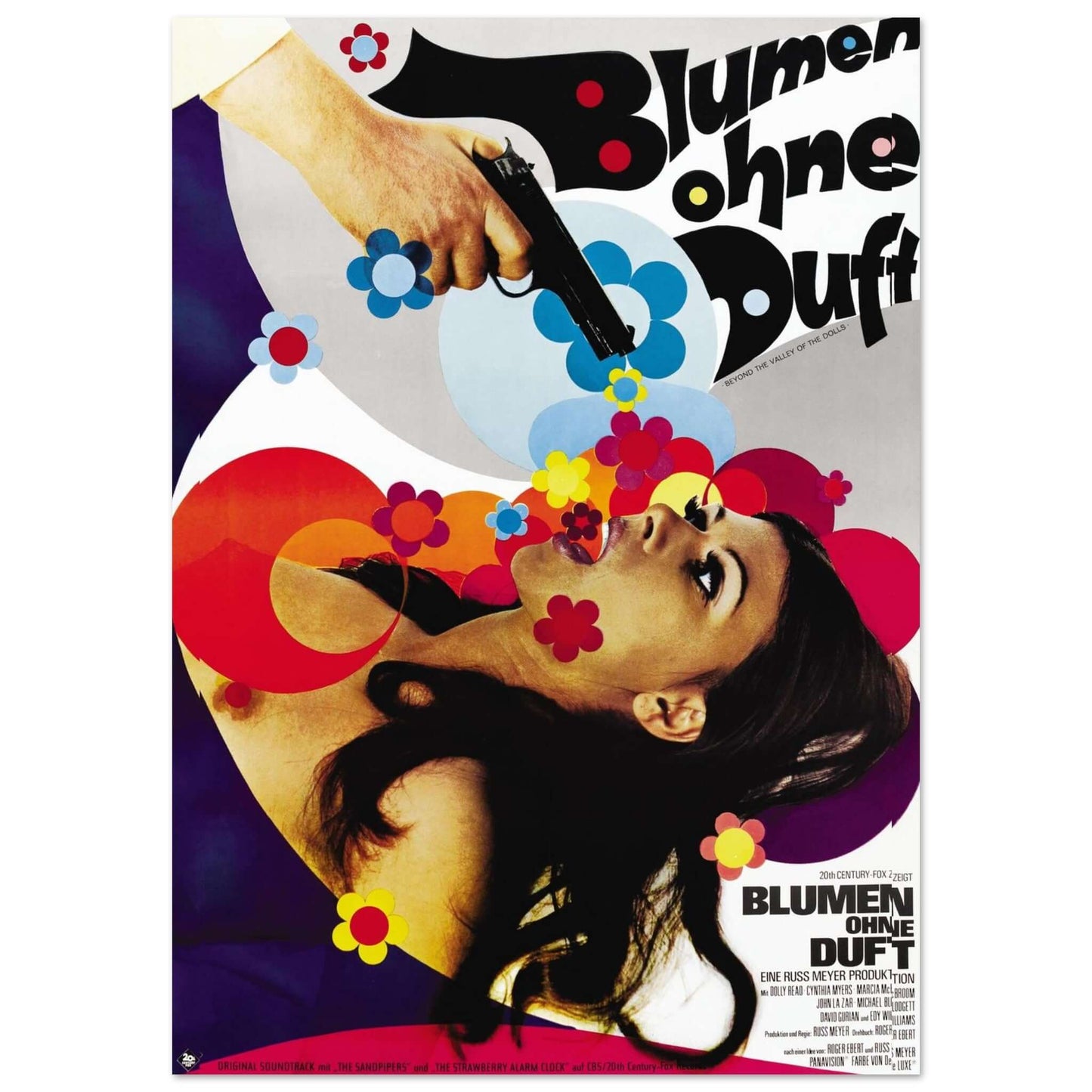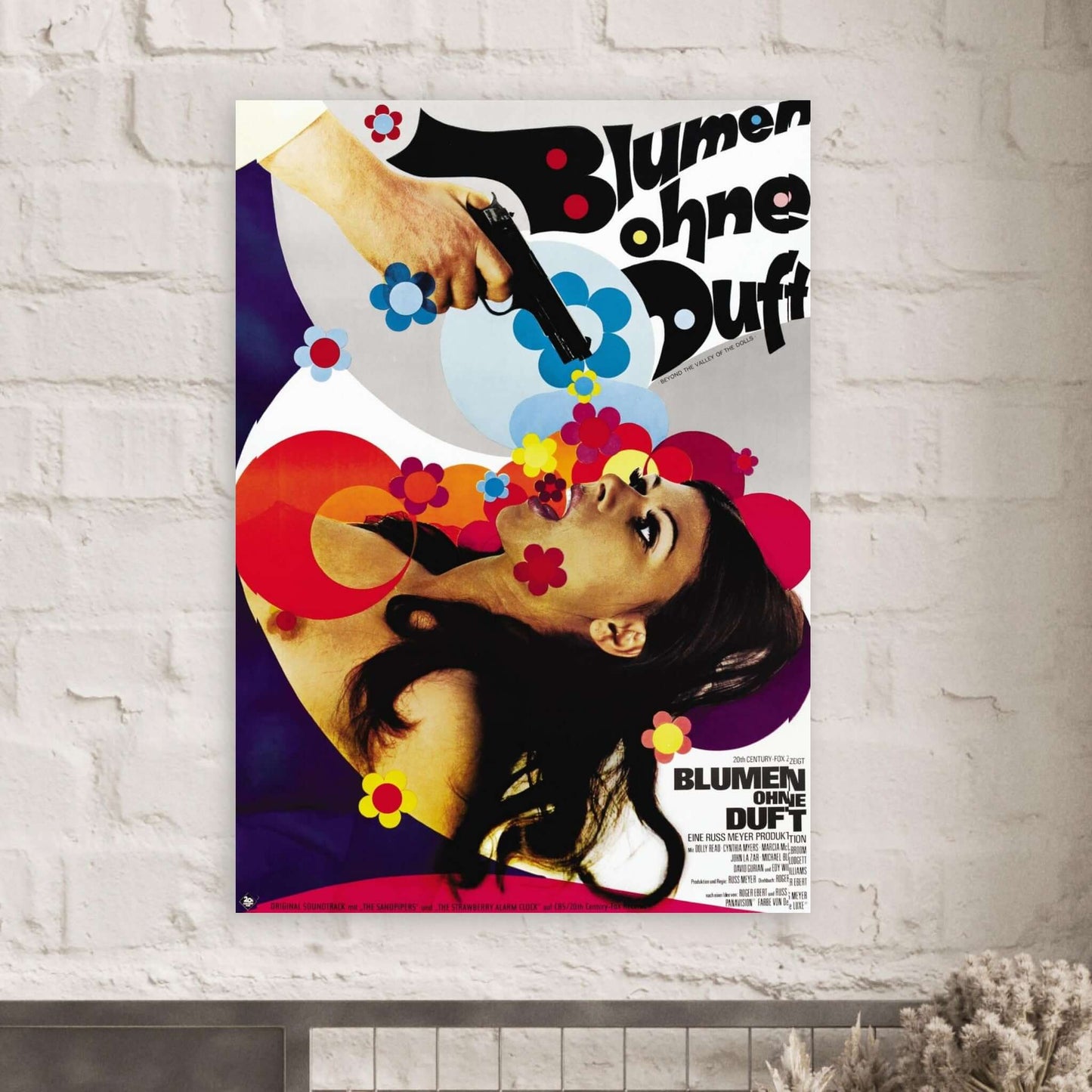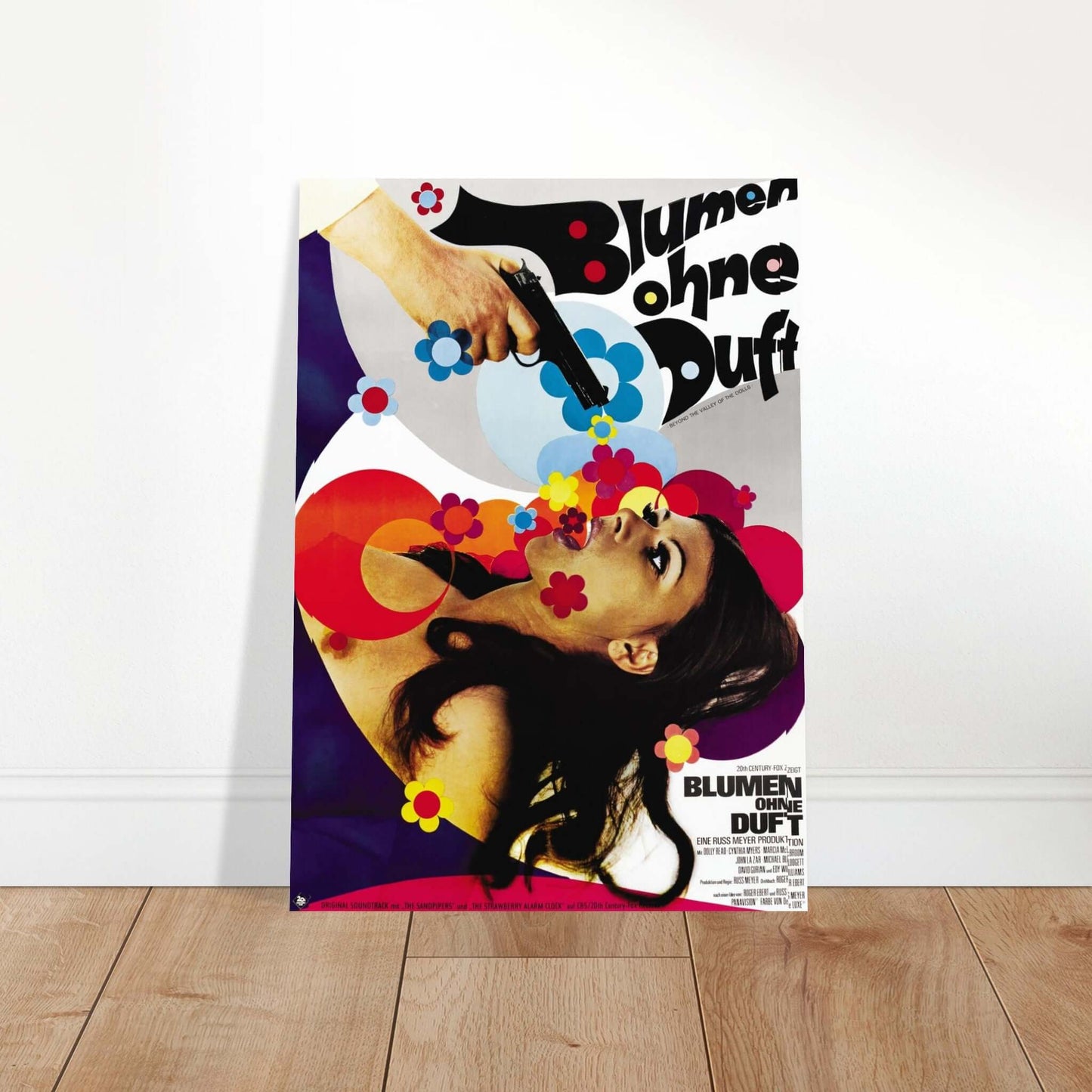 A striking vintage movie poster design featuring bold psychedelic elements and retro floral motifs. The composition combines vibrant reds, yellows, and purples with whimsical flower graphics against a grayscale background. The dramatic contrast and avant-garde 1960s aesthetic create a powerful visual statement perfect for film enthusiasts and vintage art collectors.