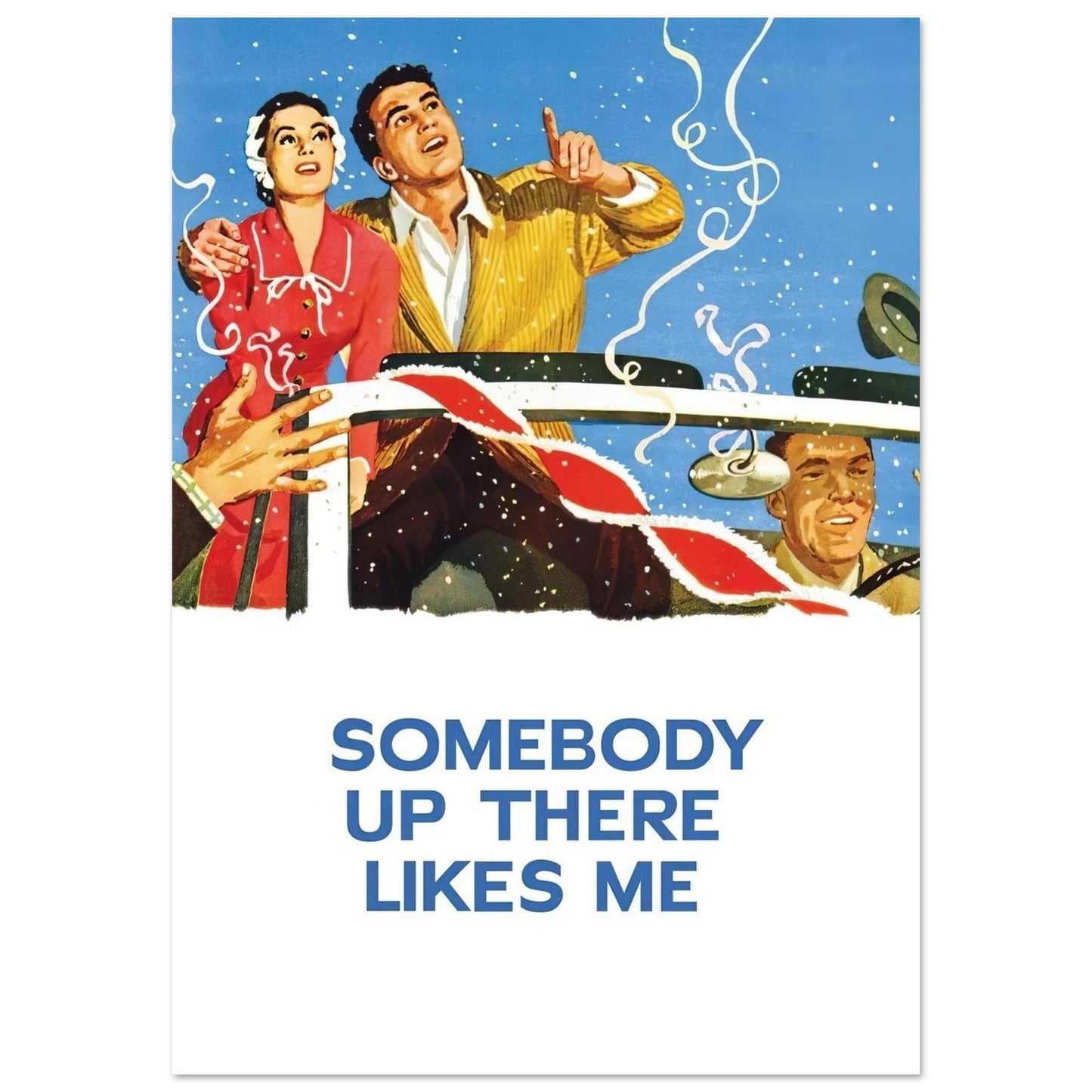 A vibrant mid-century advertising illustration capturing a joyful celebration moment. Features a dynamic composition with people celebrating against a bright blue sky with white streamers. The artwork showcases classic 1950s commercial art style with bold colors and optimistic energy that defined the era's advertising aesthetic