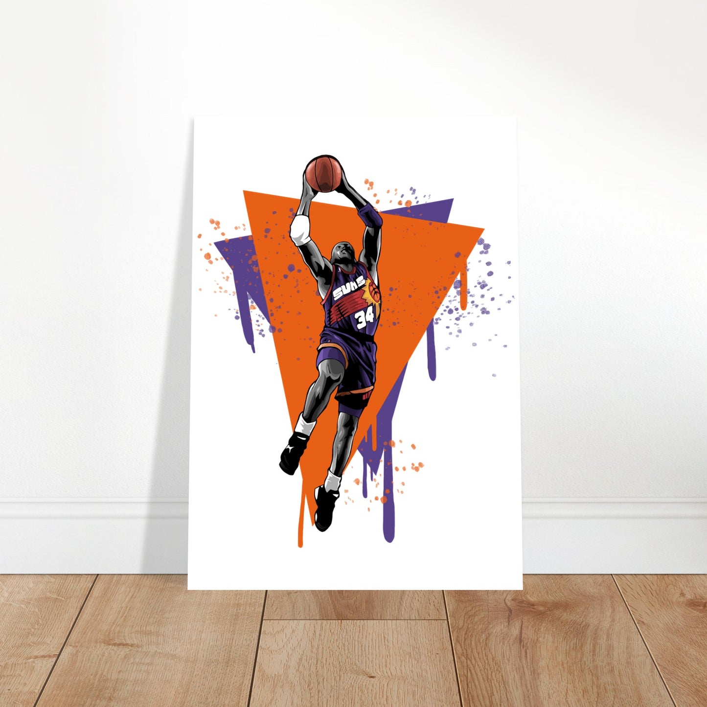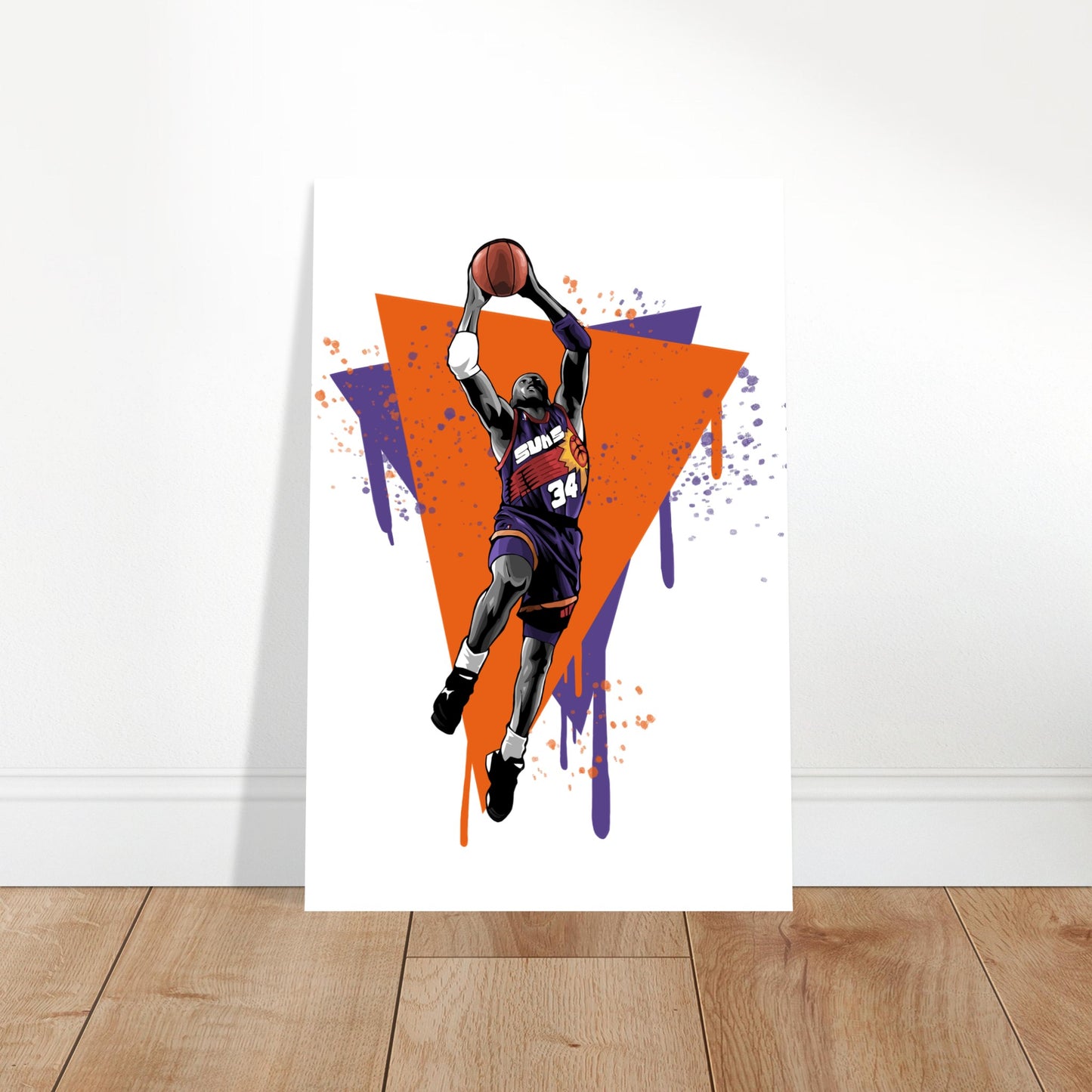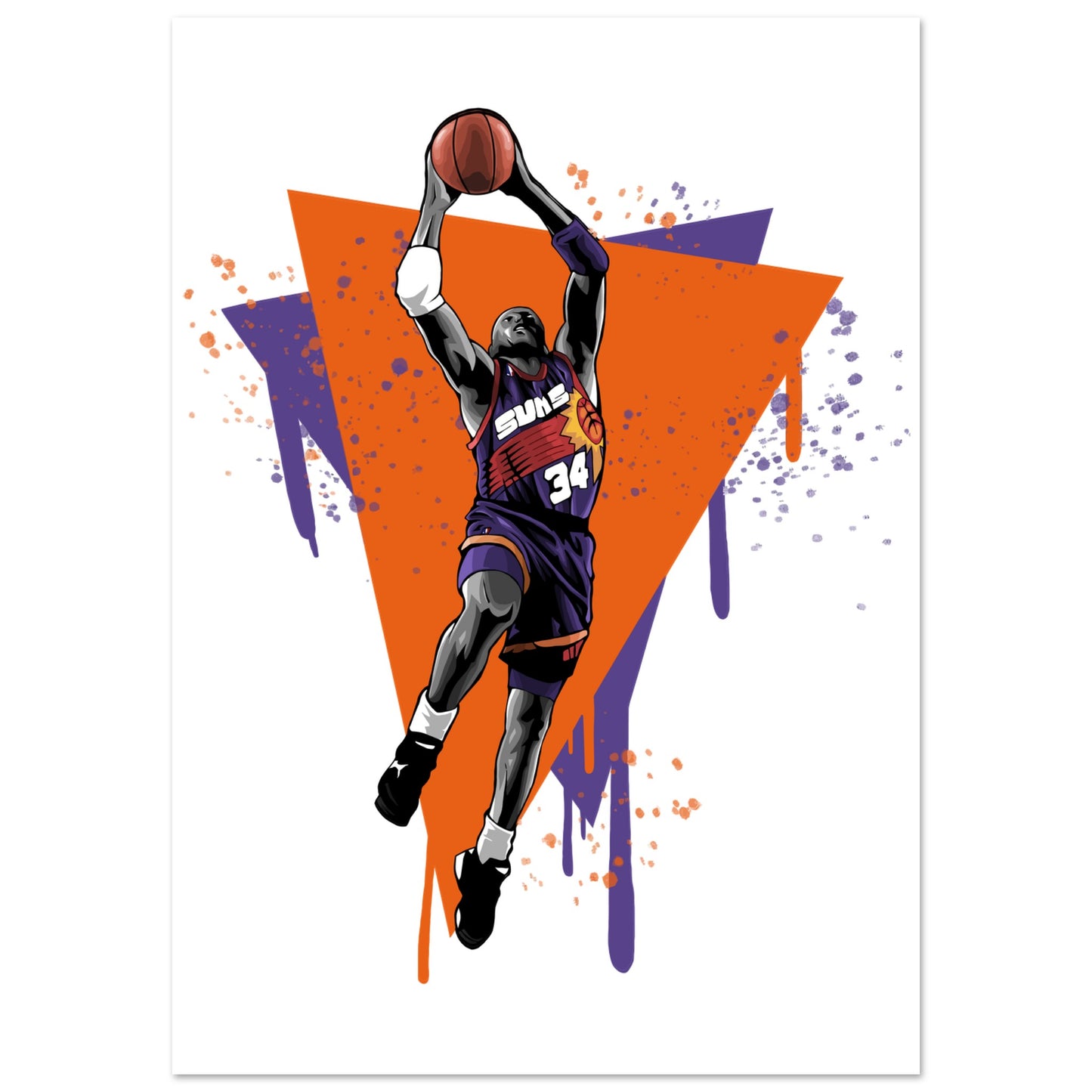 Dynamic illustration featuring a basketball player in mid-flight against vibrant orange and purple geometric background. Bold artistic style with paint drip effects captures the explosive energy of a slam dunk. Perfect for sports fans and basketball enthusiasts who appreciate retro-inspired athletic art