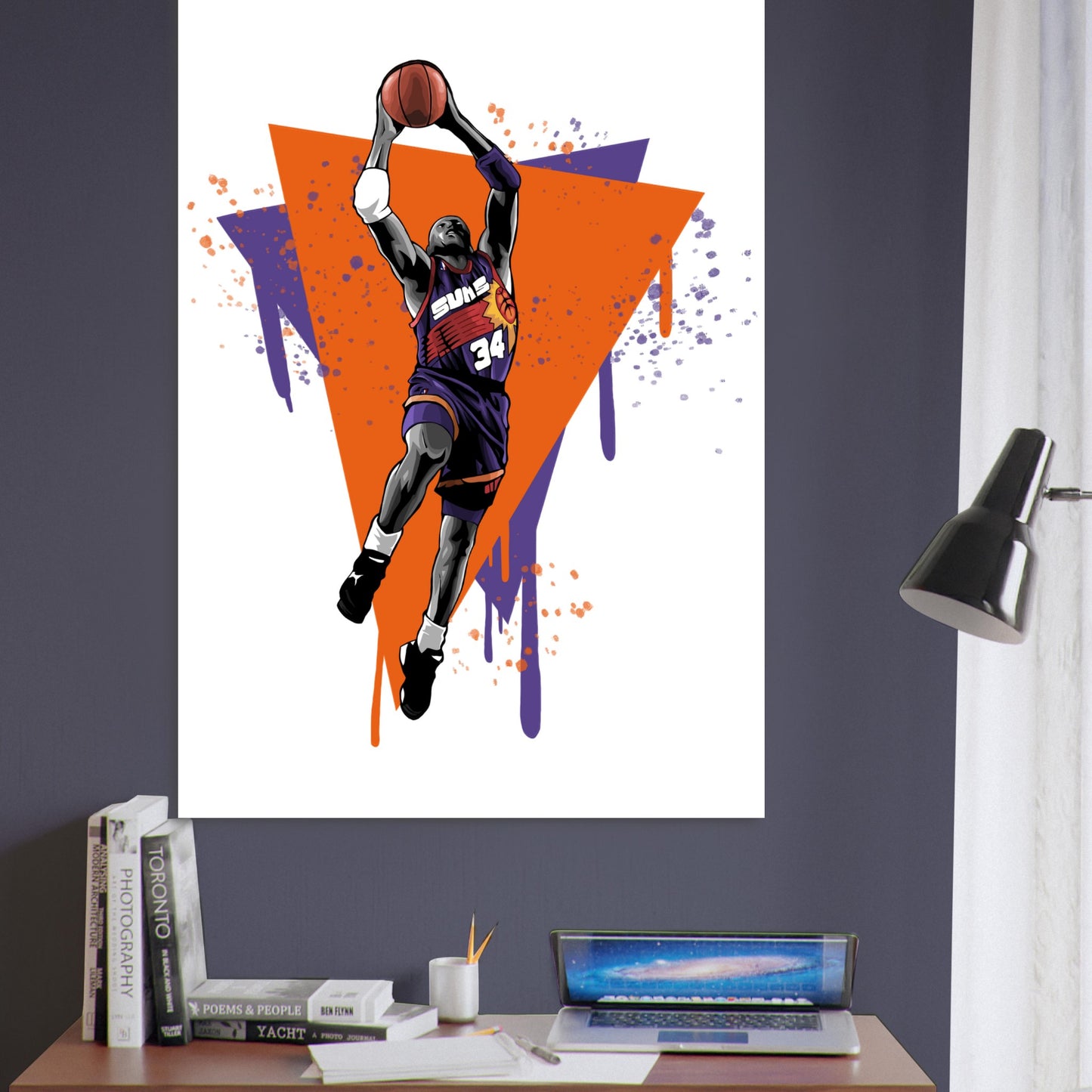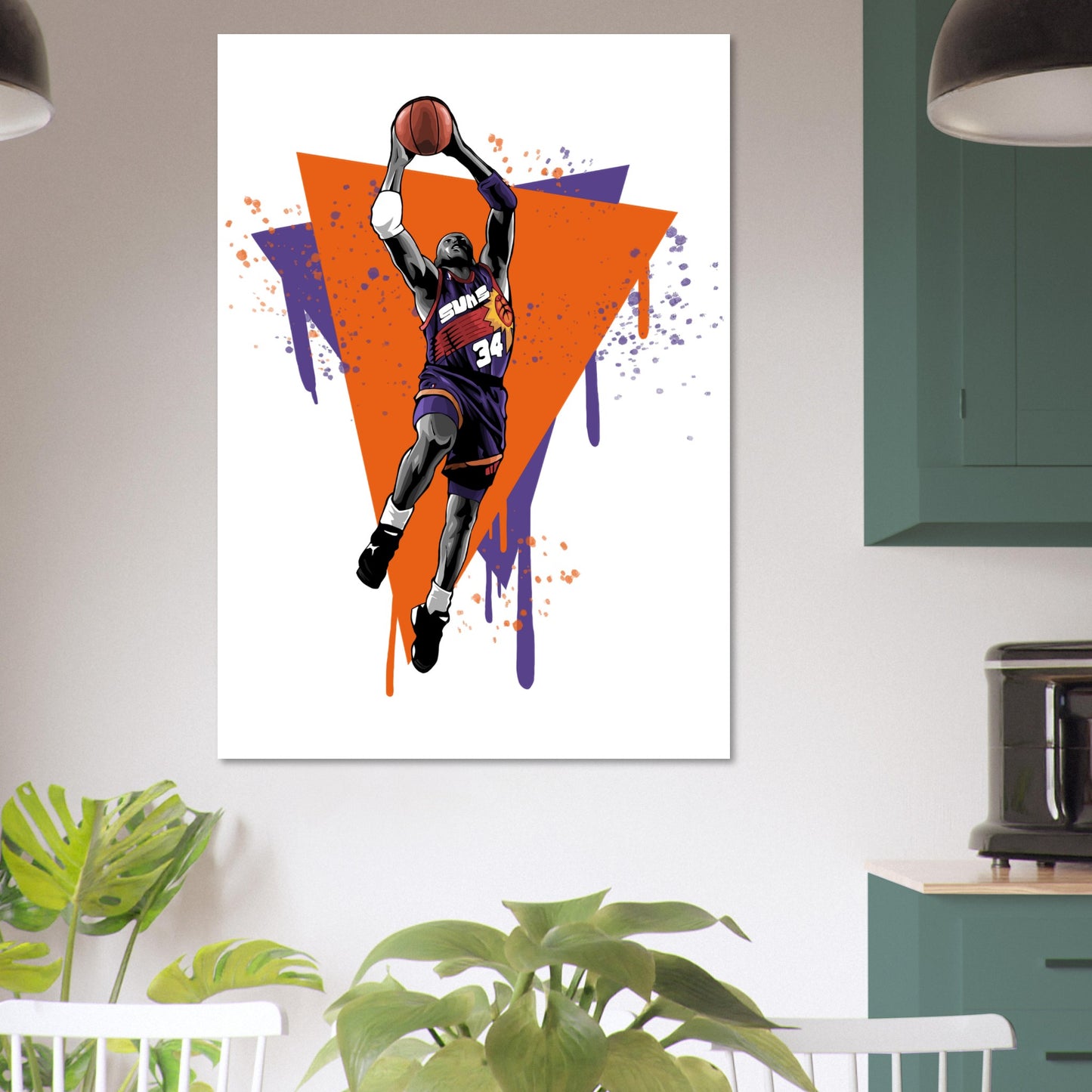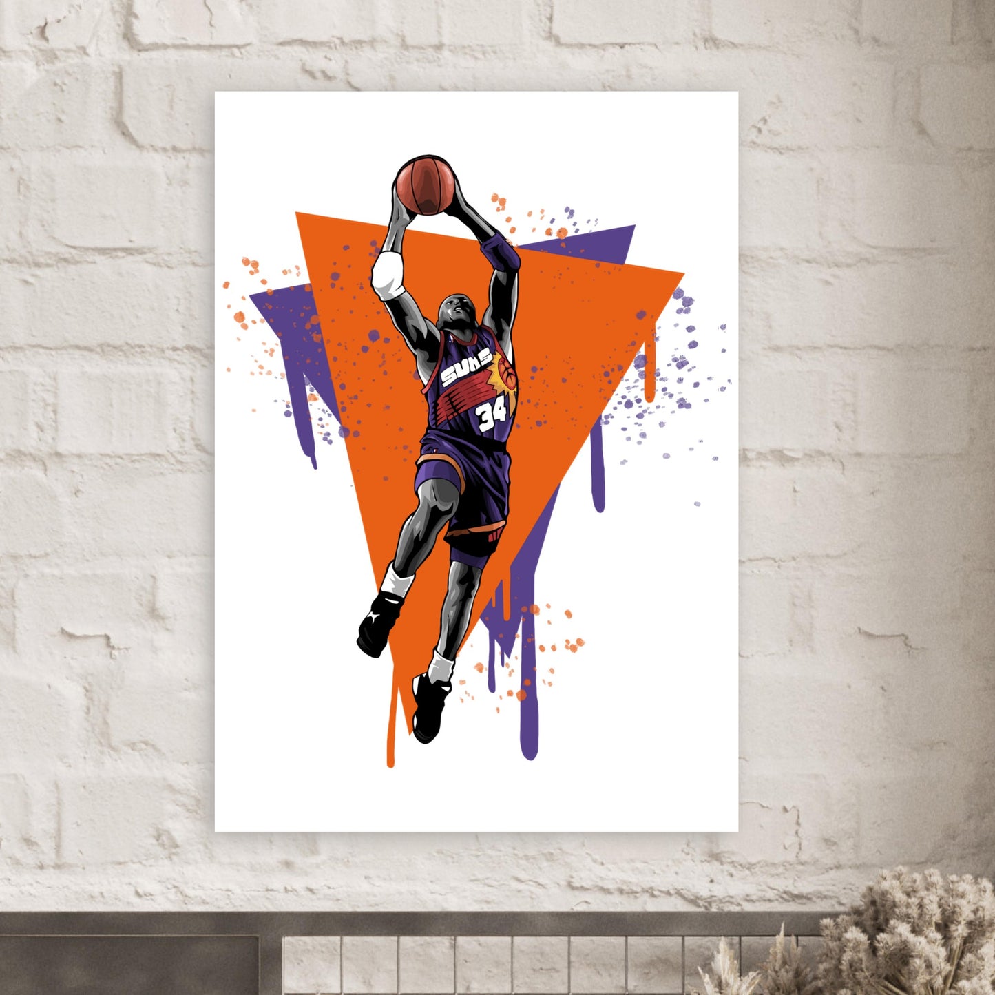 Dynamic illustration featuring a basketball player in mid-flight against vibrant orange and purple geometric background. Bold artistic style with paint drip effects captures the explosive energy of a slam dunk. Perfect for sports fans and basketball enthusiasts who appreciate retro-inspired athletic art