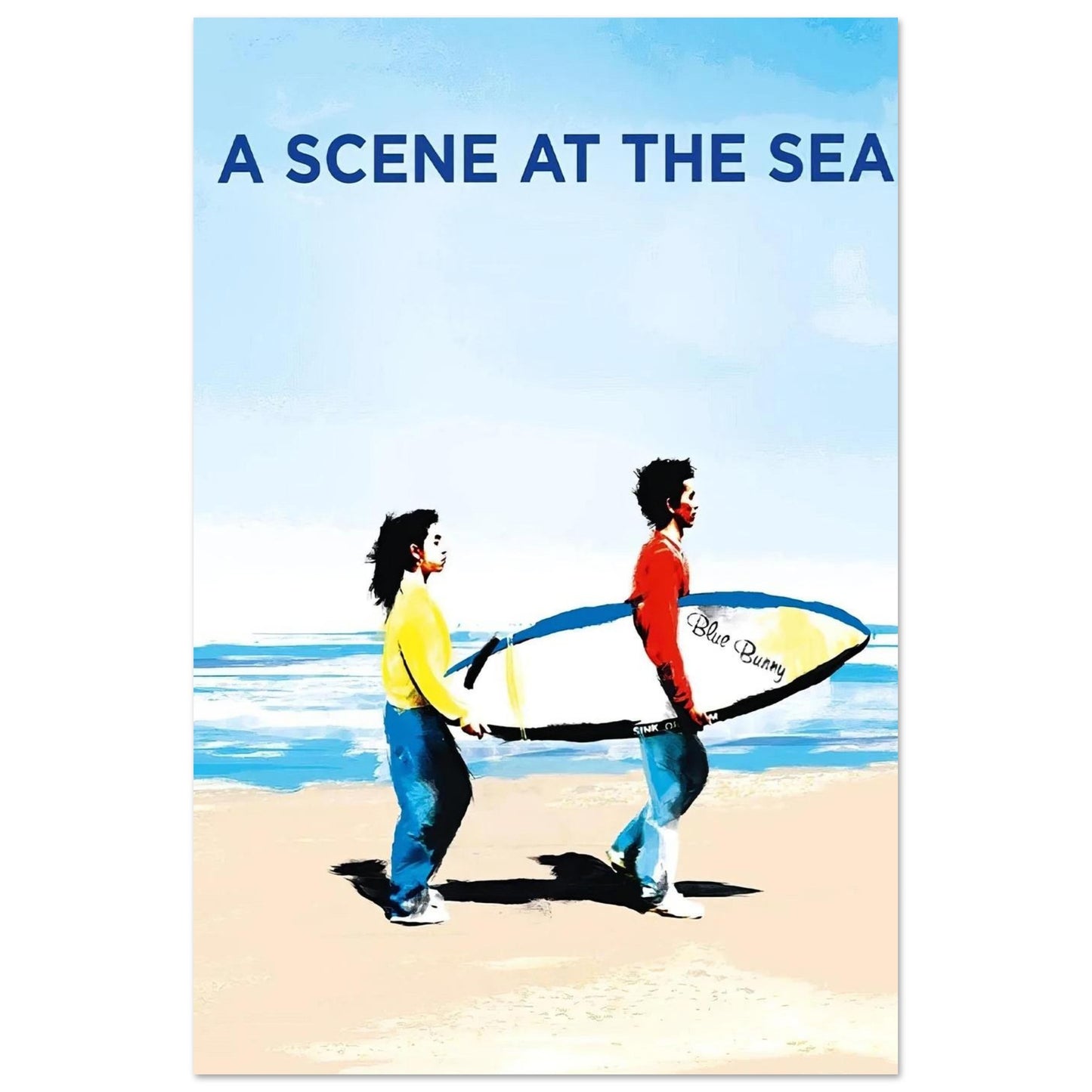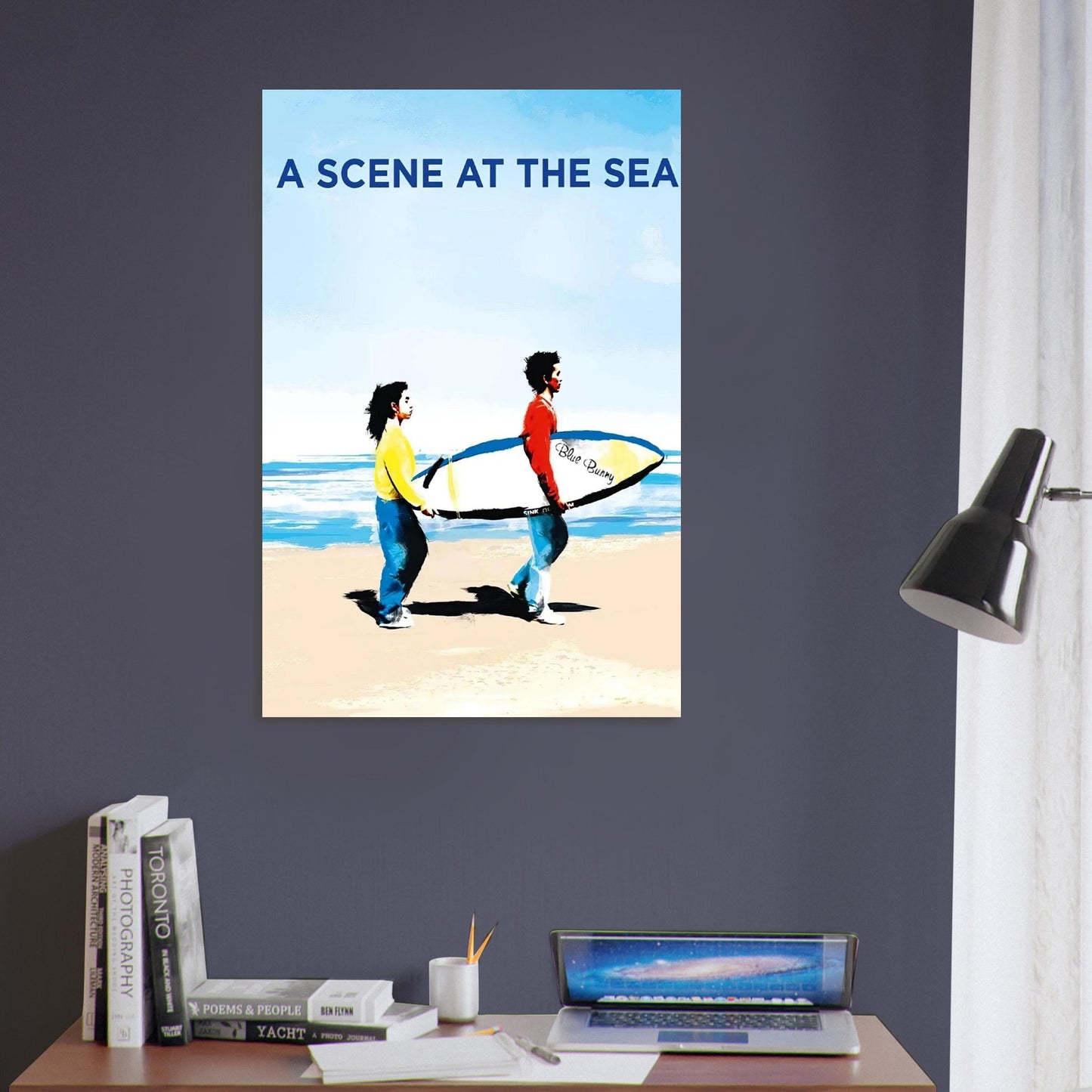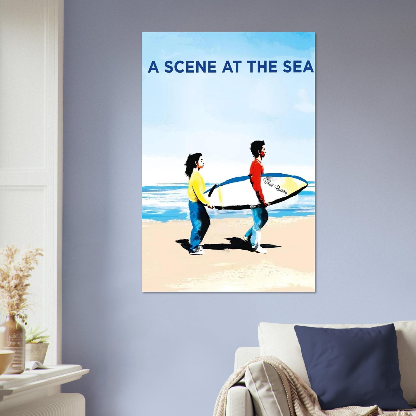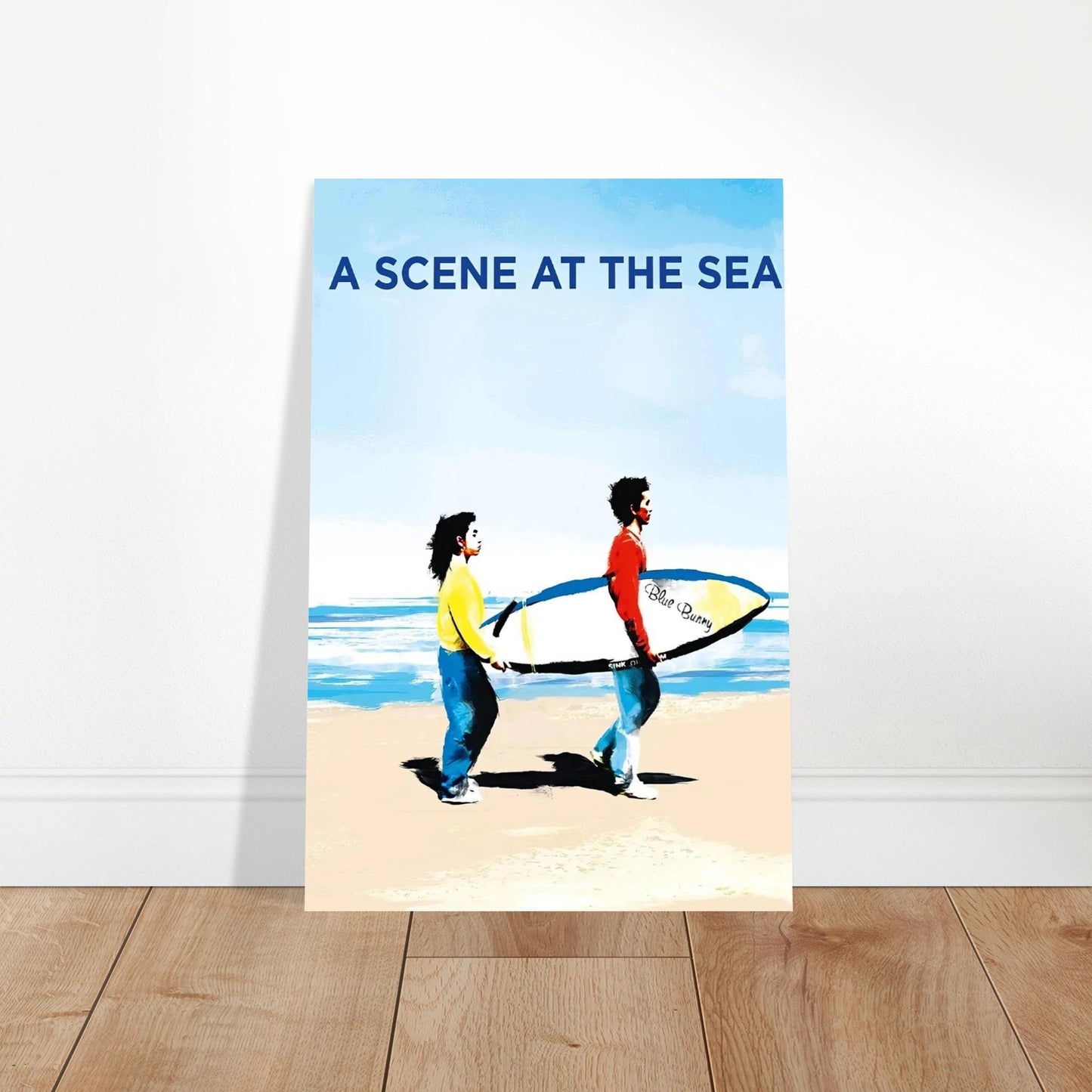 A charming watercolor illustration capturing two surfers on a sun-drenched beach. The artwork features bold, simple shapes and a vibrant color palette with a red and yellow tops against deep blue water and sandy beach. The minimalist style creates a nostalgic, retro beach vibe perfect for coastal-themed decor