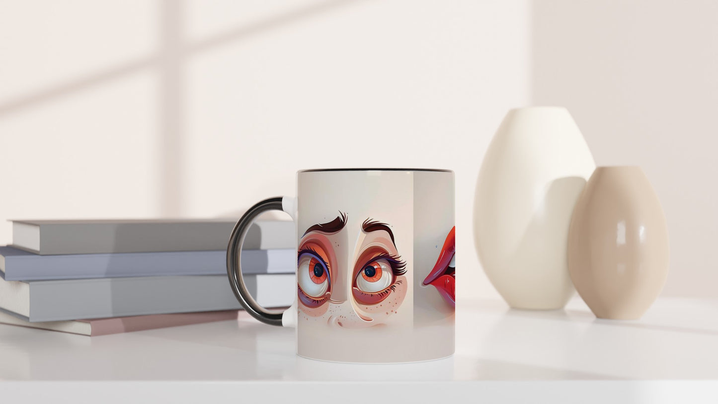 This beautiful ceramic mug is perfect for any event of the day. Your morning coffee, a hot chocolate, or any other hot beverage you enjoy. The mug is glossy white with a colored rim, inside, and handle. The prints come out beautifully and vividly on it. The print retains its quality and luster when used in both microwaves and the dishwasher.