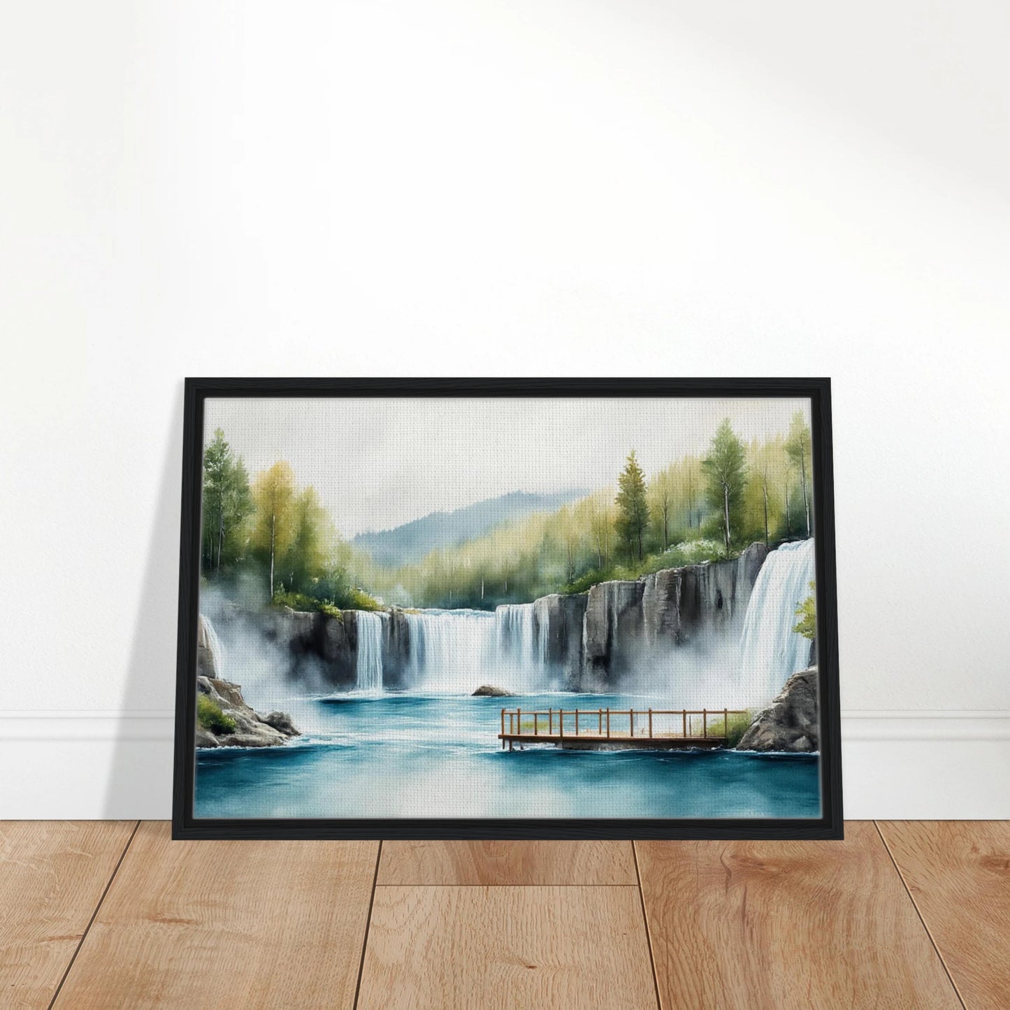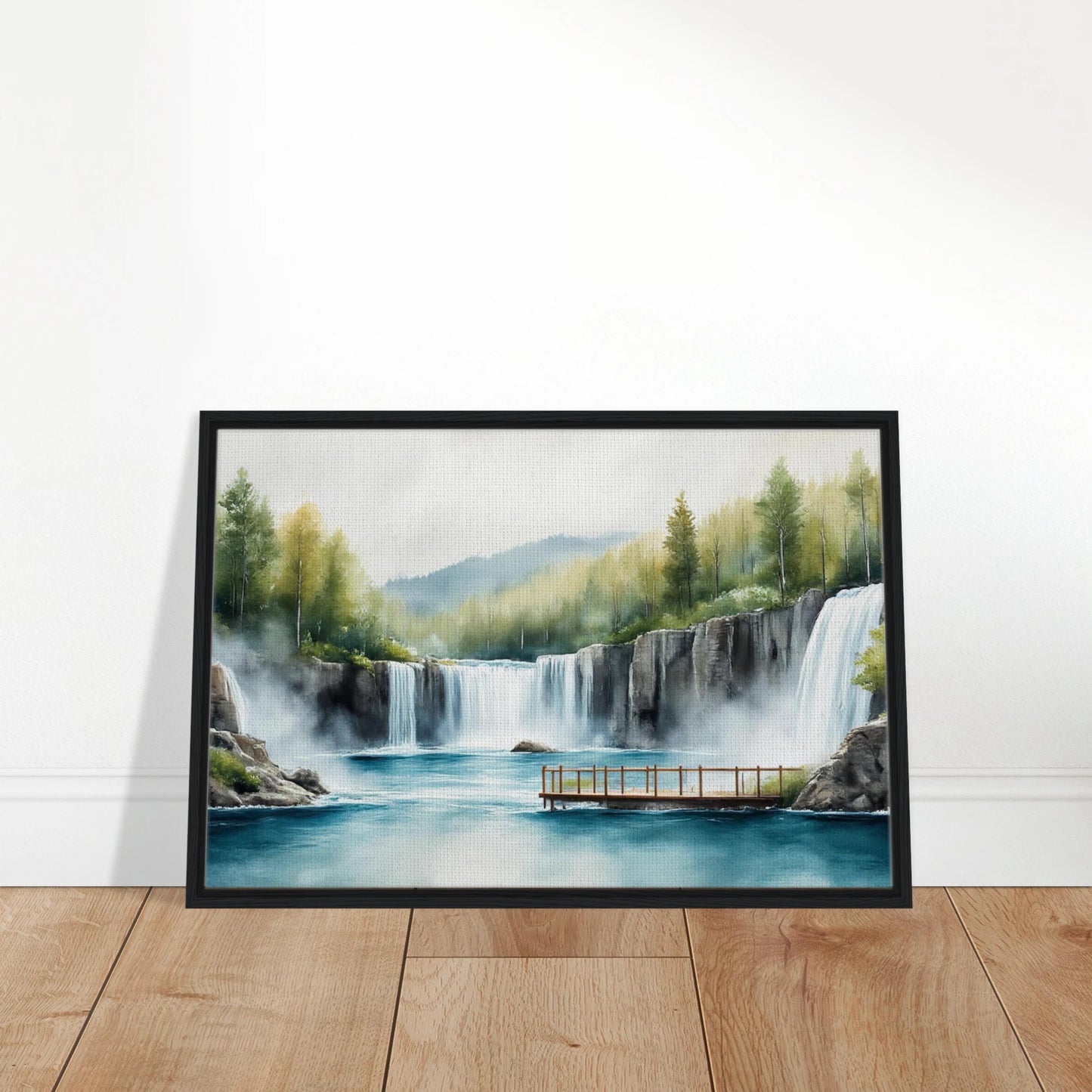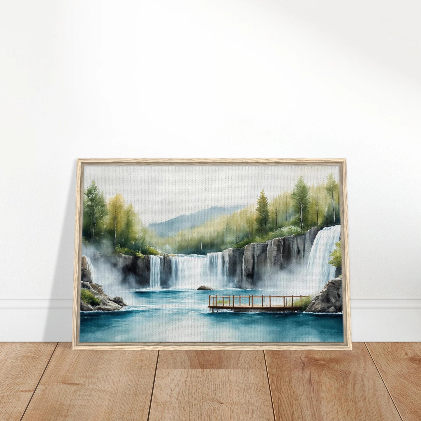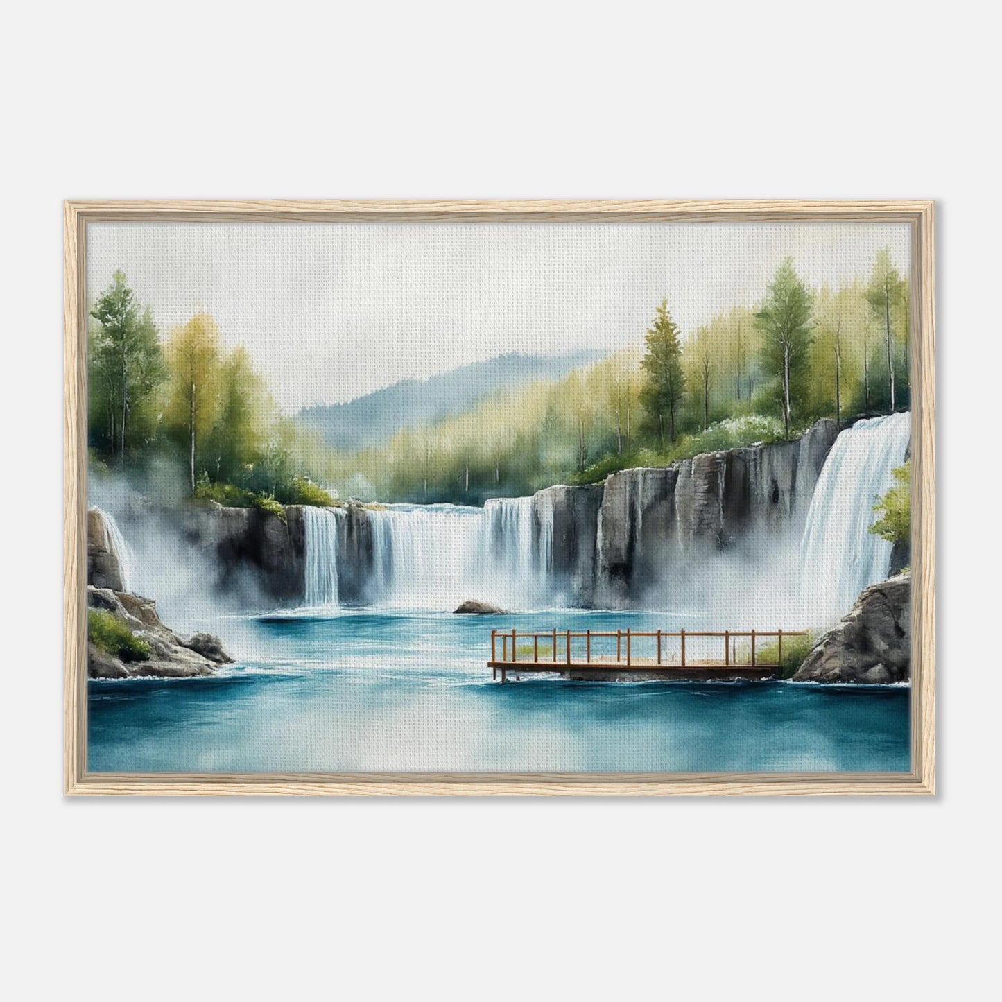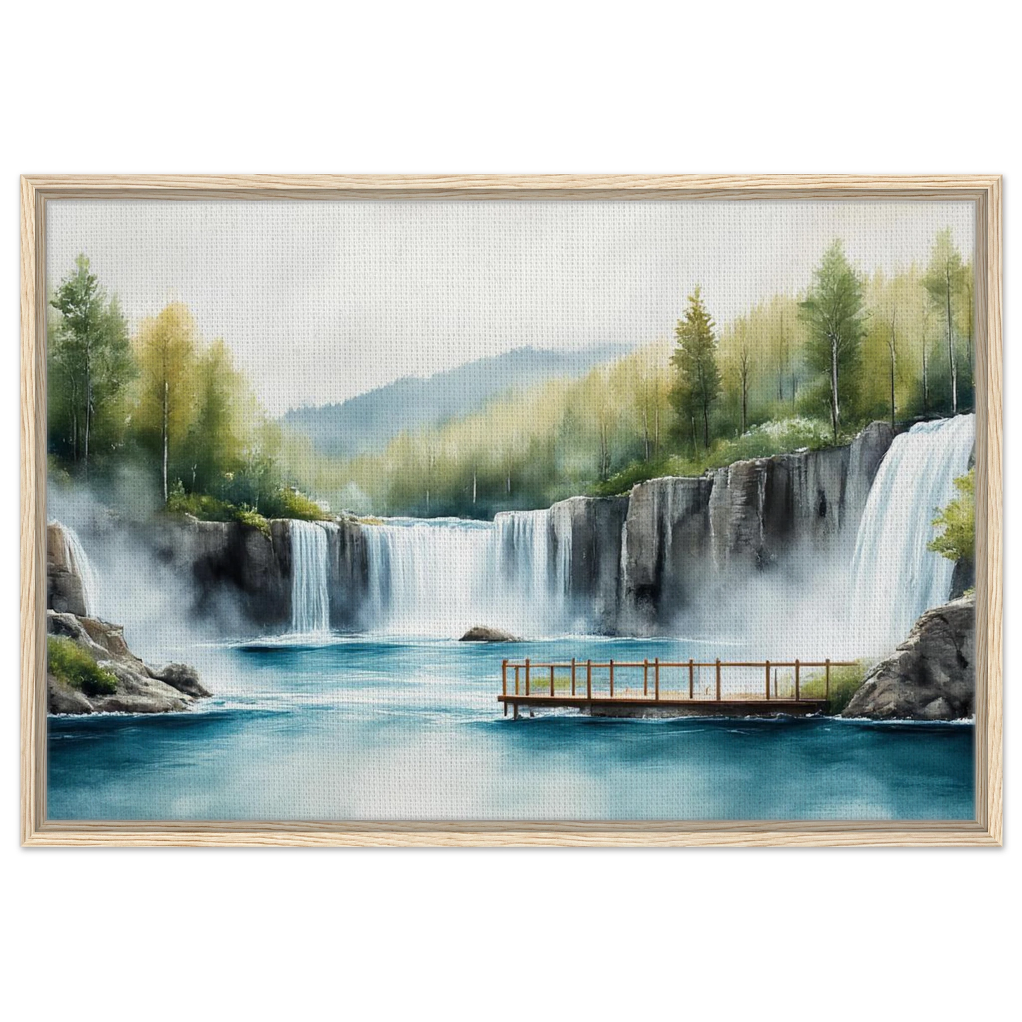 A tranquil watercolor landscape featuring majestic waterfalls cascading into a turquoise blue lake. The scene includes a wooden viewing deck, autumn-touched trees, and misty atmosphere. Soft, natural colors blend evergreen forest, golden foliage, and dramatic rocky cliffs in a peaceful wilderness setting