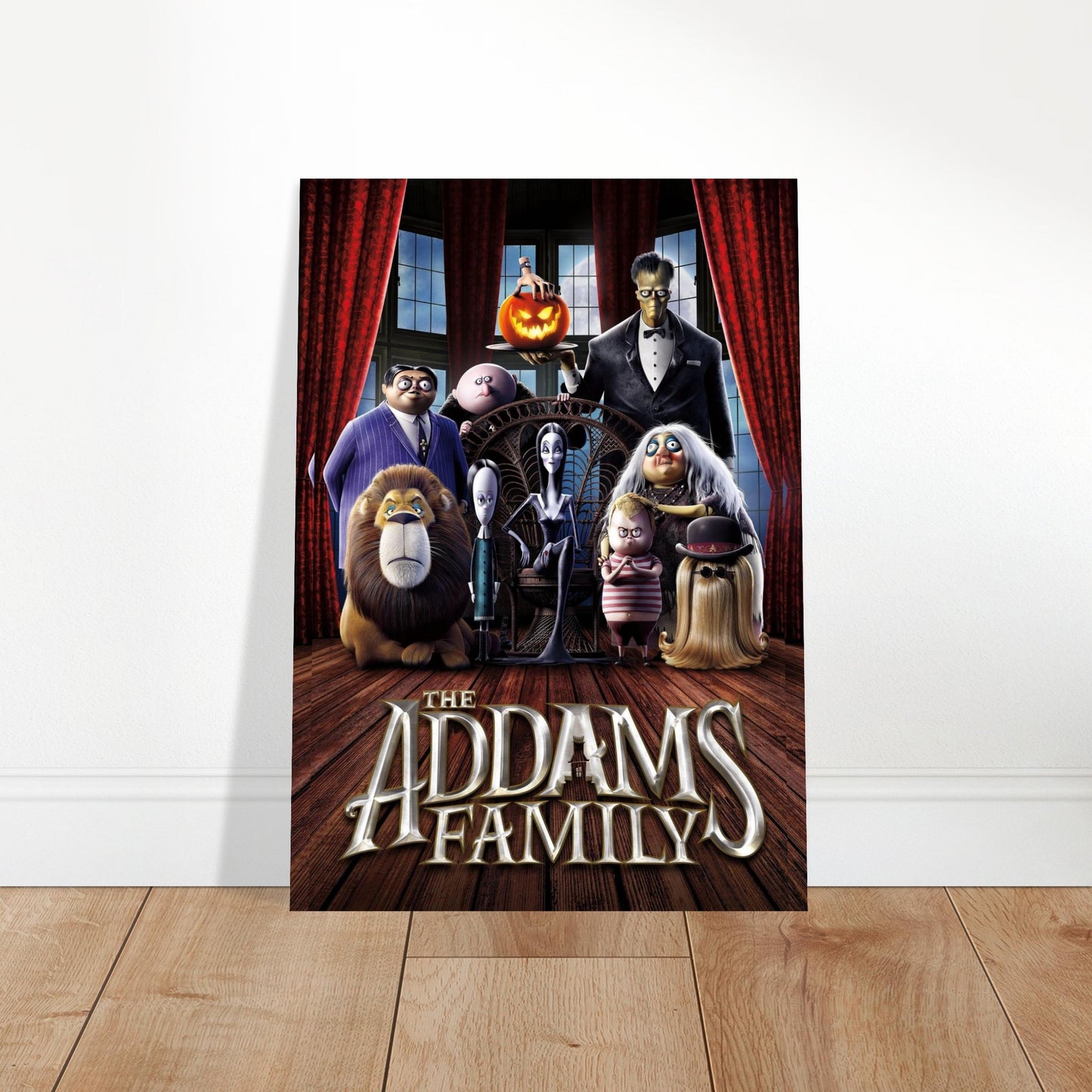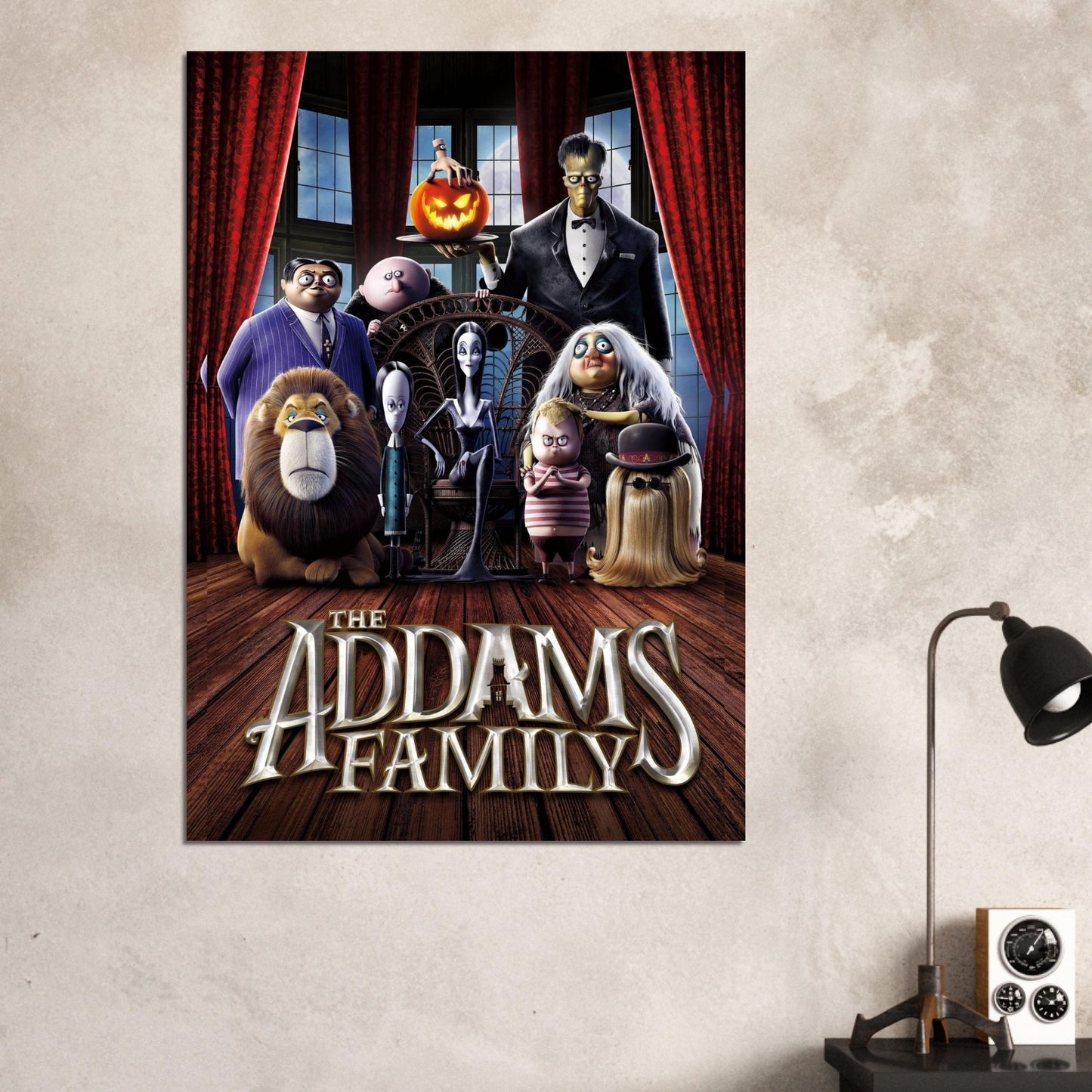 A darkly charming animated poster featuring the iconic Addams Family characters in their spooky mansion setting. Rich burgundy curtains frame the scene, with a glowing jack-o'-lantern adding an eerie orange glow. The gothic aesthetic combines humor with classic horror elements, perfect for fans of the beloved macabre family