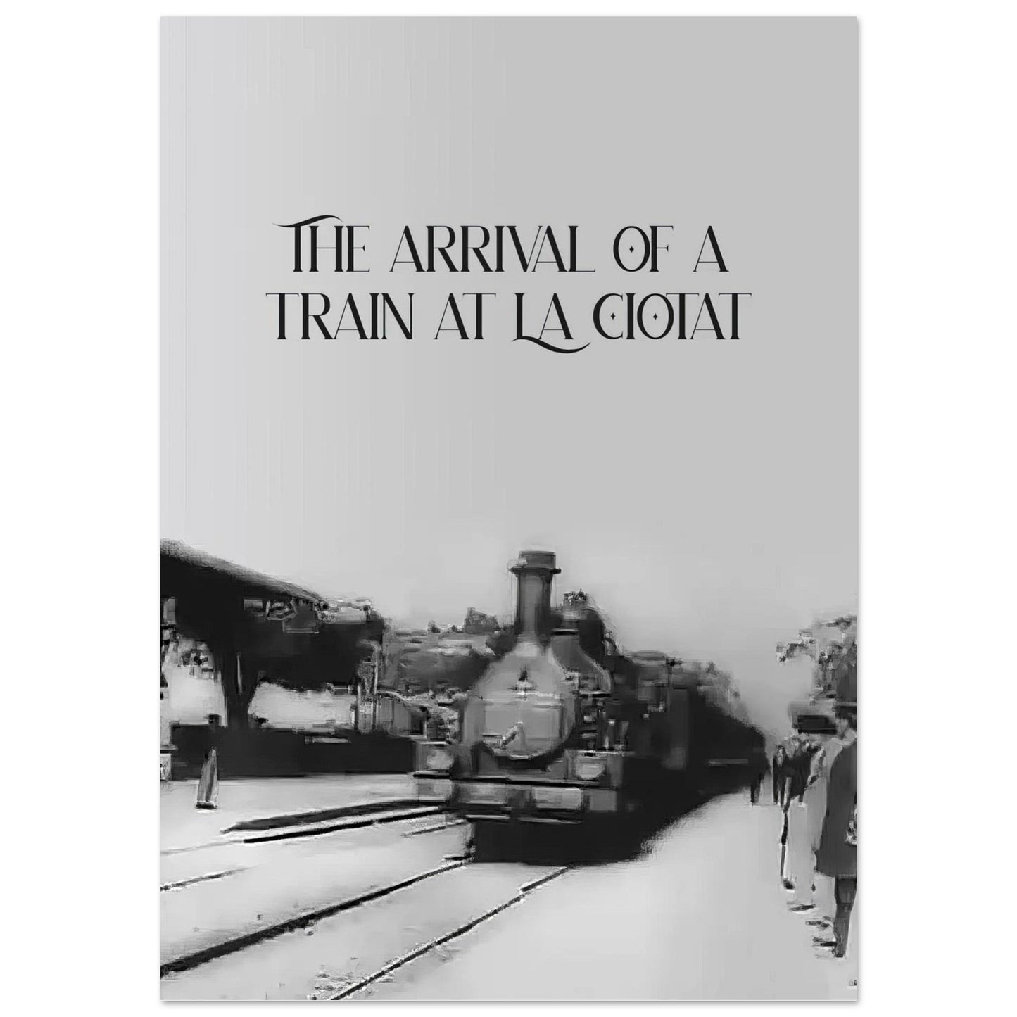 A striking black and white historic photograph capturing the dramatic arrival of a steam locomotive at La Ciotat station. This iconic early cinema image shows the steam engine emerging through misty atmosphere, with period-dressed passengers waiting on the platform. The composition creates a powerful sense of movement and historical atmosphere