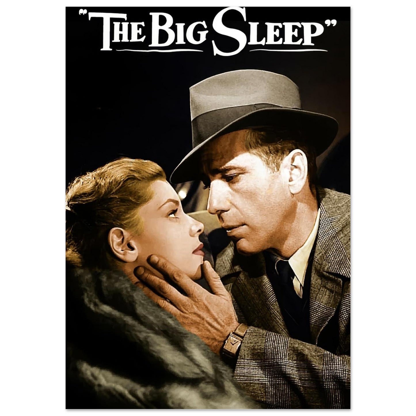 Dramatic noir movie poster featuring an intimate scene from the 1946 classic 'The Big Sleep'. Set against a dark background, the image captures an intense moment with dramatic lighting and classic film noir styling. The composition showcases the iconic fedora hat and elegant period costume details