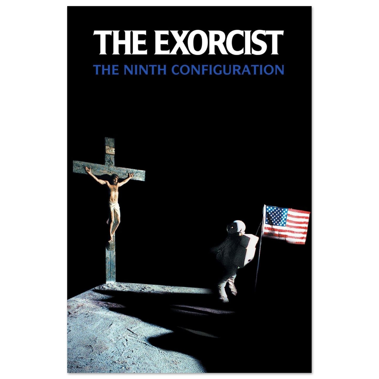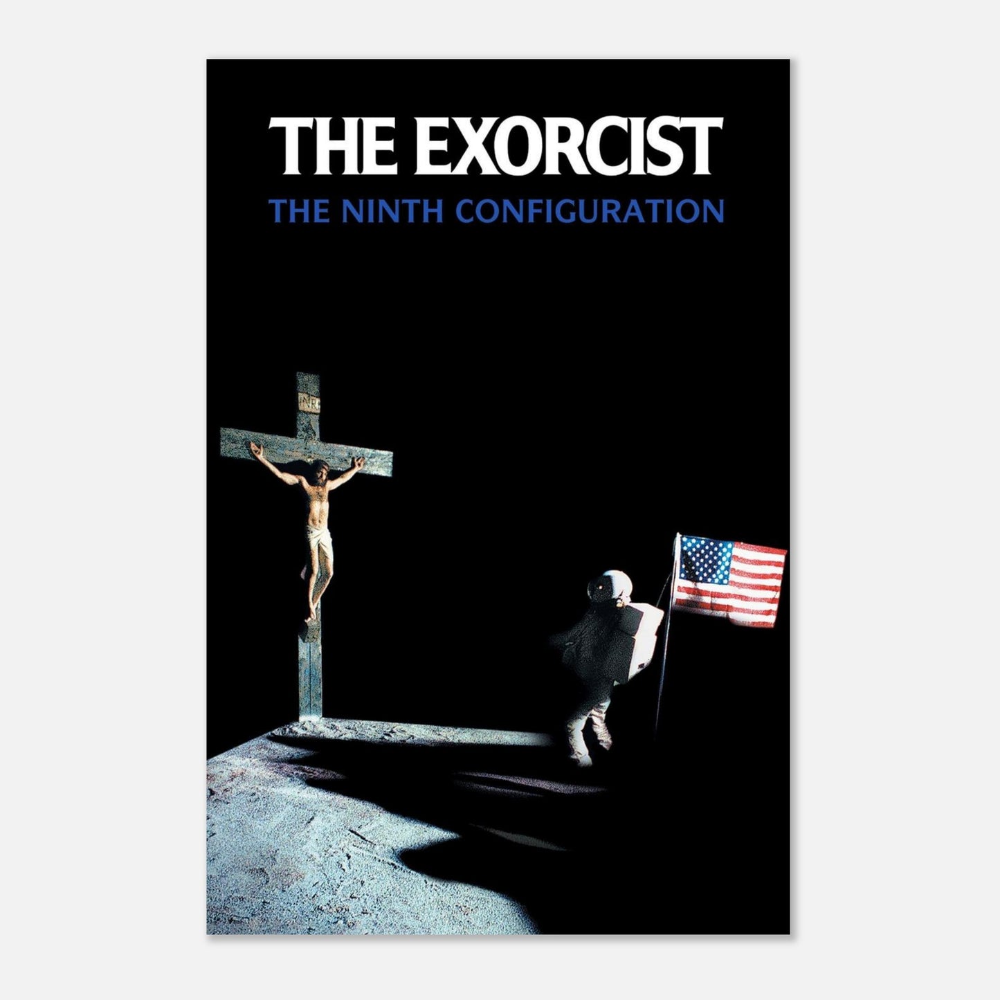 A haunting movie poster design featuring a dramatic contrast of religious symbolism and space exploration. A large crucifix casts shadows against a dark background, while an astronaut plants an American flag on what appears to be lunar surface. The stark composition creates an eerie, supernatural atmosphere that blends faith and science fiction