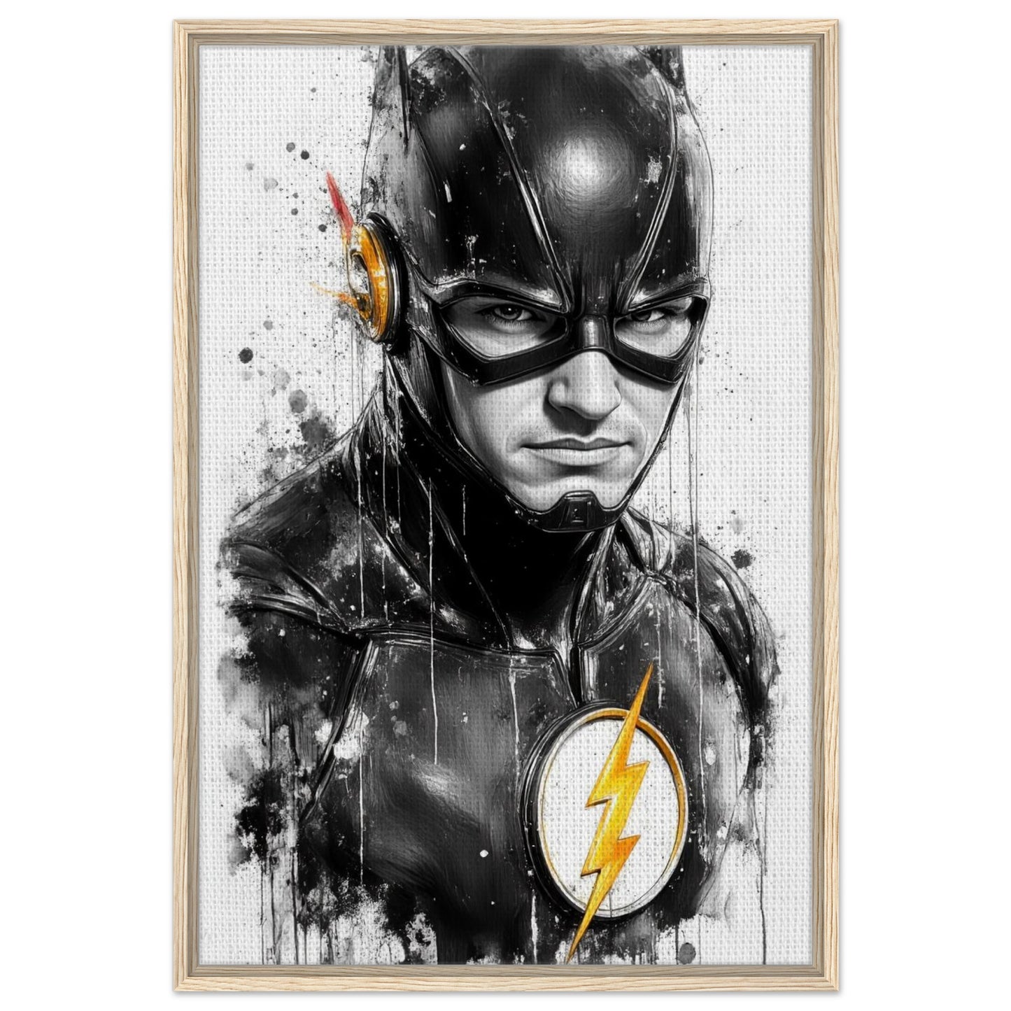 Dramatic watercolor-style portrait featuring the iconic speedster in black and yellow tones. Striking artistic interpretation with paint drip effects and bold lightning bolt emblem. Moody and atmospheric with intense contrast between light and dark elements, perfect for fans of contemporary superhero art