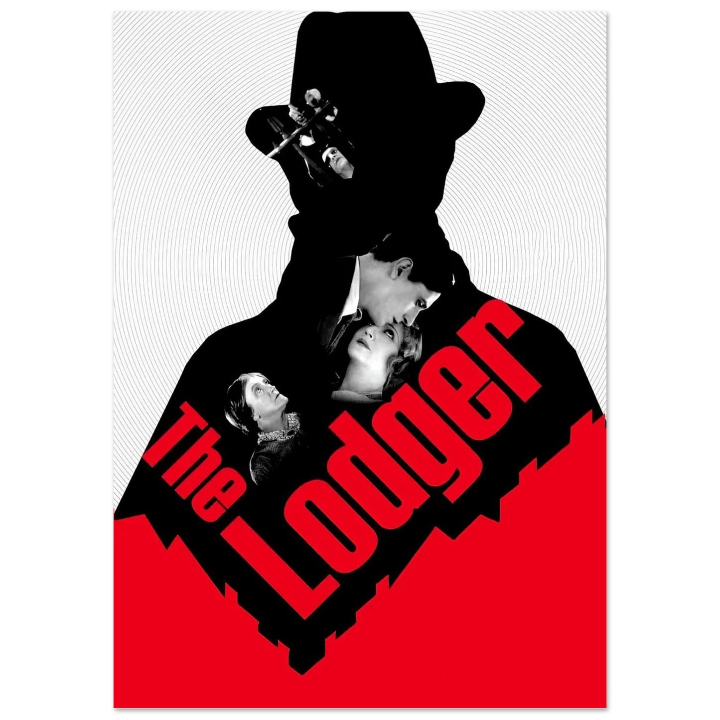 Striking black, white and red minimalist design featuring a dramatic silhouette in a fedora hat against a stark background. Bold typography and high contrast imagery creates a classic film noir atmosphere reminiscent of vintage 1920s cinema. The composition masterfully combines shadows and negative space for a haunting thriller aesthetic