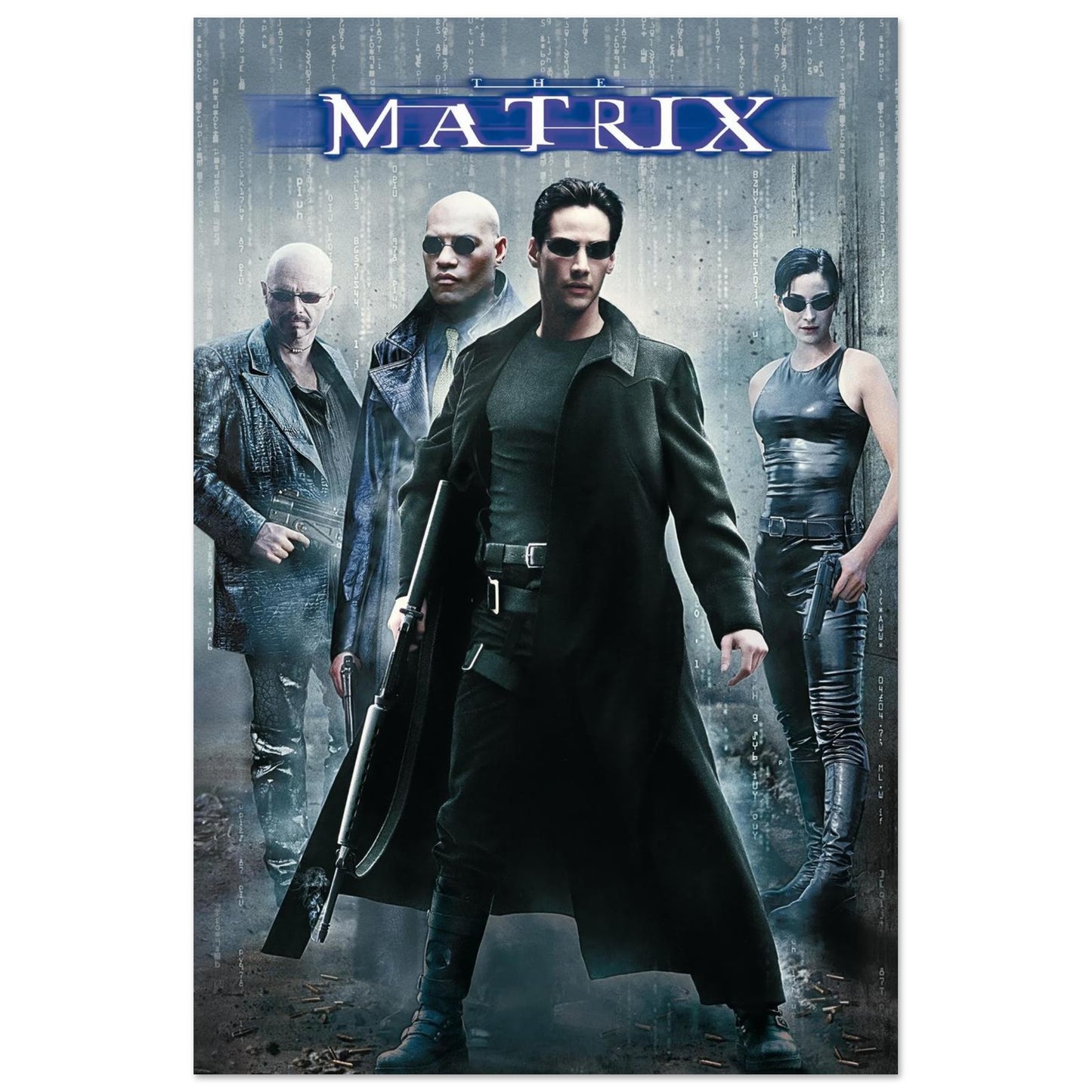 Iconic sci-fi movie poster featuring a dramatic cyberpunk aesthetic with digital rain effects and noir styling. Set against a moody blue-gray backdrop, the composition showcases figures in striking black leather attire. The design captures the revolutionary blend of dystopian future and martial arts action that defined the era