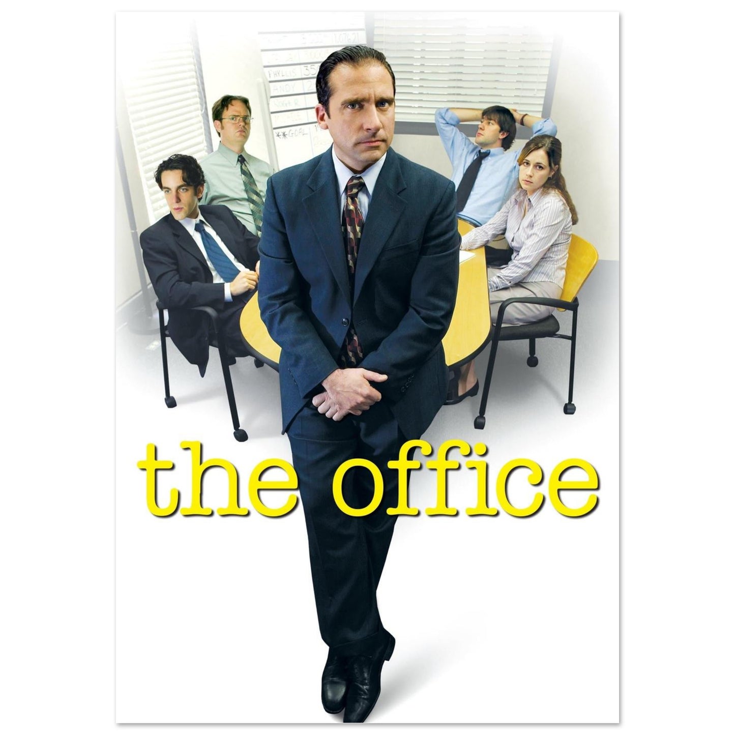 A nostalgic promotional poster design featuring a workplace setting with a corporate atmosphere. The yellow text contrasts boldly against the clean white background, while business-attired figures create a classic office environment composition. Perfect for fans of the beloved comedy series