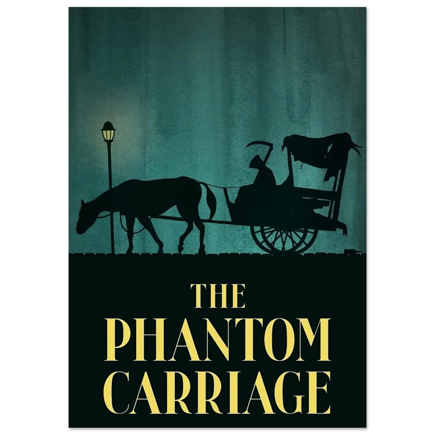 A haunting silhouette design featuring a horse-drawn carriage with a grim reaper figure, set against a moody teal background. The atmospheric scene is illuminated by a single street lamp, creating an eerie vintage horror aesthetic. Bold yellow typography adds a striking contrast to the dark, mysterious composition