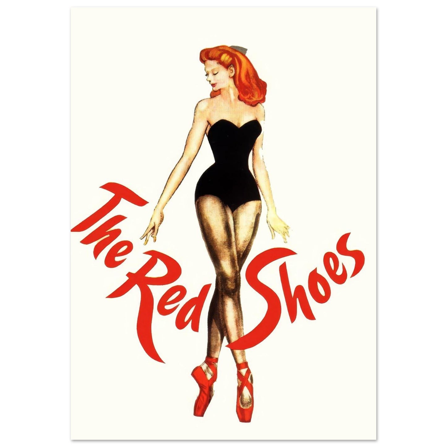 Elegant vintage film poster artwork featuring a graceful figure in a black leotard and striking red ballet shoes. The dramatic red typography and classic illustration style capture the golden age of cinema. Perfect for dance enthusiasts and vintage movie lovers