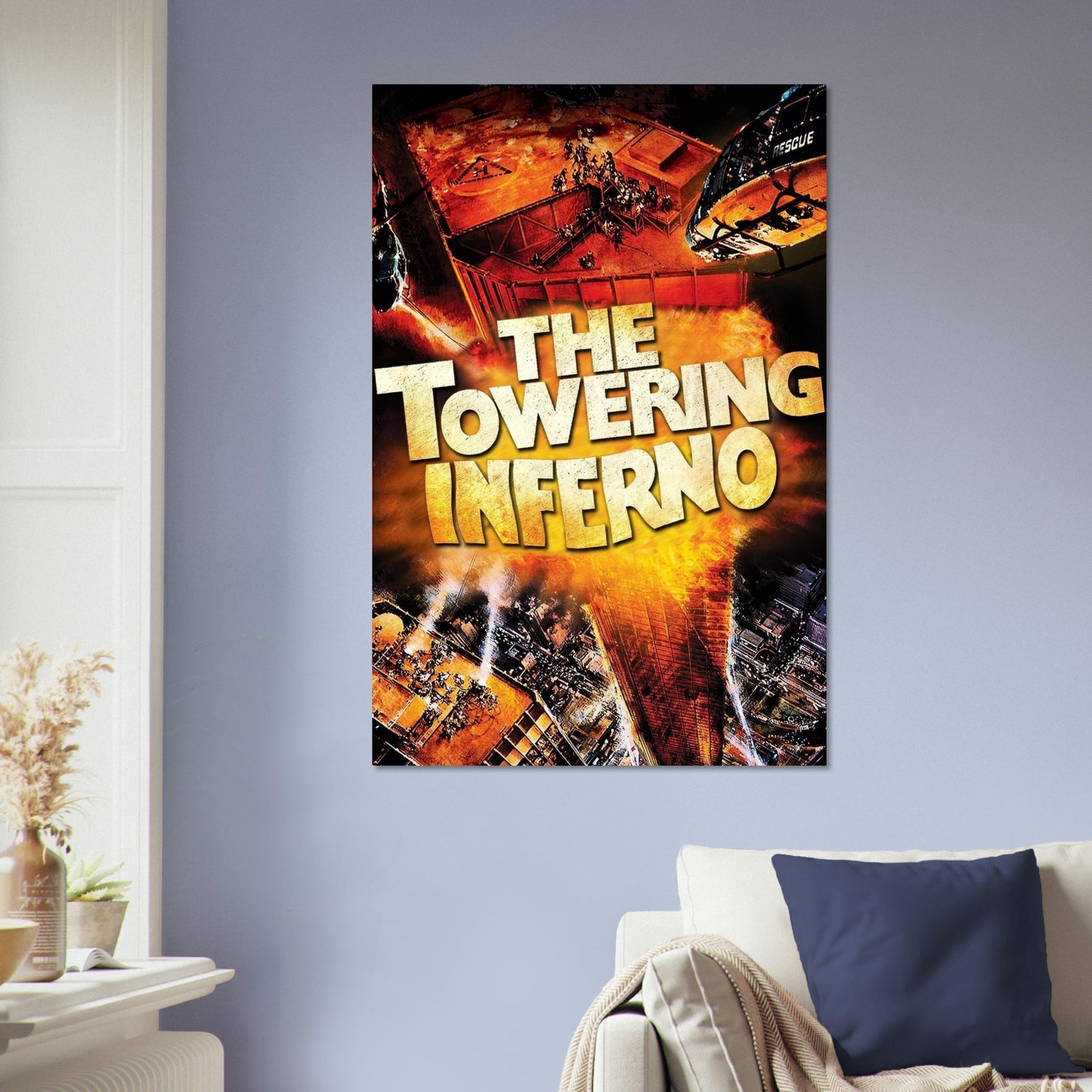 Dramatic movie poster artwork featuring an intense orange and red color palette depicting a burning skyscraper. The iconic typography emerges from explosive flames while helicopter rescue scenes create a sense of urgency and danger. This striking disaster film artwork captures the essence of 70s Hollywood spectacle