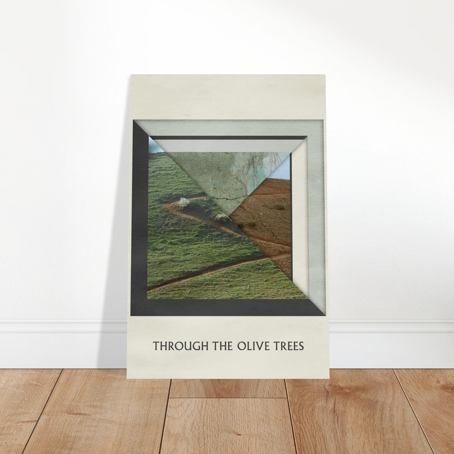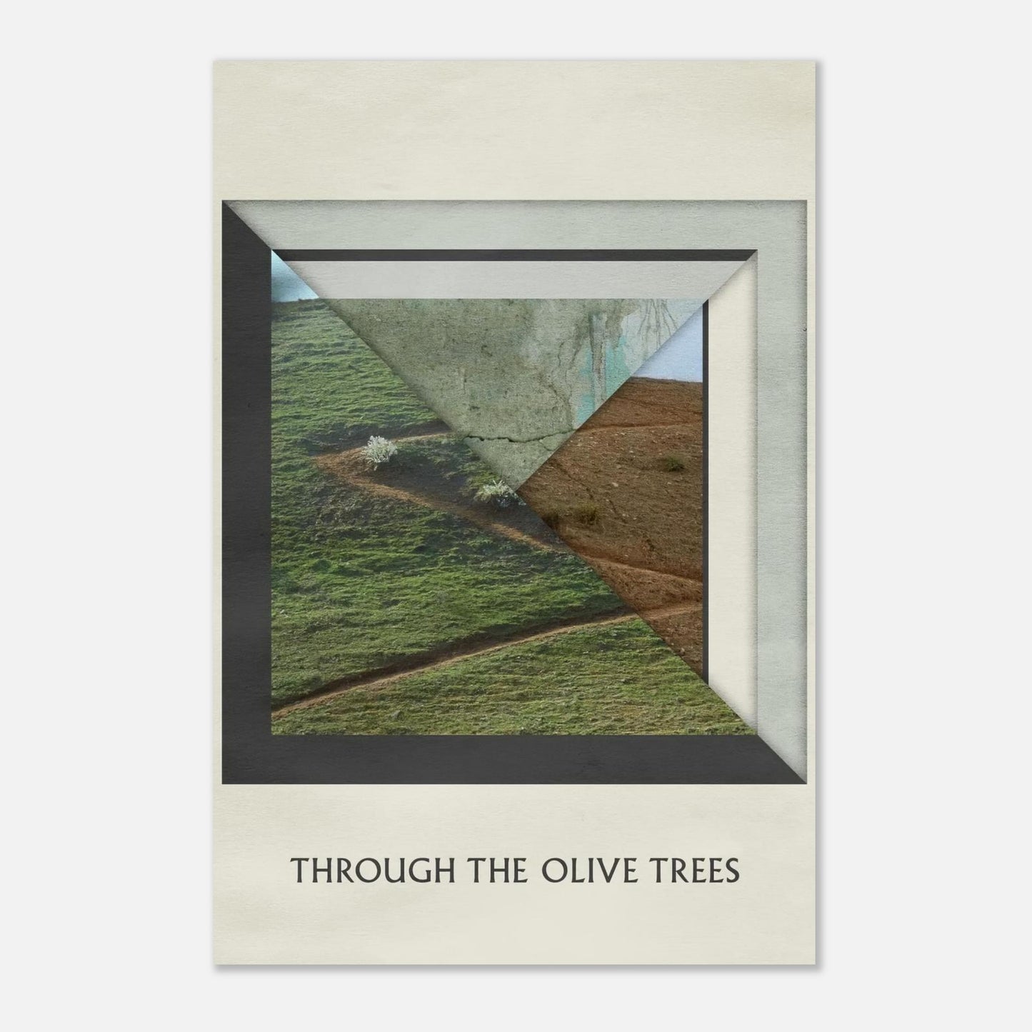 A striking minimalist movie poster design featuring a geometric framed view of rolling hillsides and olive groves. The composition creates an artistic interplay between natural landscape and angular modern framing, with rich earth tones and verdant greens contrasting against stark white borders
