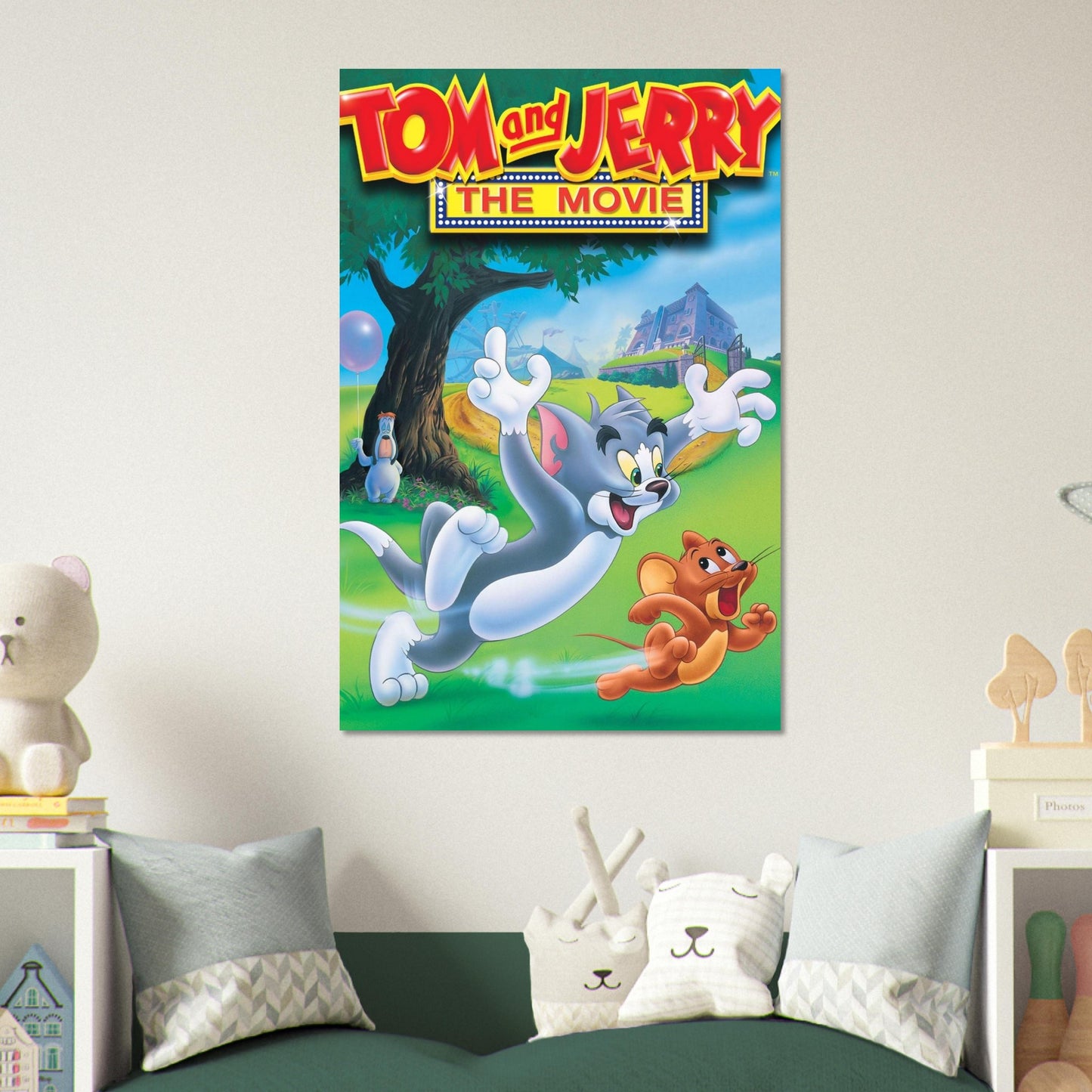 Vibrant animated movie poster featuring the beloved cat and mouse duo in a playful chase scene. Set against a lush green landscape with a dreamy blue sky backdrop, this iconic artwork captures the classic slapstick comedy and endless energy of Tom and Jerry's legendary rivalry. Perfect nostalgic wall art for animation fans and collectors.