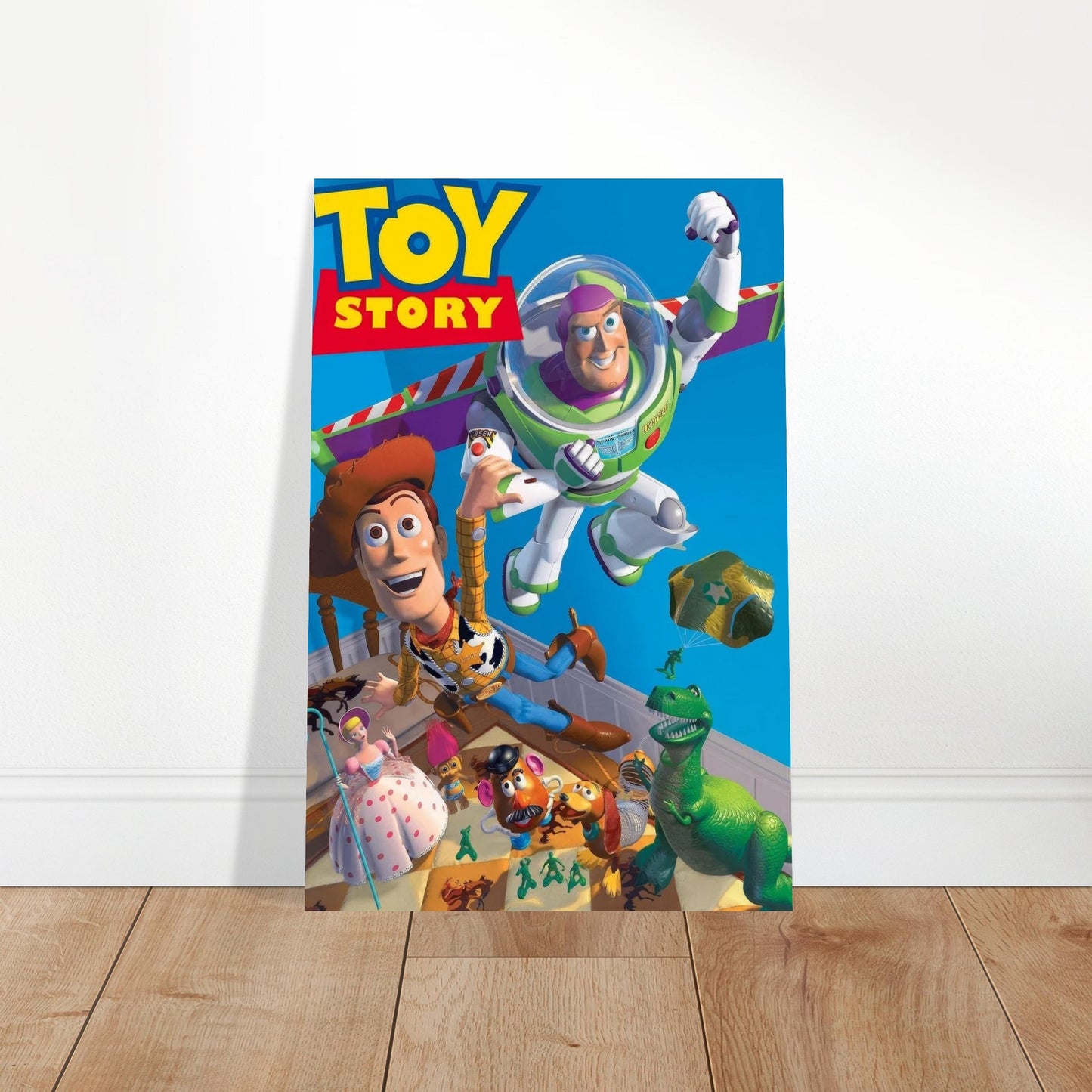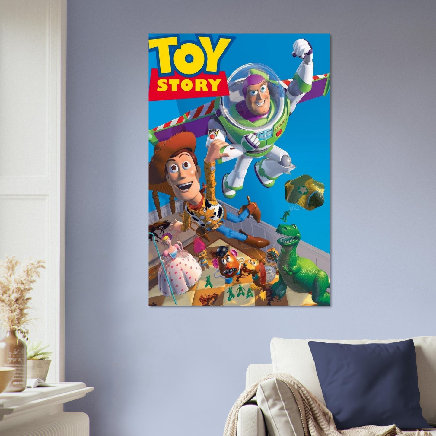 Vibrant animated movie poster featuring beloved toys on a bright blue background. Dynamic composition shows characters in action with Buzz Lightyear soaring through the air. Rich colors and classic animation style capture the magic and whimsy of this groundbreaking film. Perfect for kids' rooms or animation enthusiasts