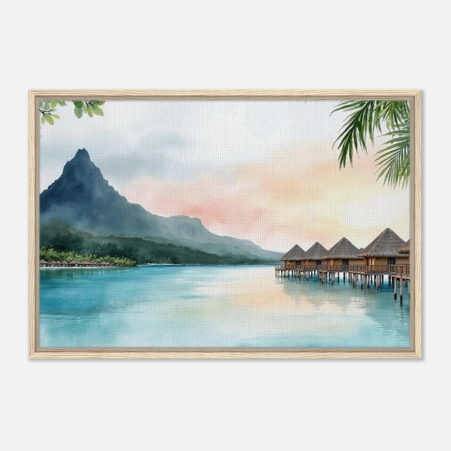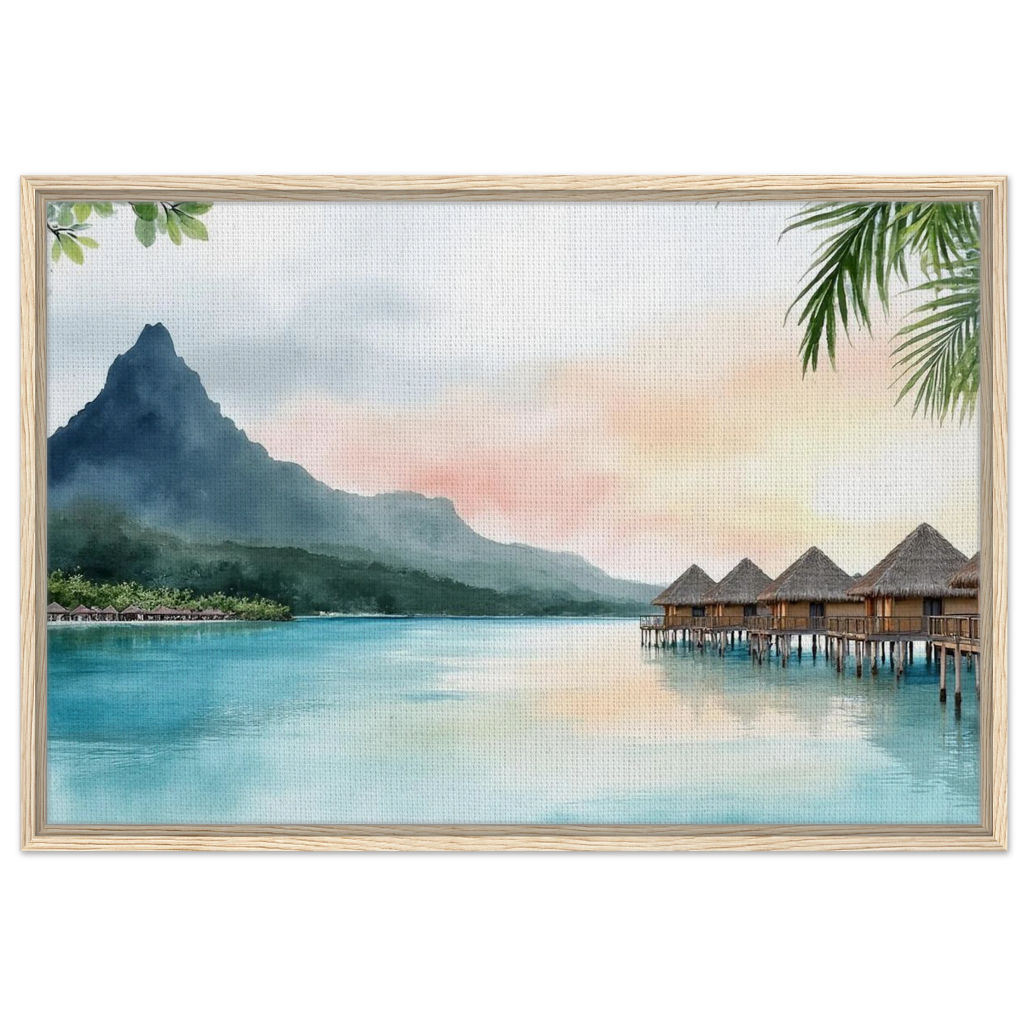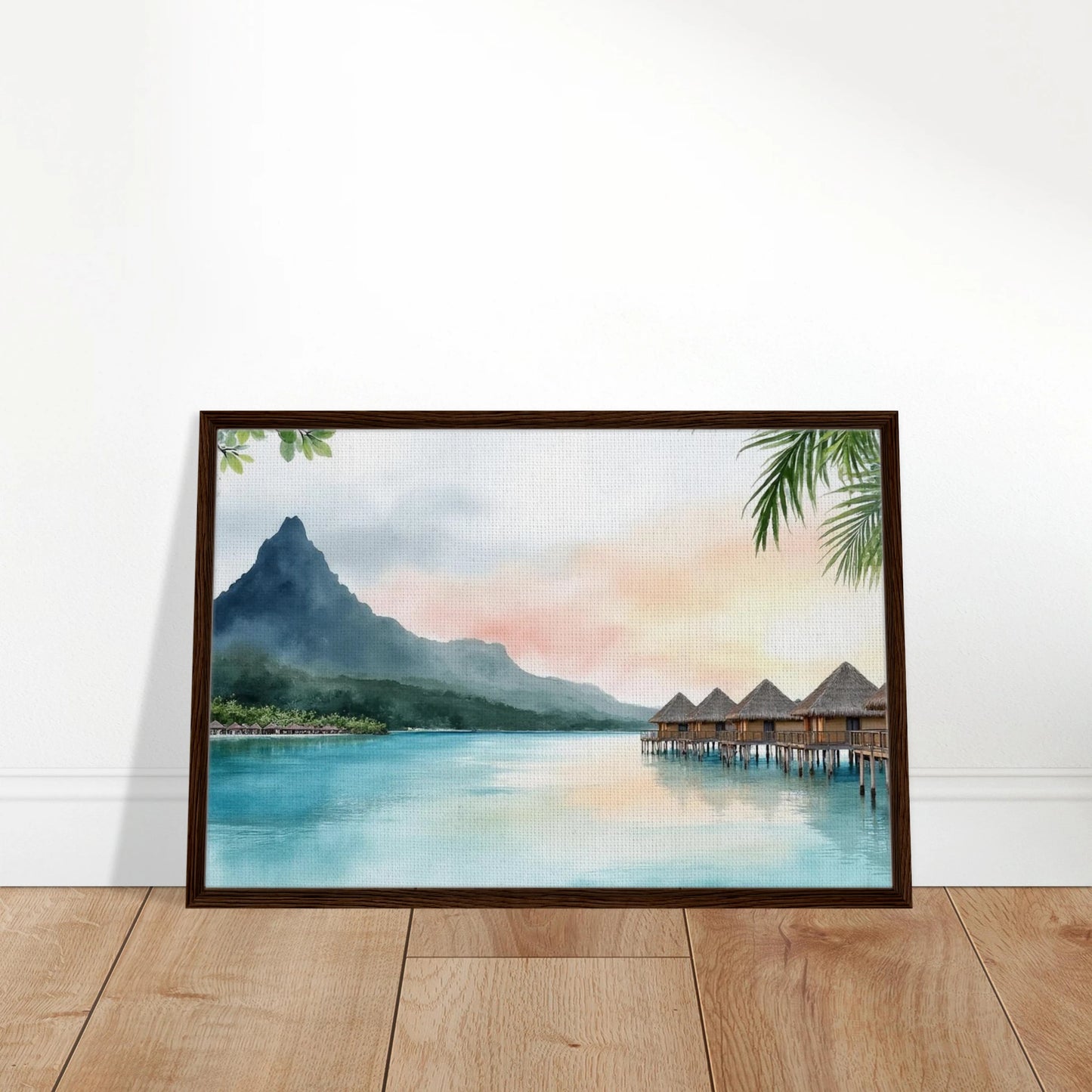 A serene watercolor painting capturing the iconic overwater bungalows of Bora Bora at sunset. Tranquil turquoise waters reflect the pastel sky, while Mount Otemanu rises majestically in the background. Lush tropical foliage frames the dreamy island scene, creating a perfect escape into paradise